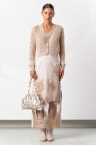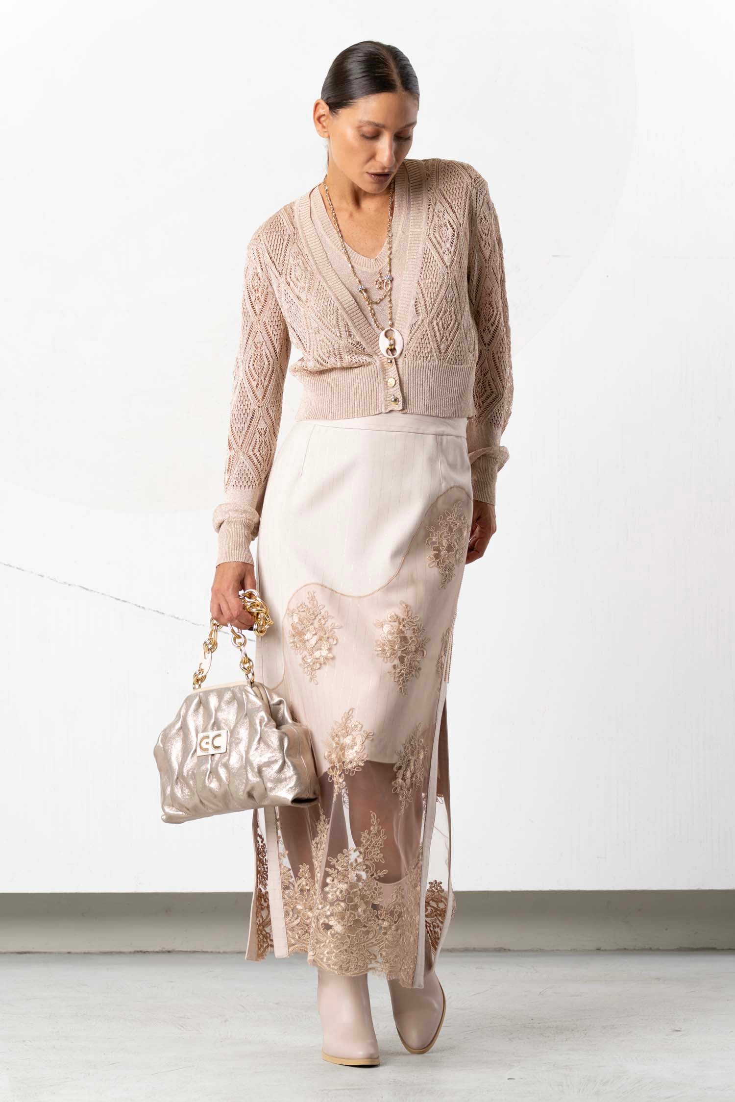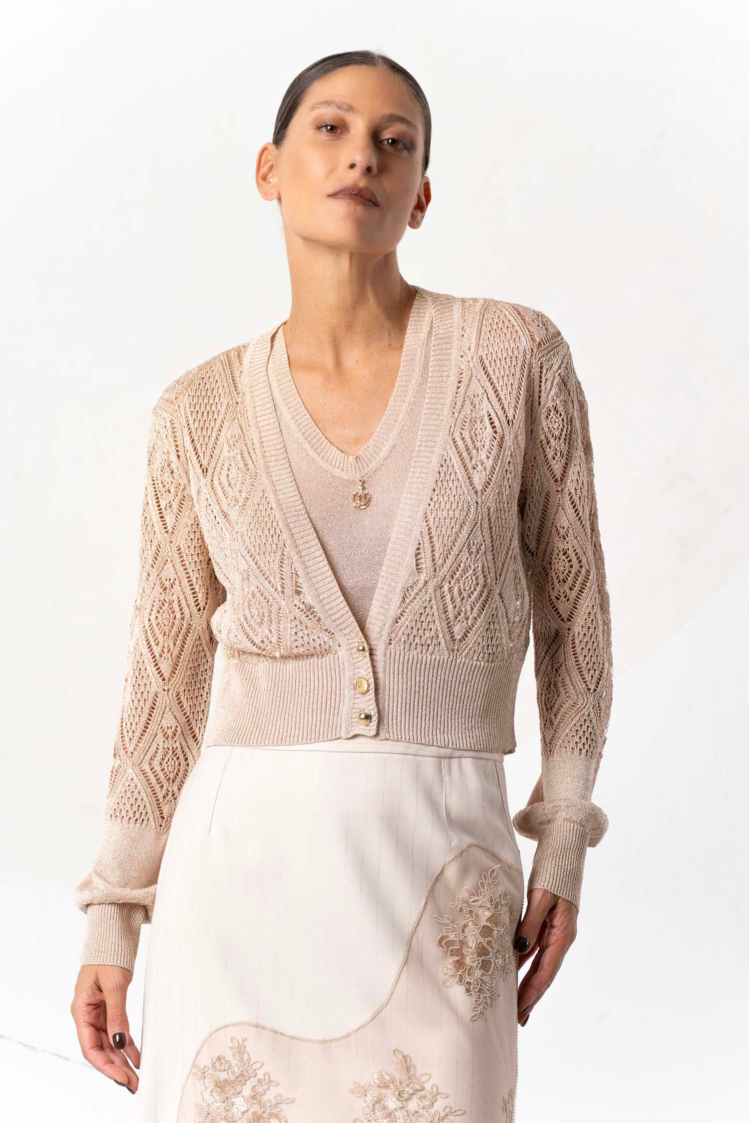 This long-sleeved cardigan impresses with its deep neckline and elegant light brown hue, which is incredibly versatile. The high-quality material ensures comfortable wear and adds a stylish touch to any look. Ideal for sophisticated outfits with a modern, casual flair.