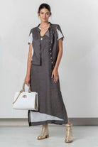 Ärmelloses Leinenkleid mit Spitzeneinsatz in Grau & Off-White