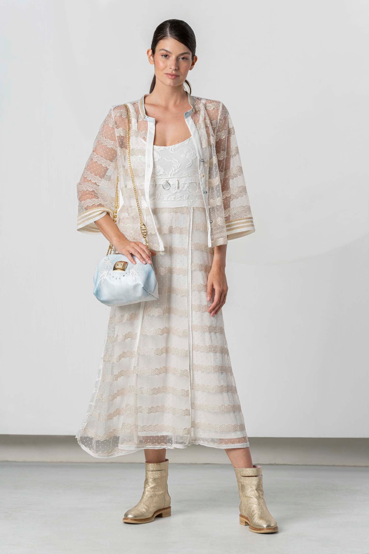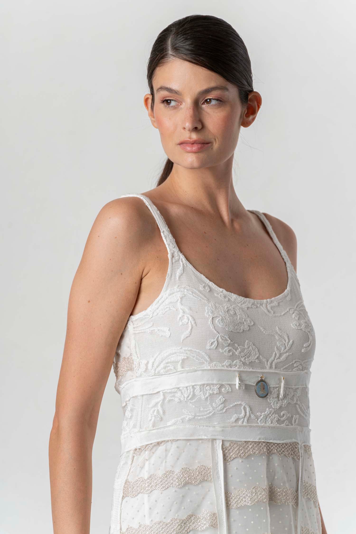 Dieses feminine Kleid besticht durch sein leichtes, fließendes Design und die feinen Spitzen- und Tülldetails. Die schmalen Träger und das dekorative Detail in der Taille verleihen dem Kleid eine elegante Silhouette. Der luftige Rock in Midi-Länge sorgt für eine romantische Ausstrahlung und angenehmen Tragekomfort. Ideal für stilvolle Sommerlooks und besondere Anlässe.