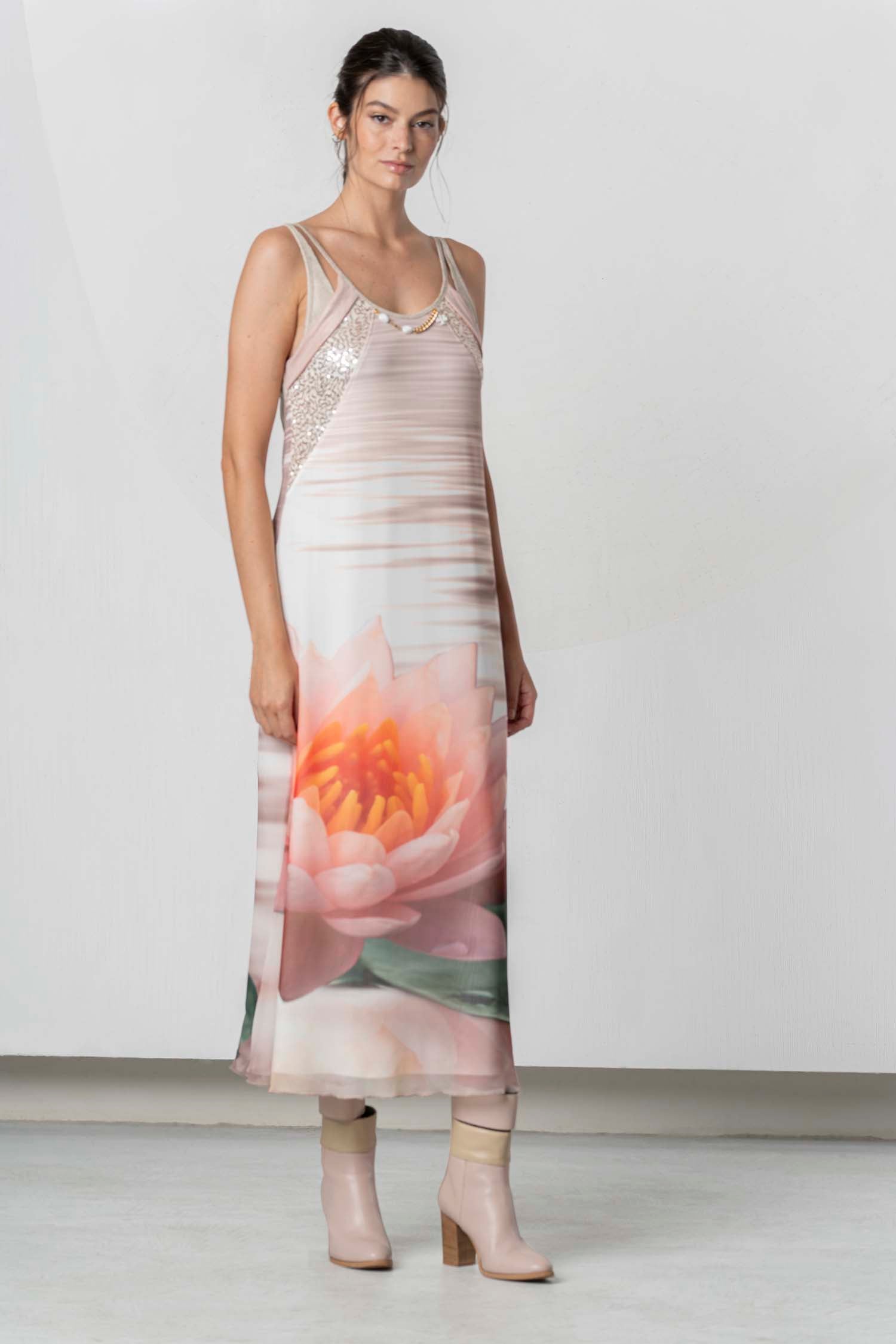 Fließendes Maxikleid mit feinen Trägern und romantischem Blütenprint. Der leichte, weich fallende Stoff sorgt für ein angenehmes Tragegefühl und eine feminine Silhouette. Dezente Details im Brustbereich und der sanfte Farbverlauf verleihen dem Modell eine elegante, sommerliche Ausstrahlung – perfekt für warme Tage und besondere Anlässe.