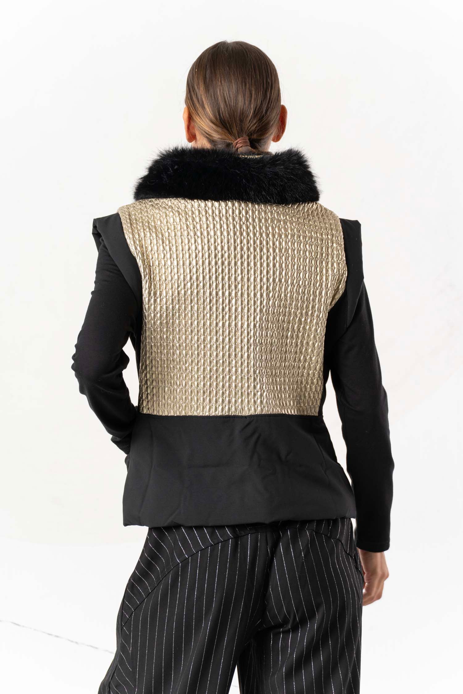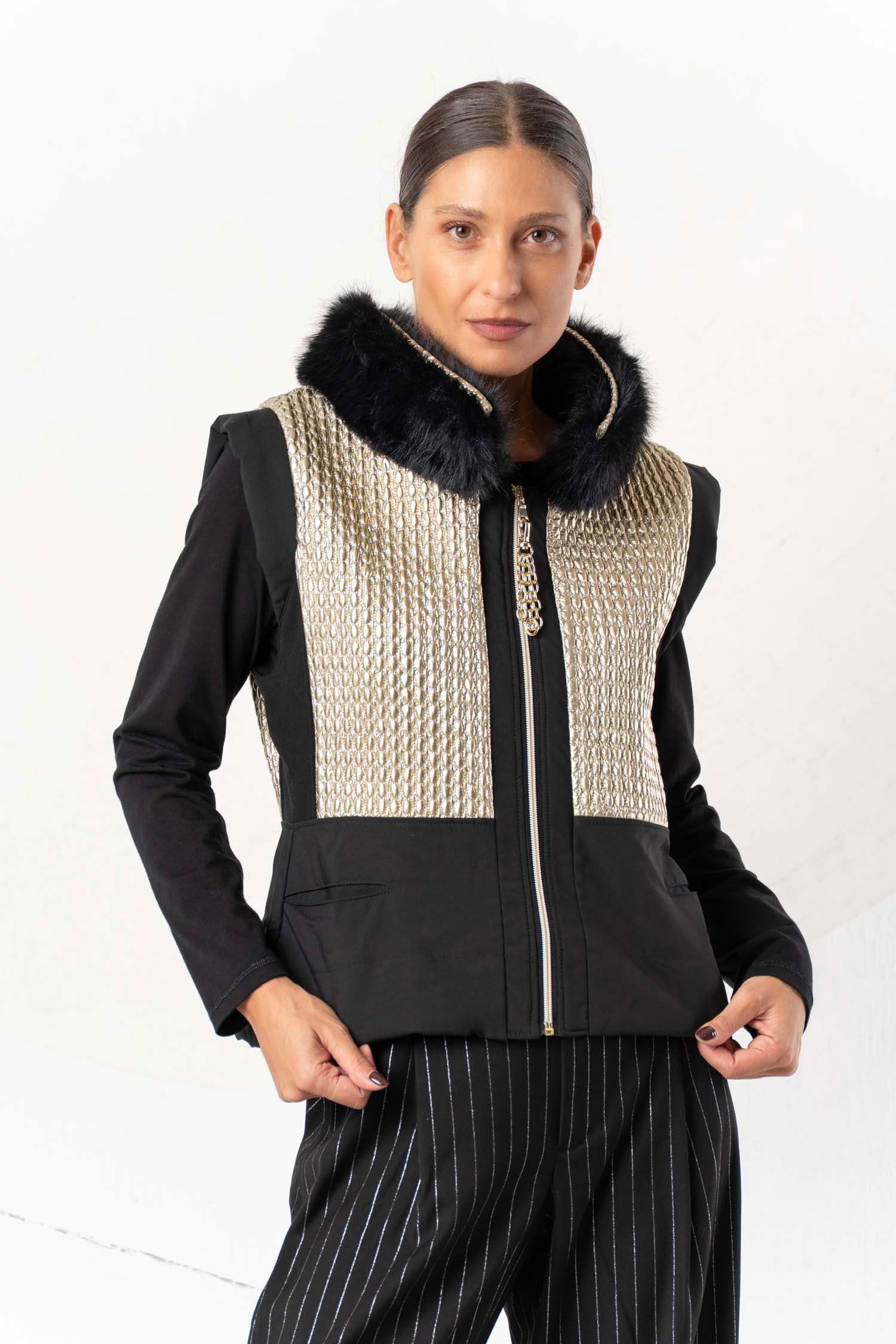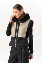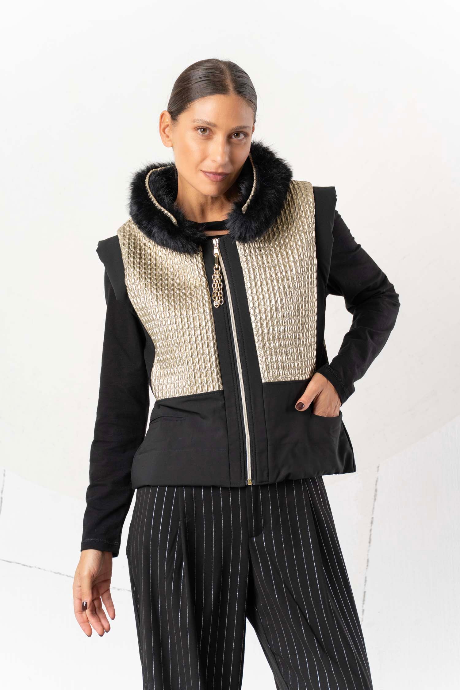 This stylish vest features an elegant fur collar and combines various high-quality fabrics into a harmonious composition. In attractive shades of gray and silver, it lends a contemporary and sophisticated touch to any outfit. Ideal for adding a stylish accent while providing warmth.