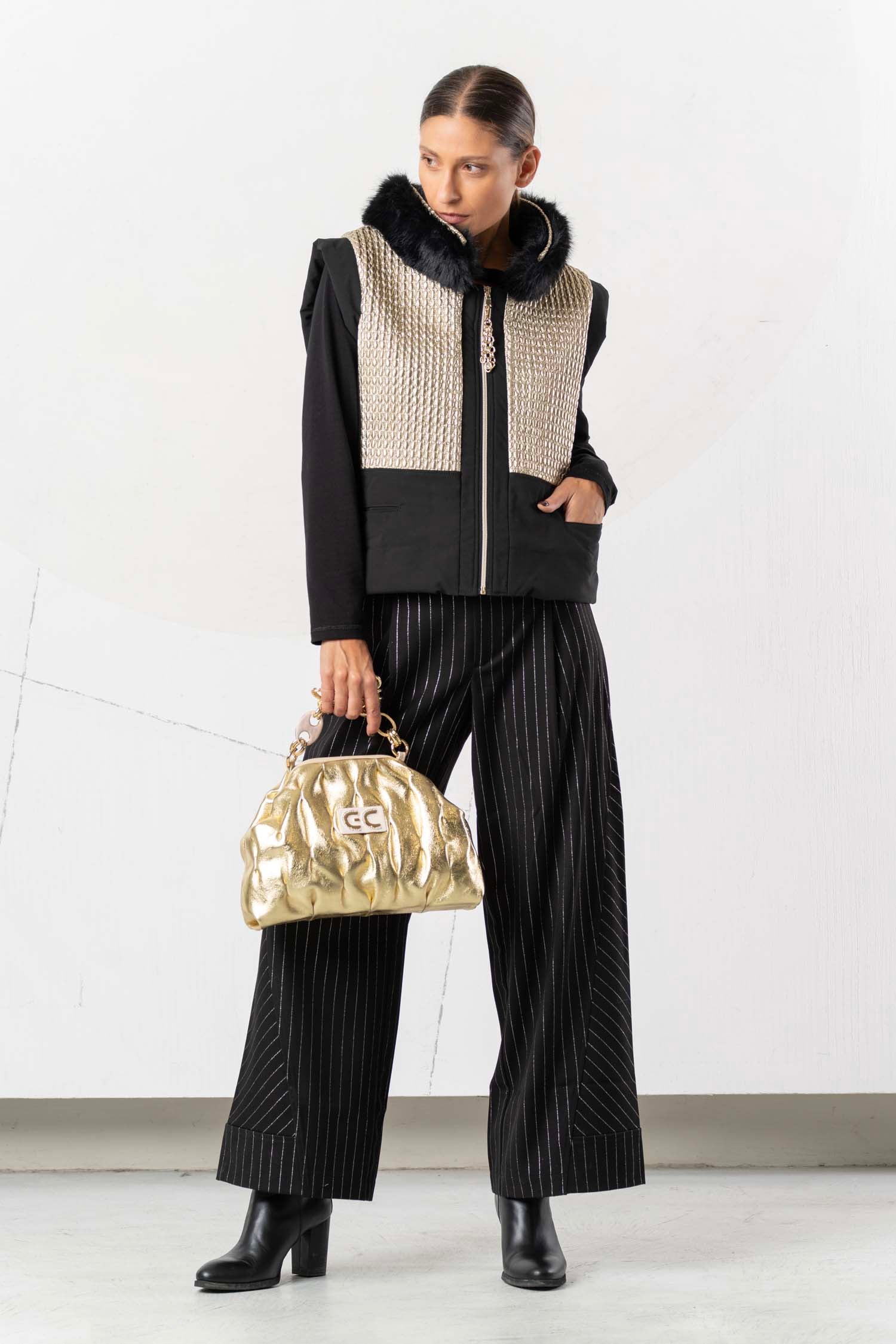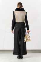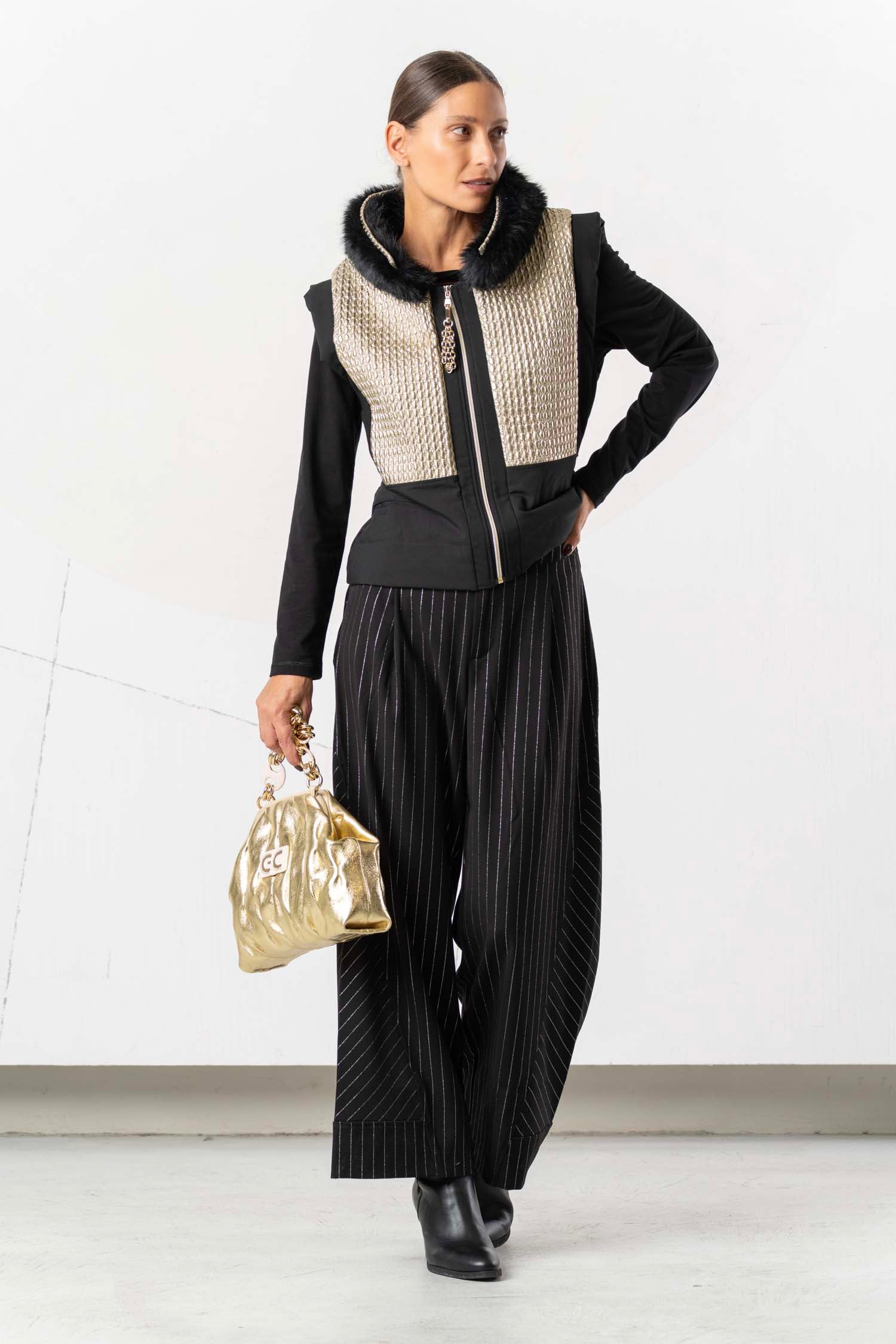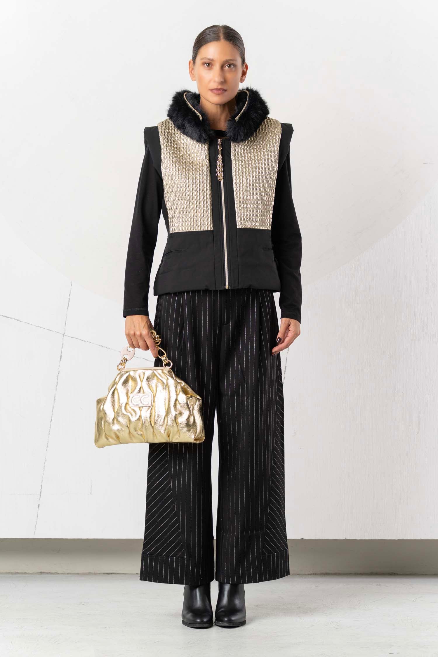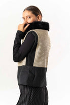 This stylish vest features an elegant fur collar and combines various high-quality fabrics into a harmonious composition. In attractive shades of gray and silver, it lends a contemporary and sophisticated touch to any outfit. Ideal for adding a stylish accent while providing warmth.