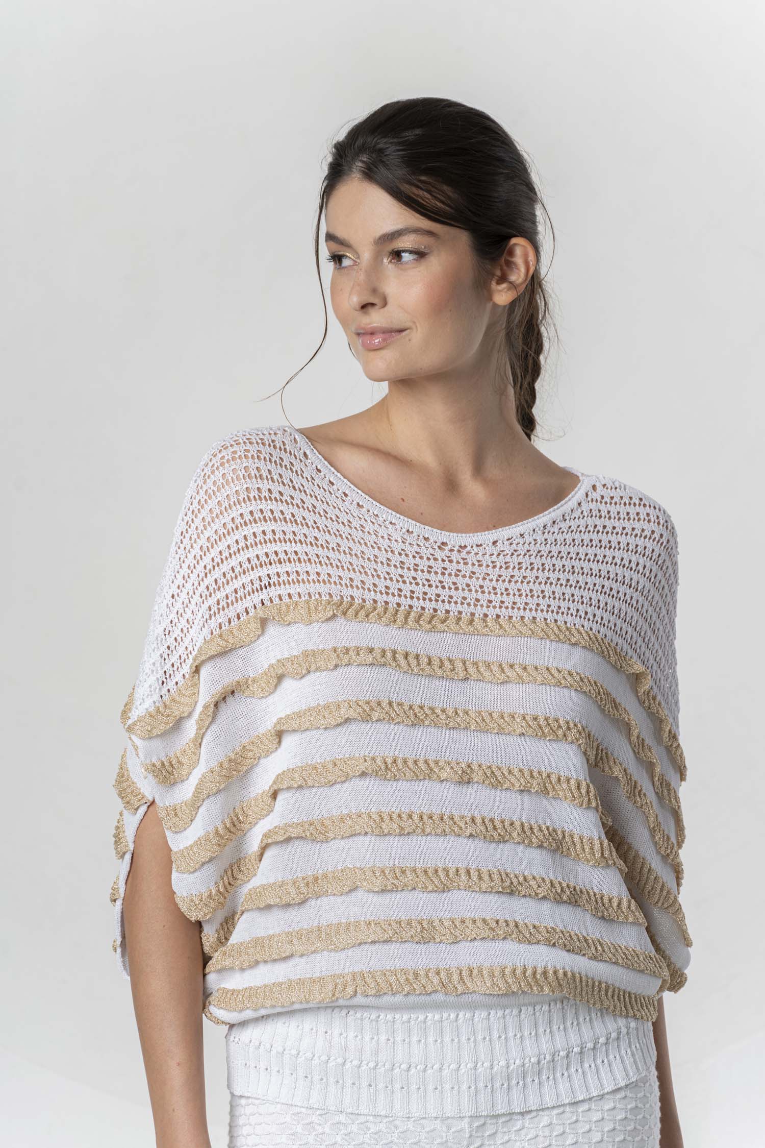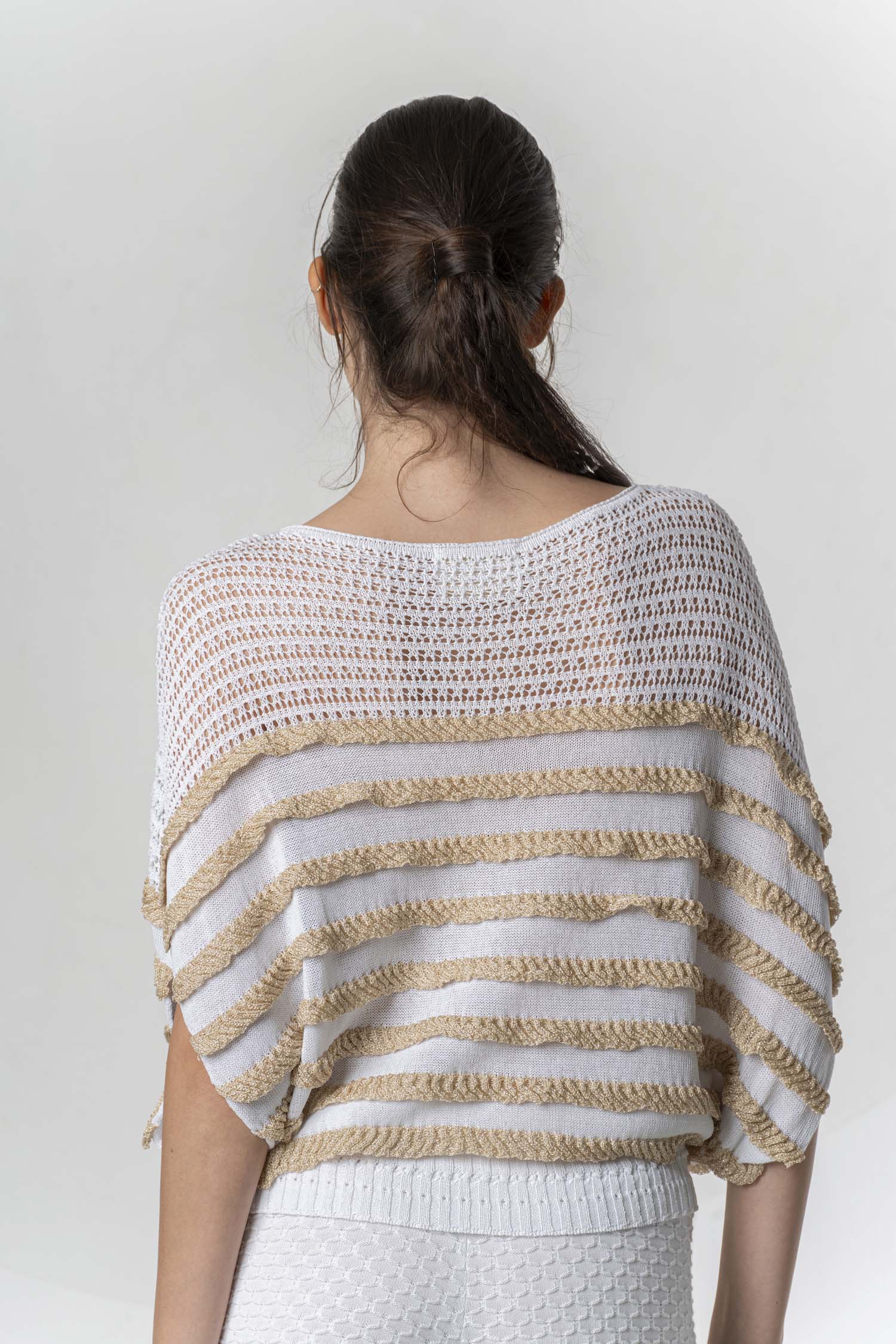Dieses leichte Stricktop kombiniert einen luftigen, offenen Netzstrick mit charmanten, gewellten Streifen in Beige und Weiß. Es überzeugt durch seinen lockeren, fließenden Schnitt, der sich perfekt für den Sommer eignet. Der weiche, elastische Bund und der V-Ausschnitt verleihen dem Top eine feminine Silhouette. Ideal zu Jeans oder luftigen Hosen für einen entspannten Look.
