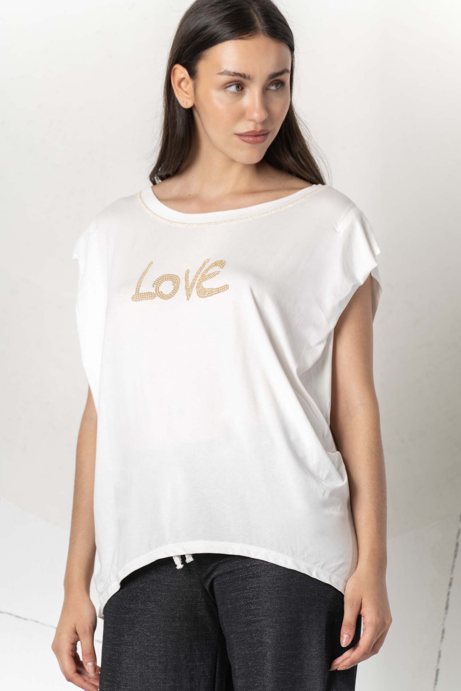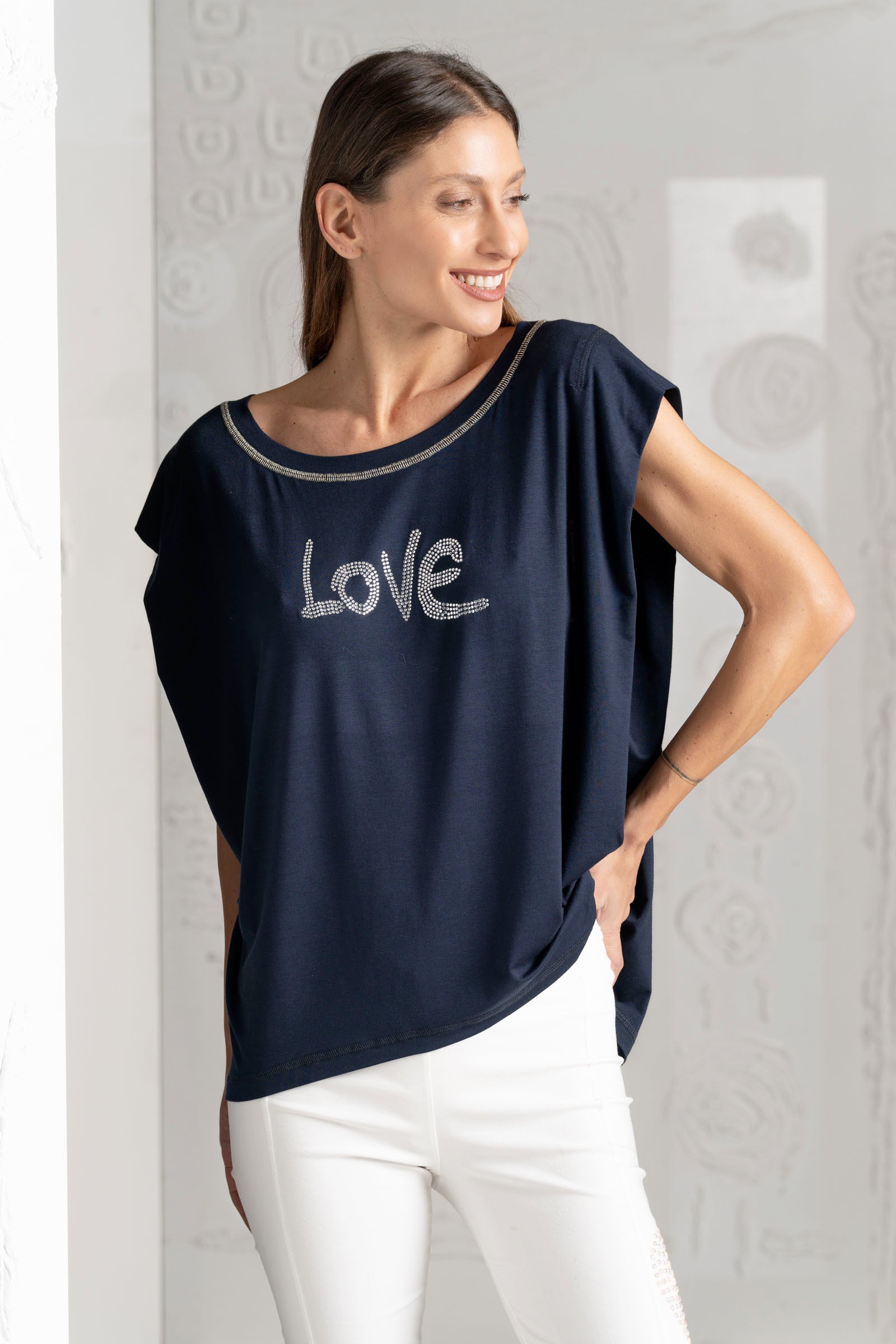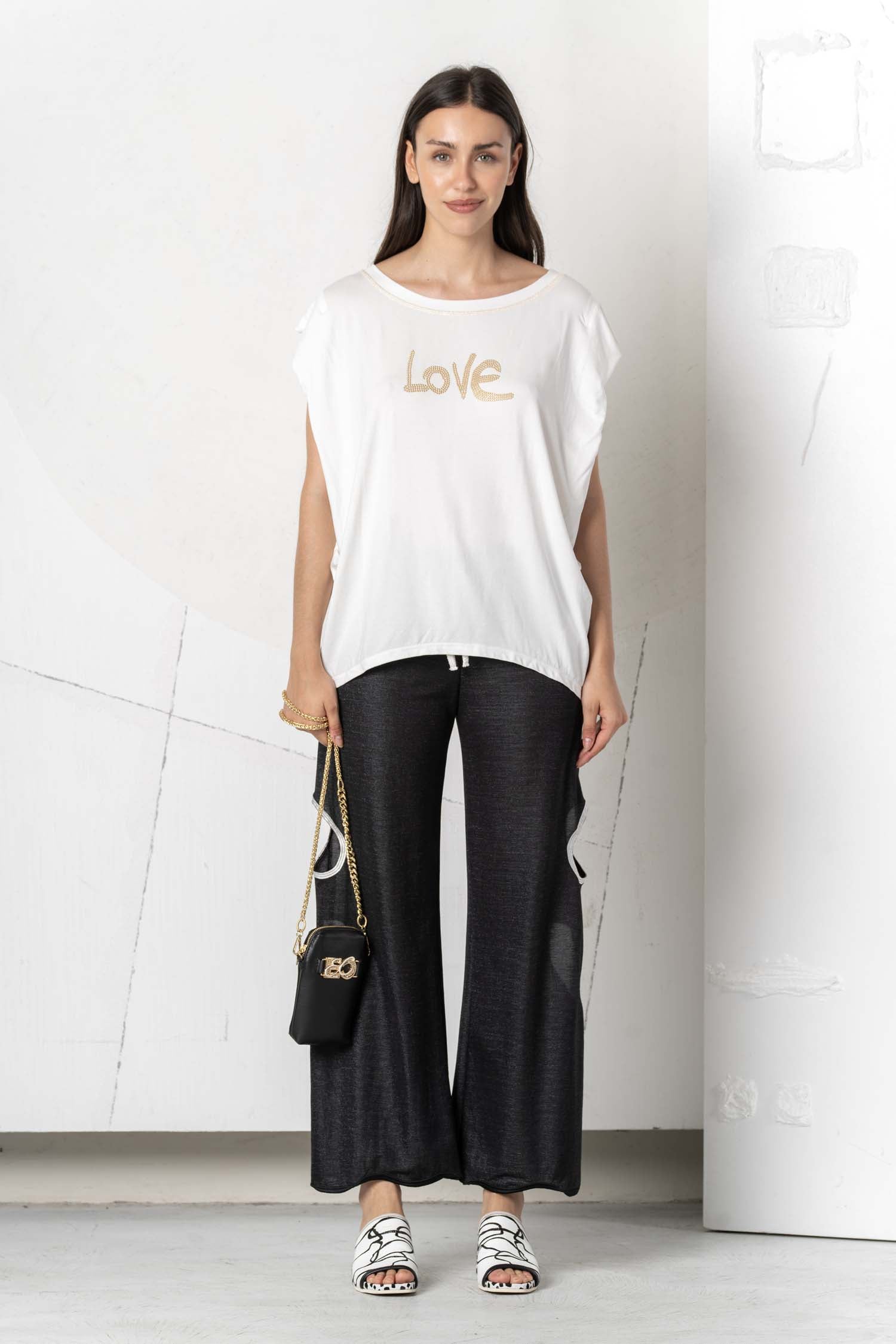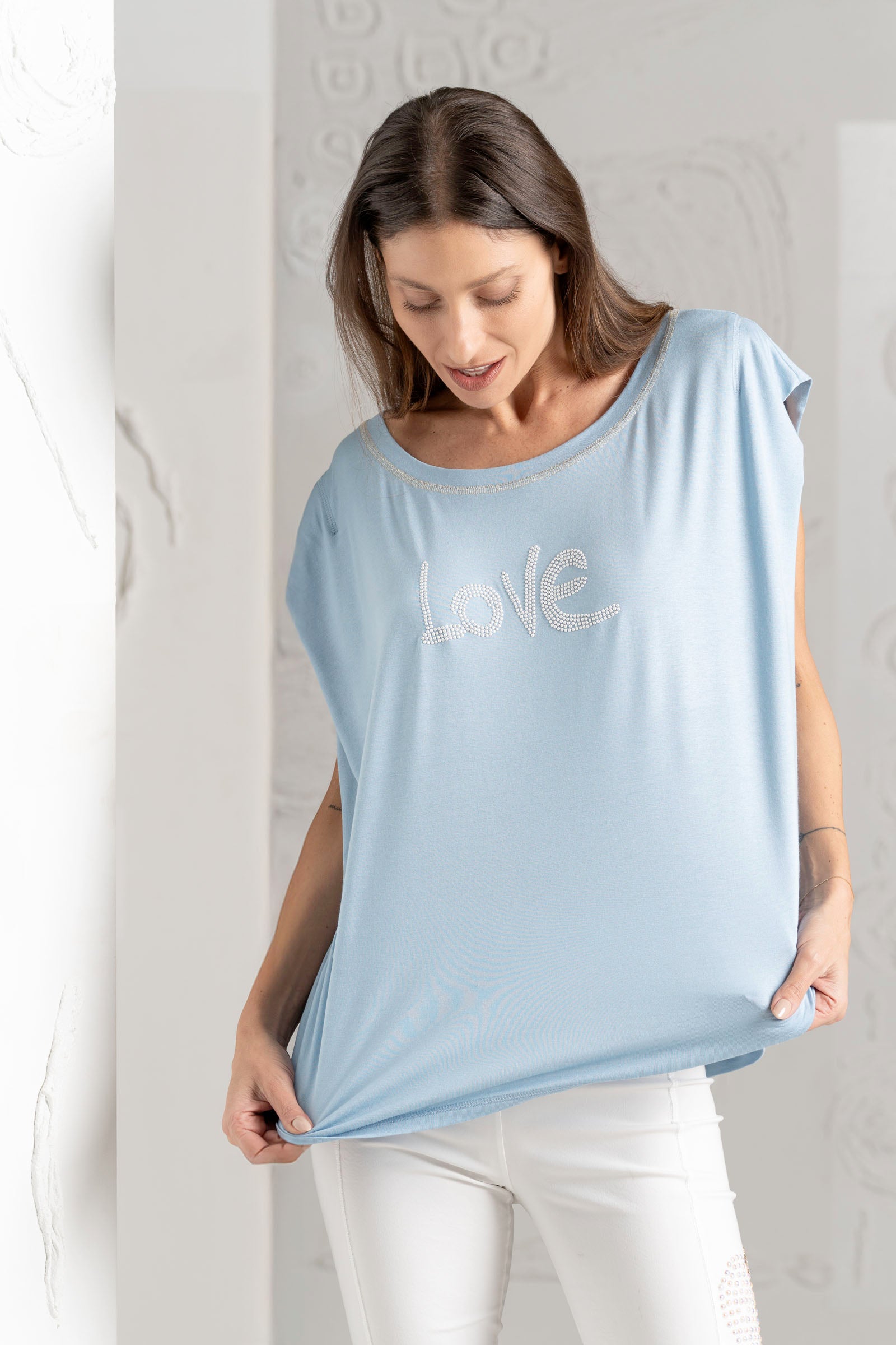 Discover the beautiful ELISA CAVALETTI T-shirt in white, light blue, and dark blue. Featuring the word "Love," this T-shirt is a real eye-catcher. Show your love of fashion and own this unique T-shirt, which impresses with its design and colors!
