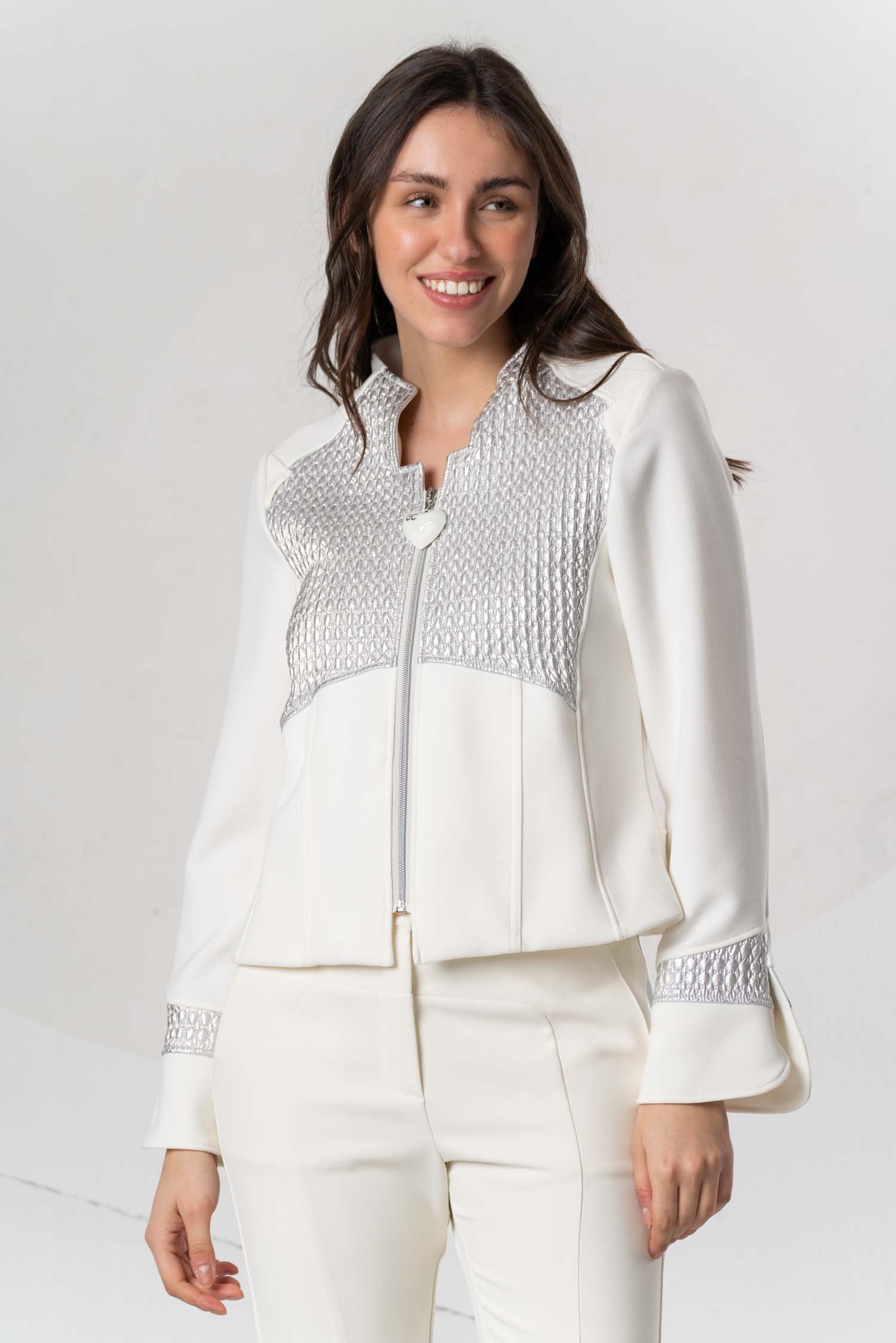 This stylish jacket comes in an elegant cream hue and is enhanced by subtle silver details. Its high-quality design combines timeless elegance with modern accents, making it versatile and ideal for sophisticated looks. The jacket offers a perfect balance between comfort and style, making it an indispensable companion for fashion-conscious wearers.