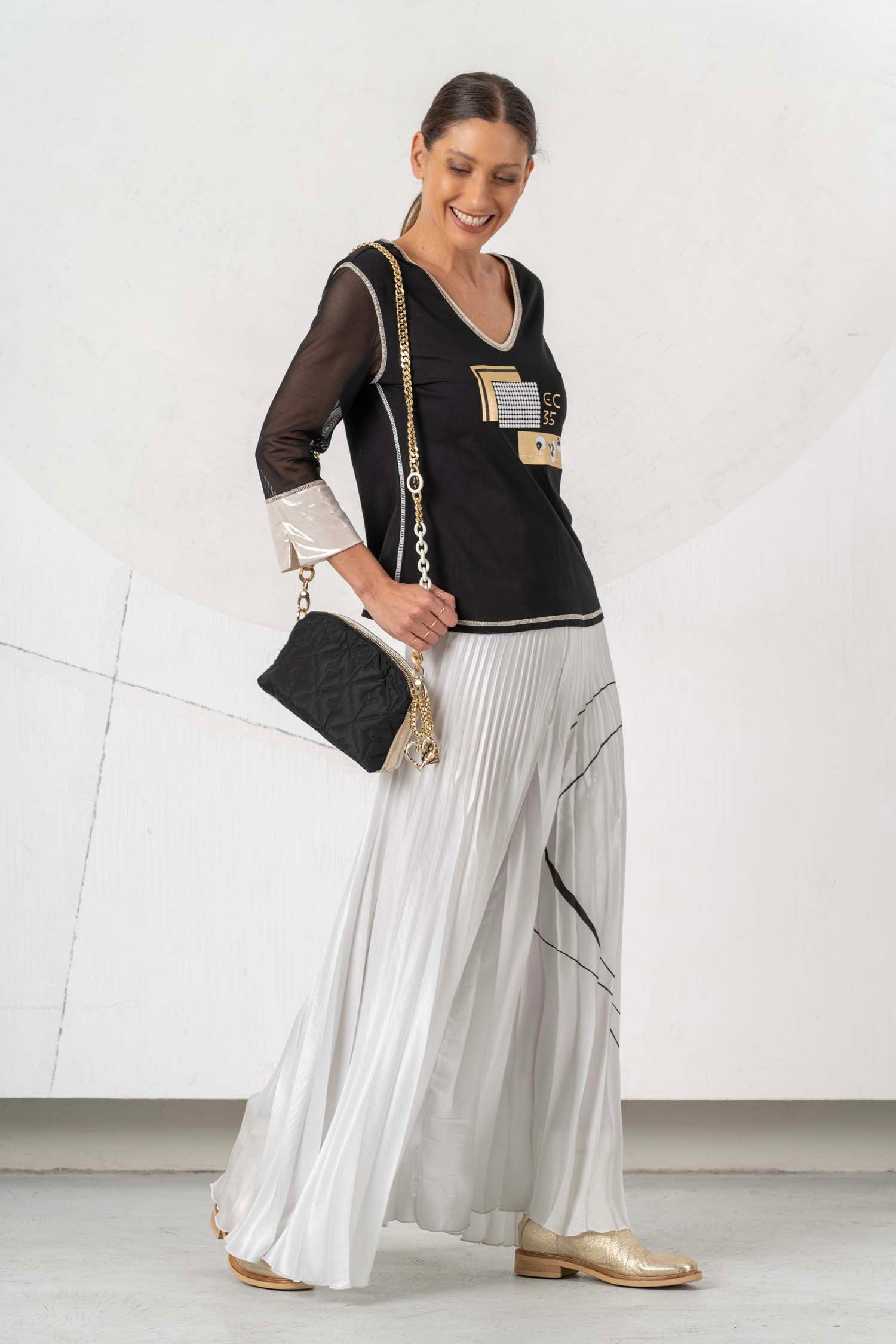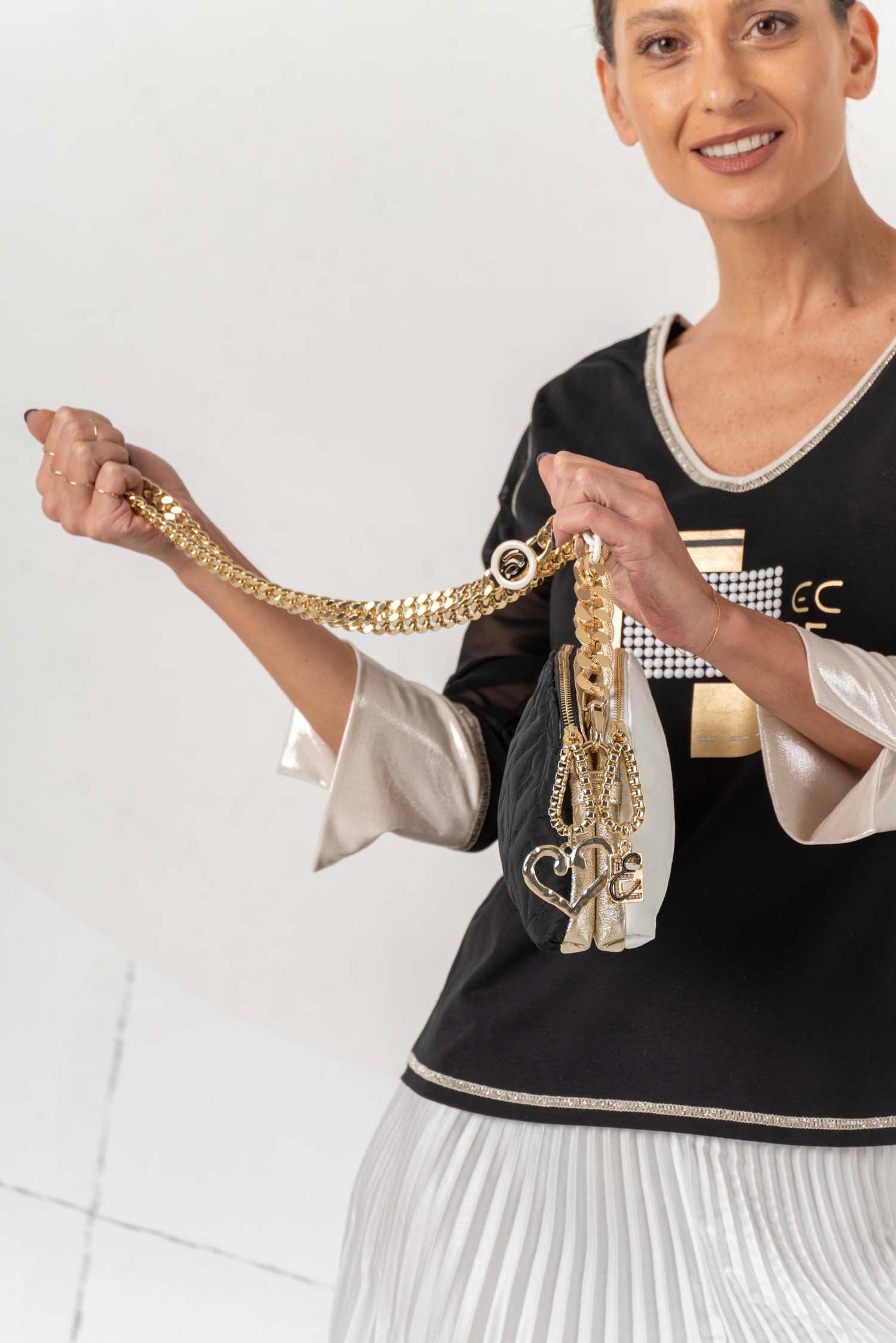Attract everyone's attention with the ELISA CAVALETTI handbag in black and white! Adorned with a gold chain and various embellishments, it's the perfect companion for any occasion. Complete your outfit with this stylish accessory and radiate confidence!