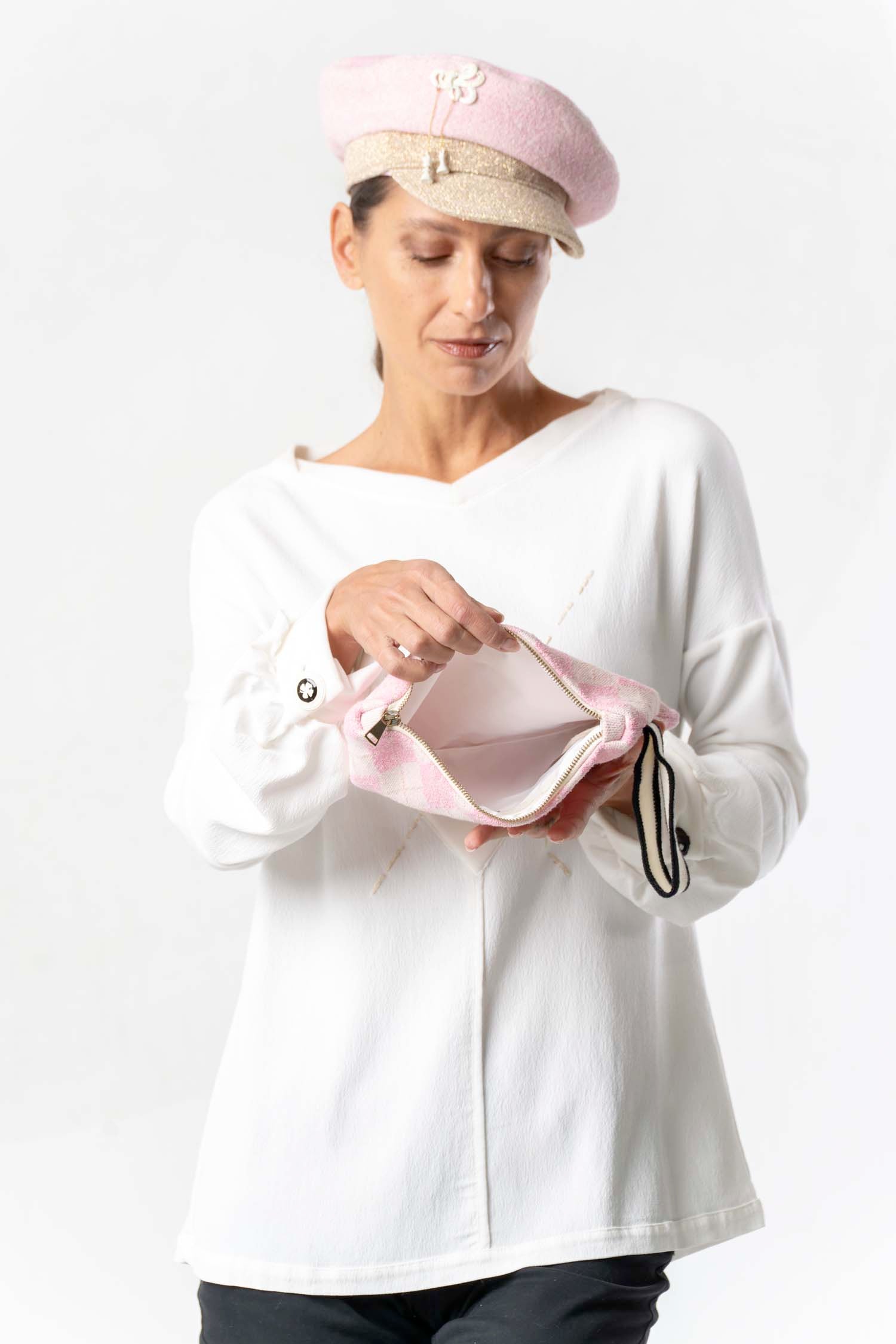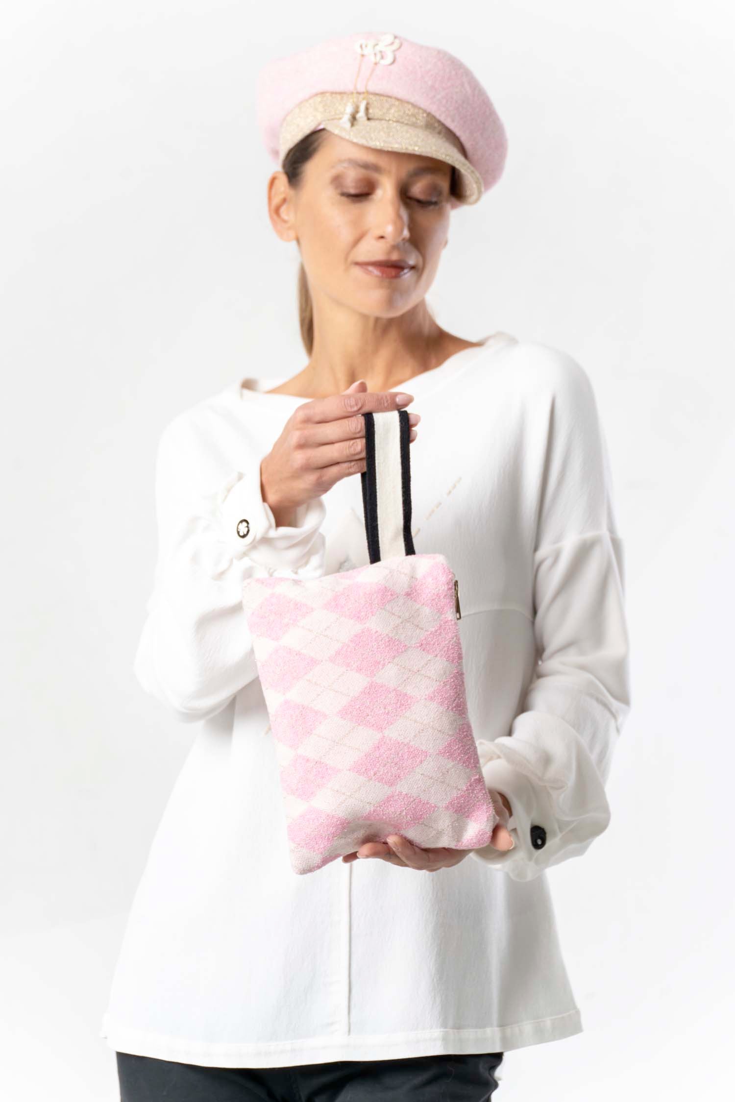 This charming clutch captivates with its enchanting pink and white diamond pattern – a timeless design that complements almost any outfit. Whether for a night out, special occasions, or everyday use, this elegant bag is your perfect companion. Compact and practical, it offers ample space for your essentials. A stylish accessory that effortlessly elevates your wardrobe and makes a great impression wherever you go.