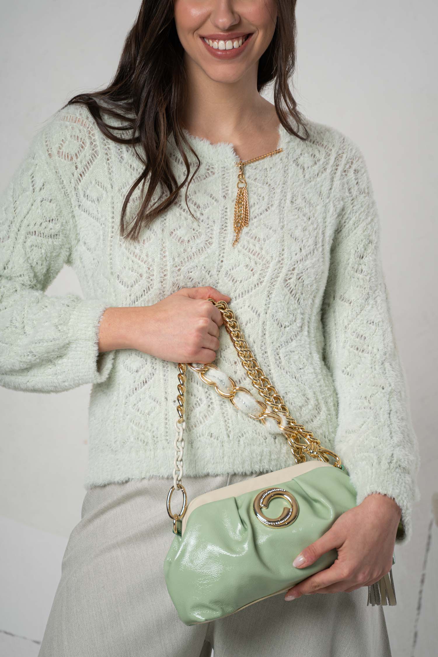 This small, stylish bag made of genuine leather impresses with its high-quality workmanship and timeless design. Available in fresh mint green and purple, it adds an elegant touch to any outfit. Ideal for everyday use, it offers enough space for essential items while maintaining a compact size.