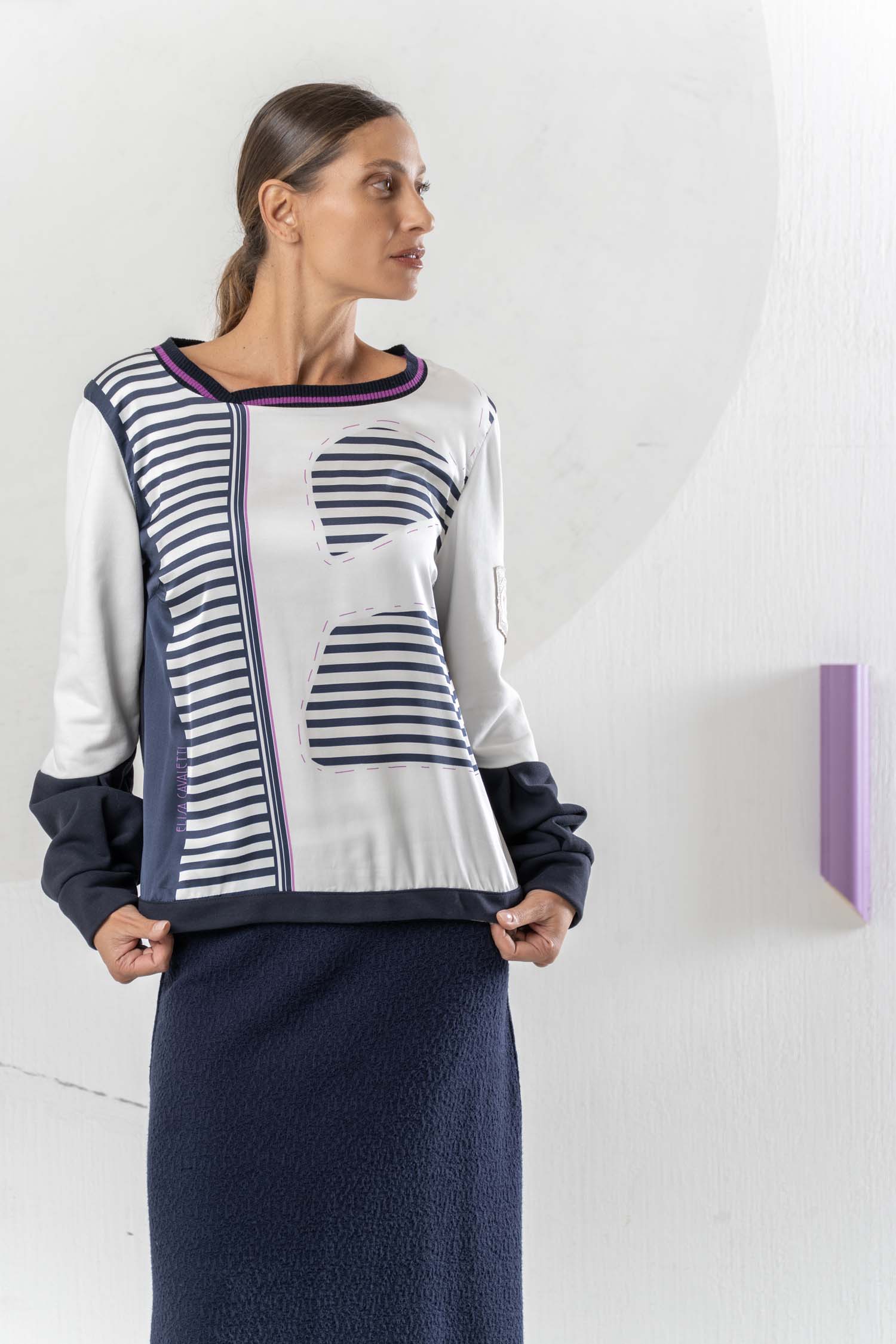 An indispensable essential for every wardrobe – the ELISA CAVALETTI St. Stripe sweatshirt! This blue and white shirt is adorned with trendy stripes and adds a sporty-chic touch to any outfit. Perfect for a casual everyday look or for special occasions. Make a statement with this must-have piece!