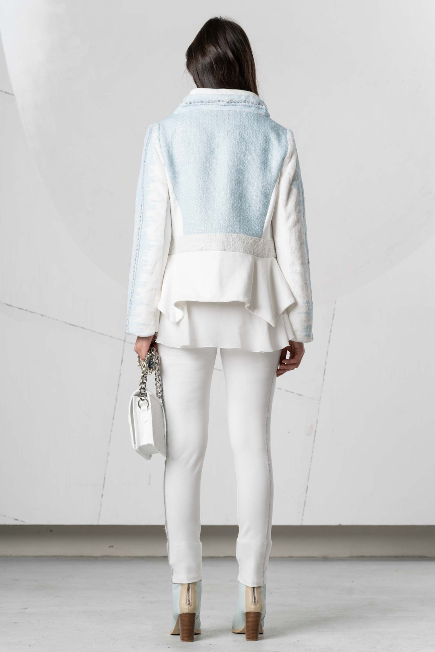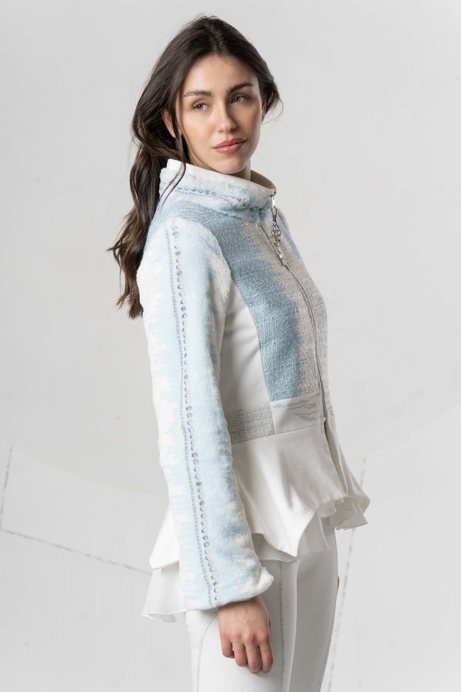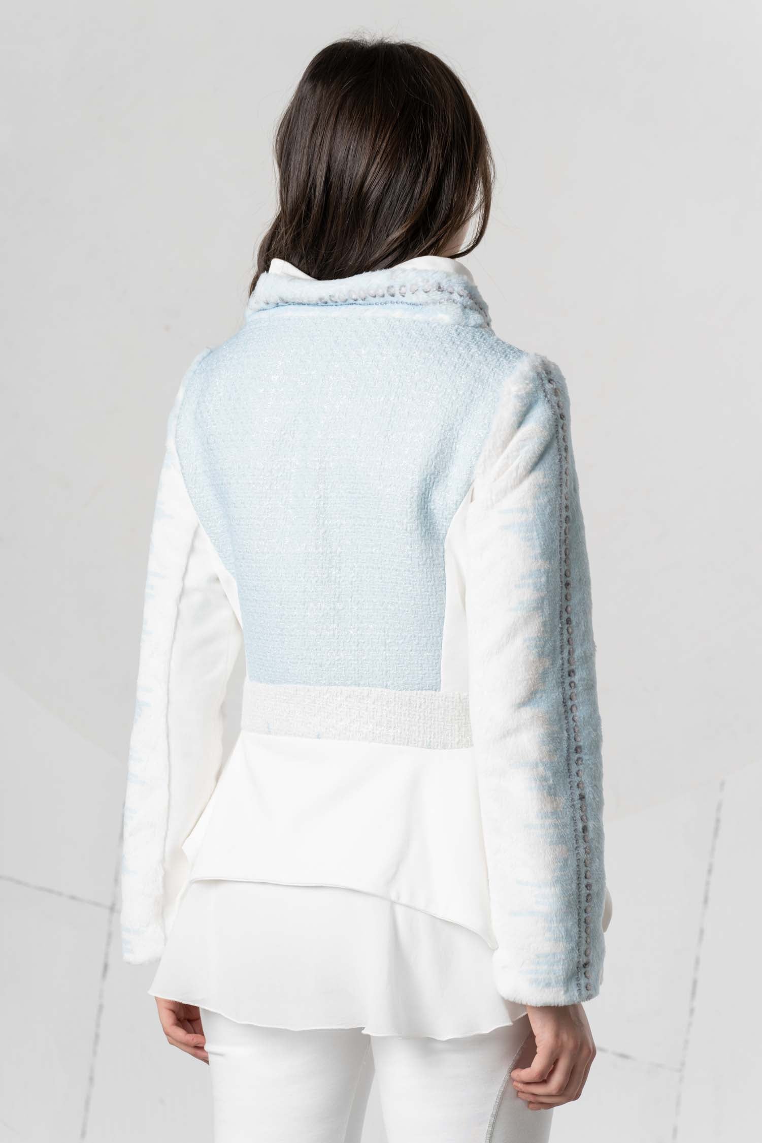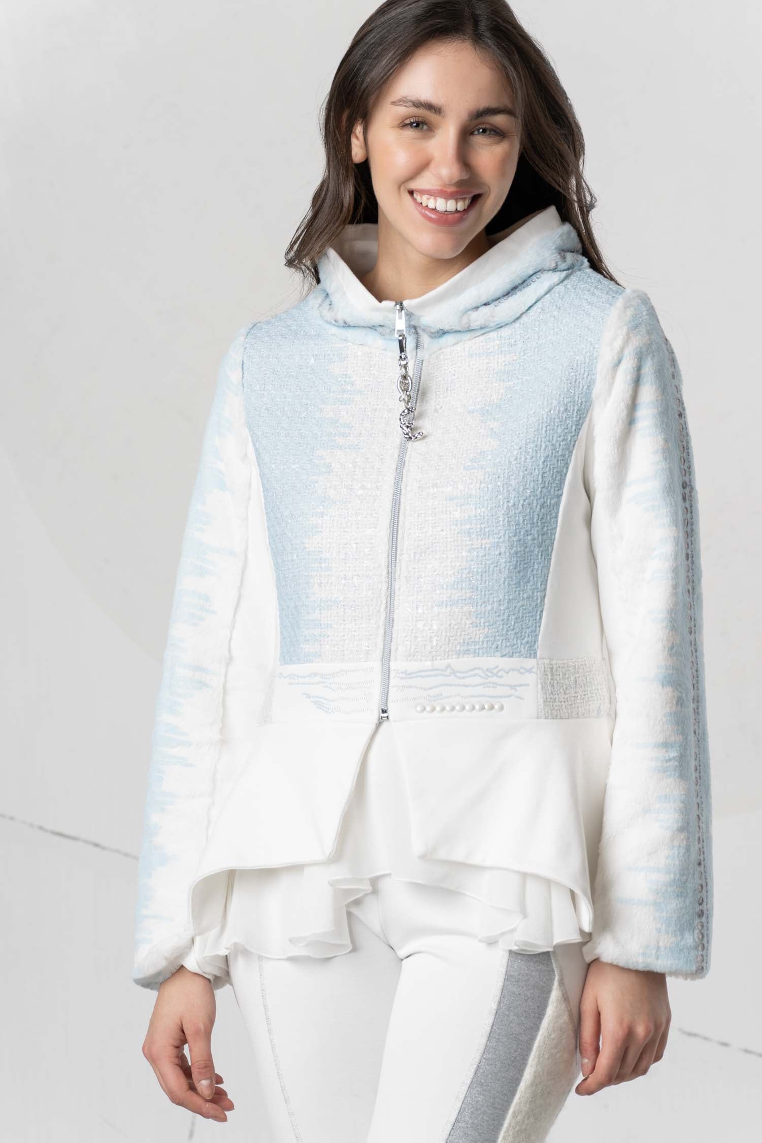 This stylish jacket impresses with its elegant stand-up collar and harmonious combination of white and light blue. Crafted from various high-quality fabrics, it offers not only visual appeal but also exceptional comfort. A versatile garment, ideal for sophisticated looks.