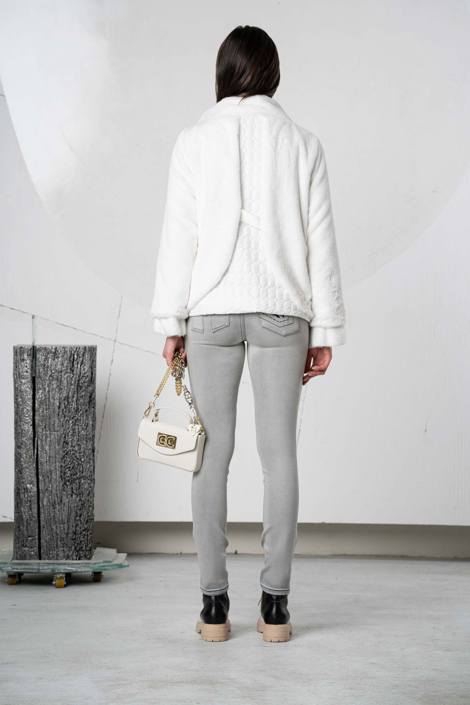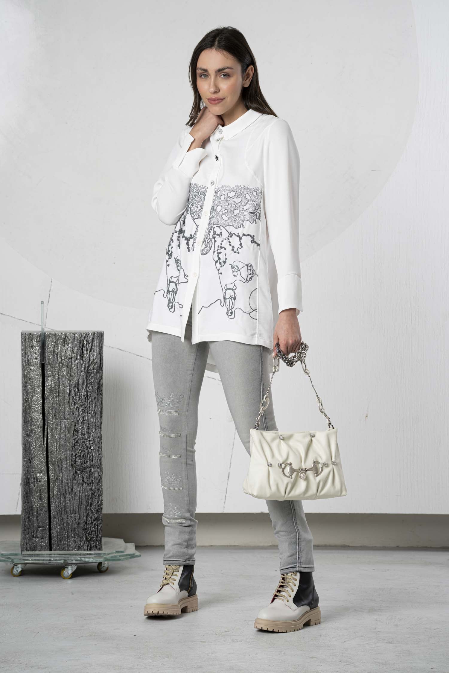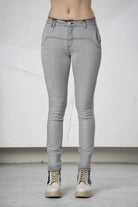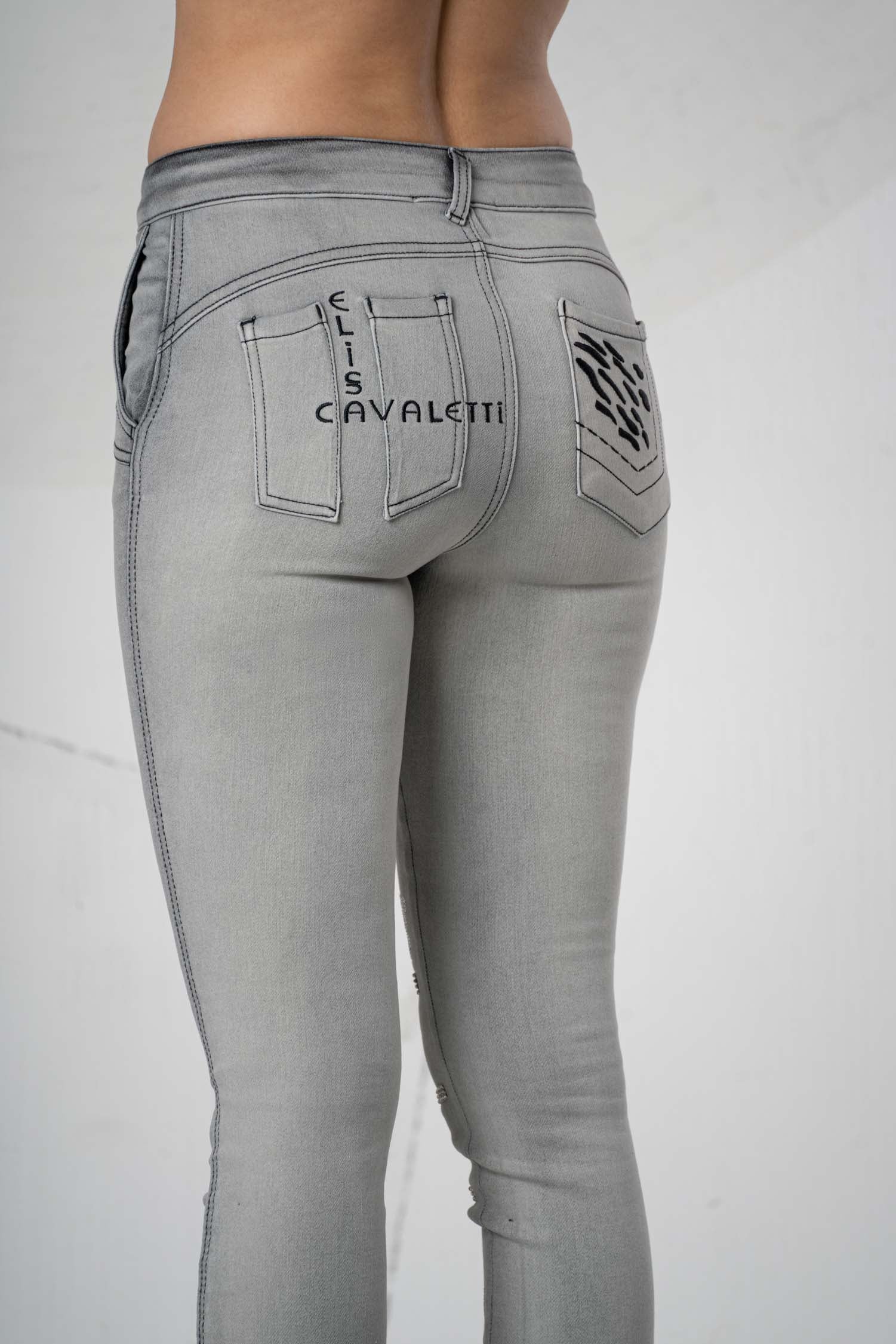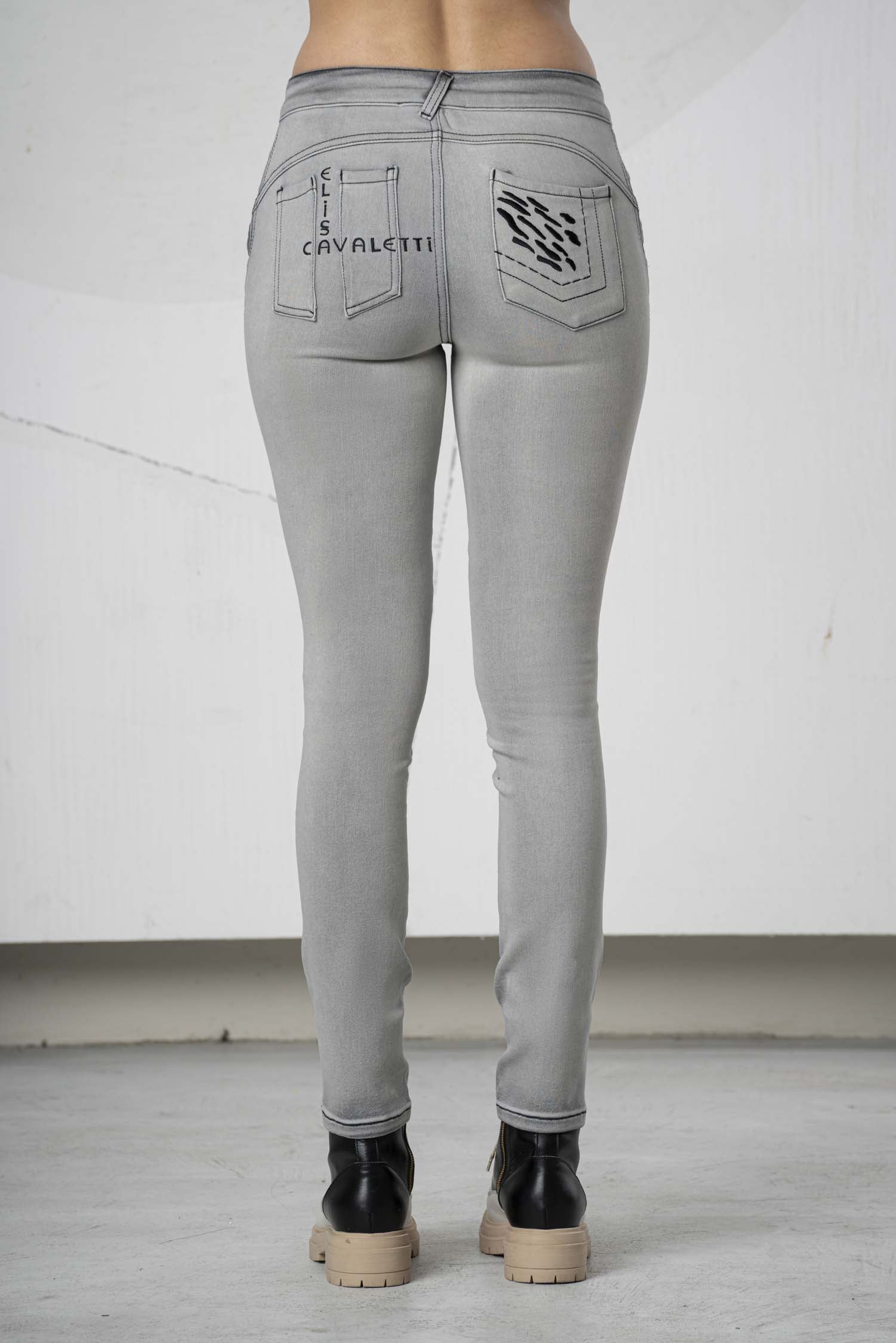 These stylish jeans impress with their high-quality grey cotton fabric, ensuring comfort and durability. The mid-rise waist offers a flattering fit, while the straight leg guarantees a modern silhouette. The decorative prints on the pockets are particularly striking, giving the jeans a unique touch. Ideal for discerning wearers who value quality and timeless design.