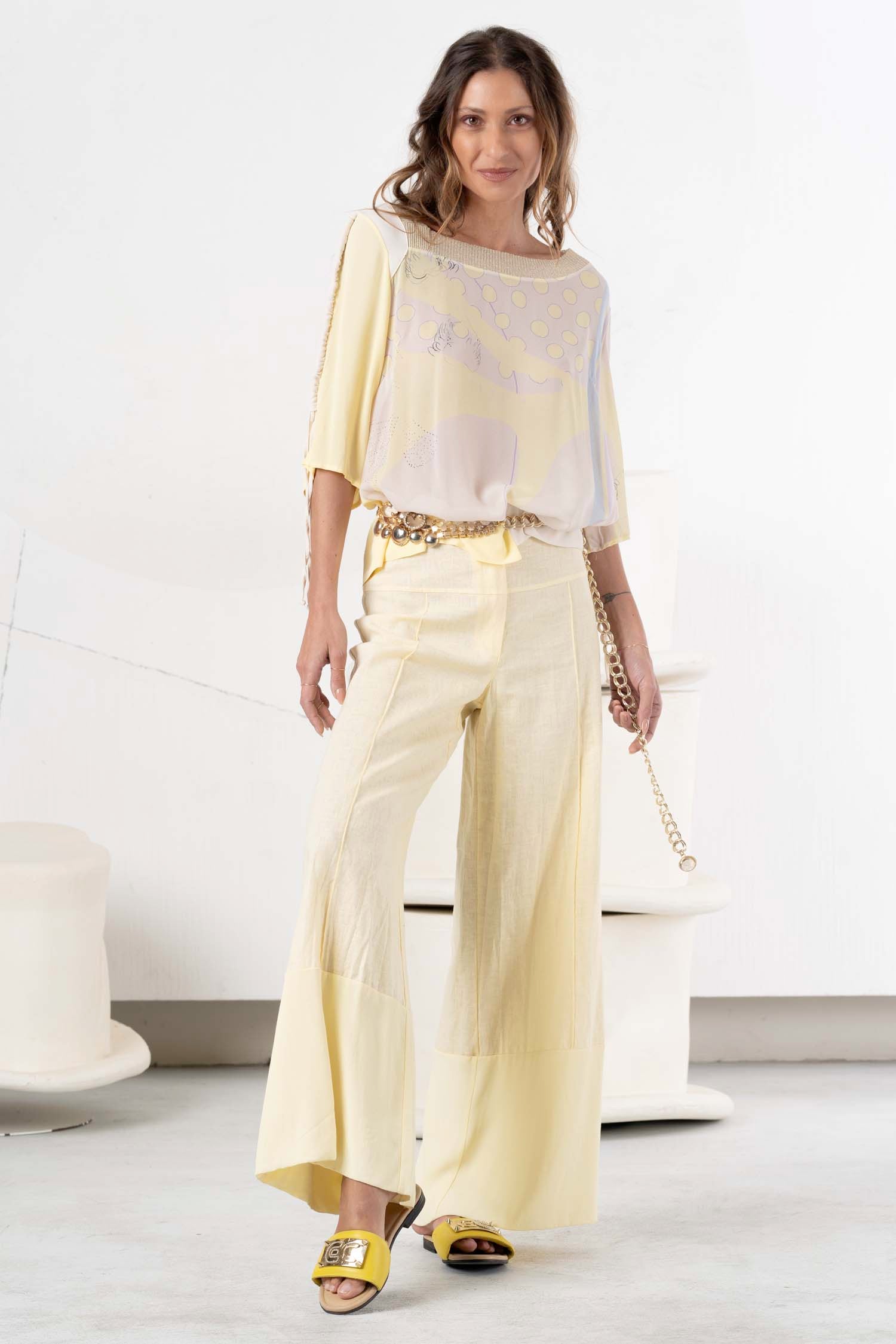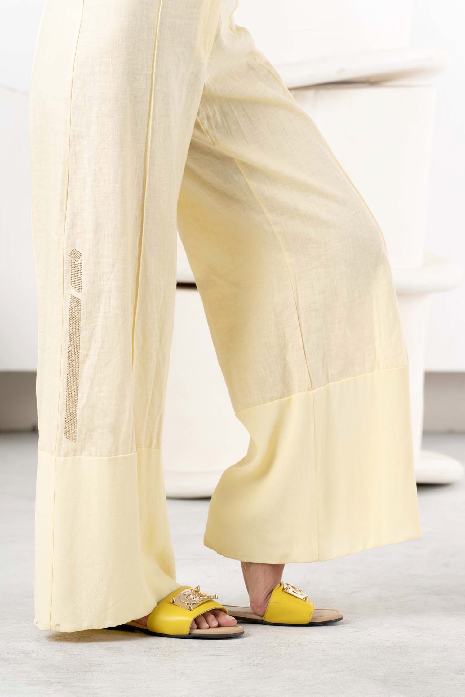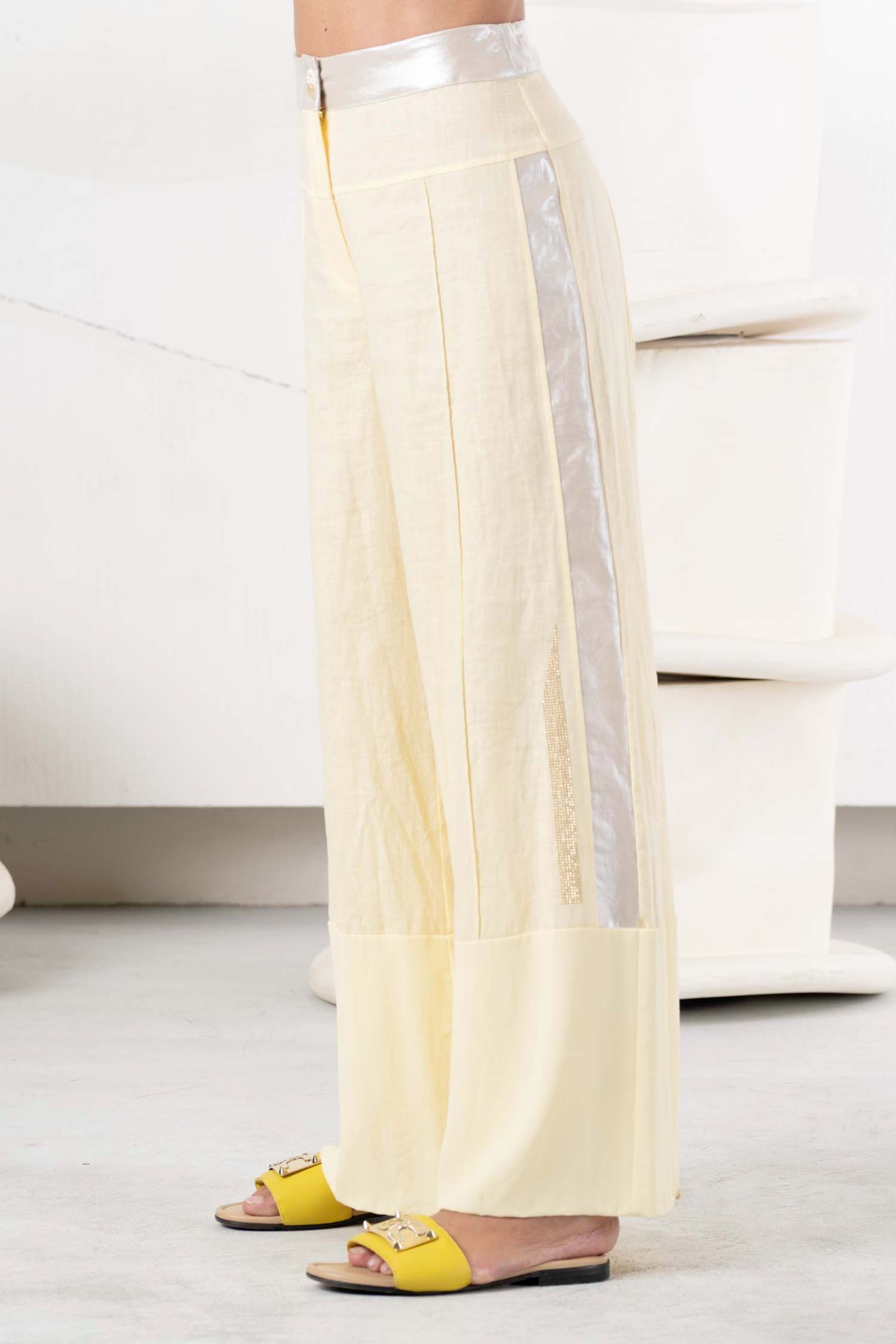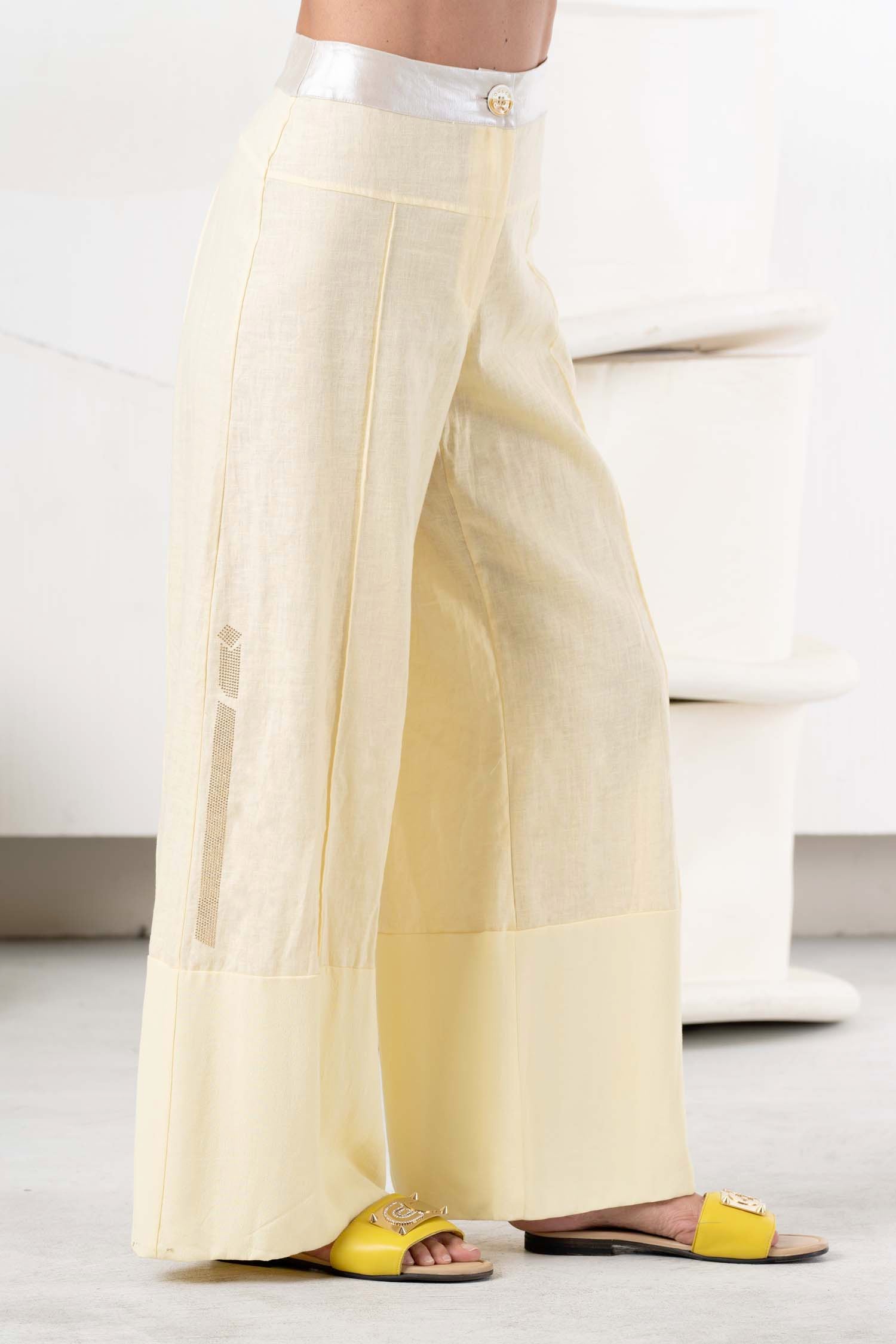 Discover the perfect summer style with the ELISA CAVALETTI Luce linen trousers. The fresh yellow hue and silver waistband give these trousers a light and modern touch. The comfortable fit ensures a pleasant feel. Bring a fresh look to your wardrobe with these trousers and enjoy summer to the fullest!