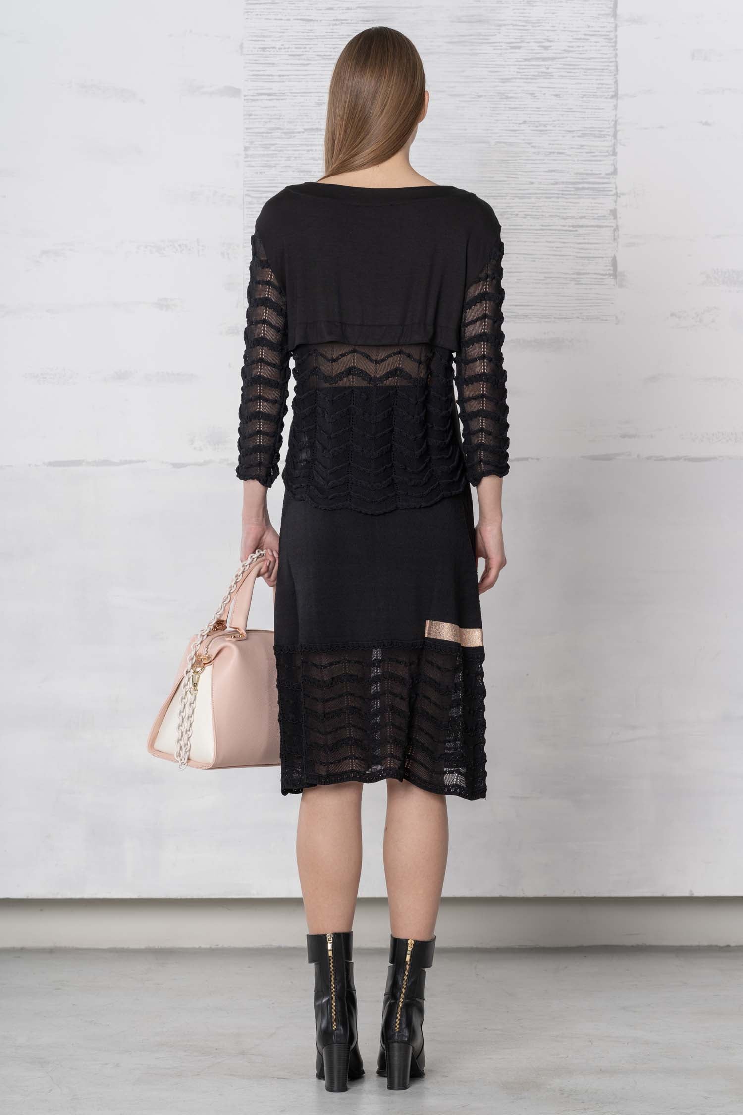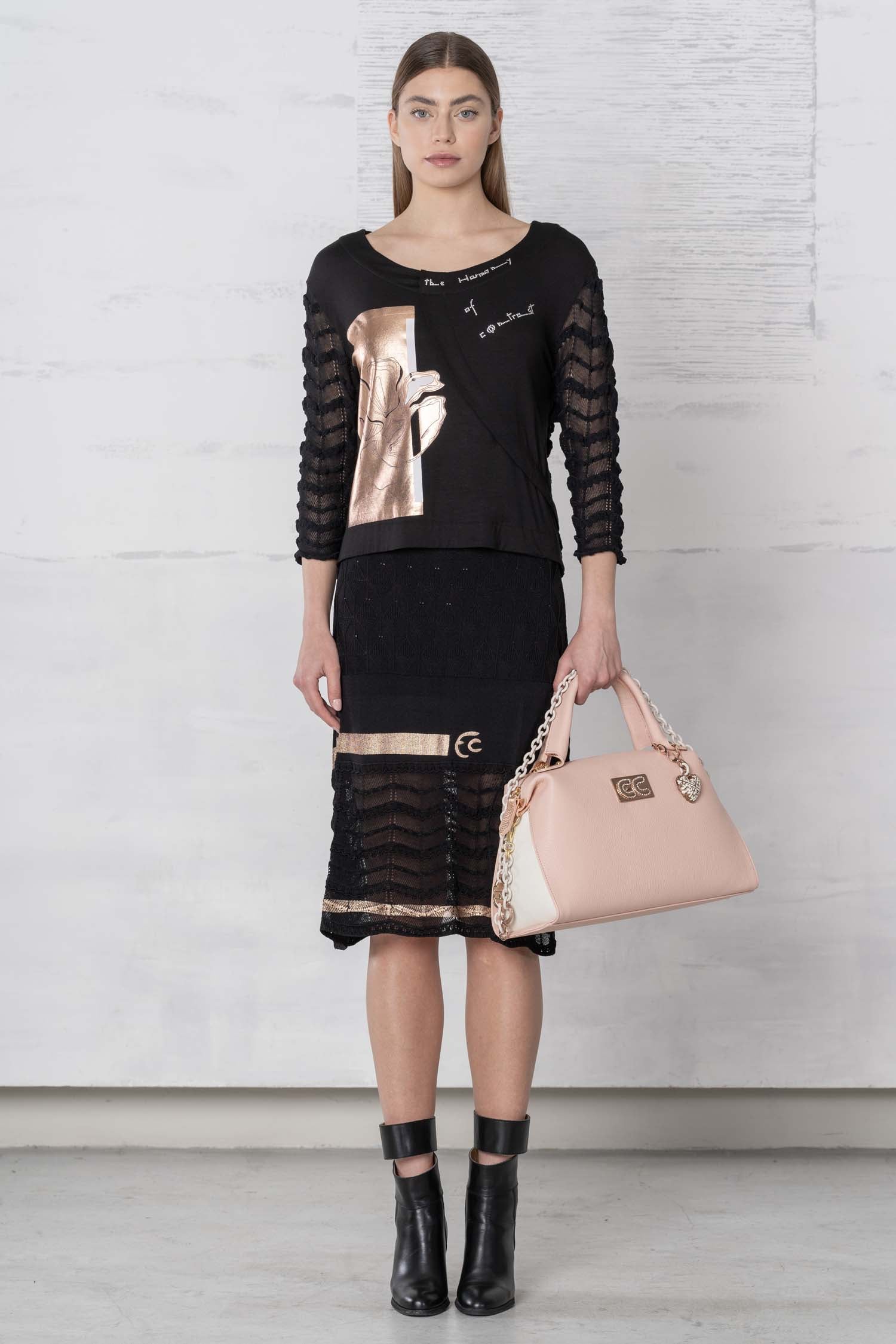 Make a stunning impression in the ELISA CAVALETTI Nero-Rame skirt. With its knee-length, black and copper design and a sheer panel, this skirt will give you a unique look. Perfect for an elegant night out or for staying stylish at the office.