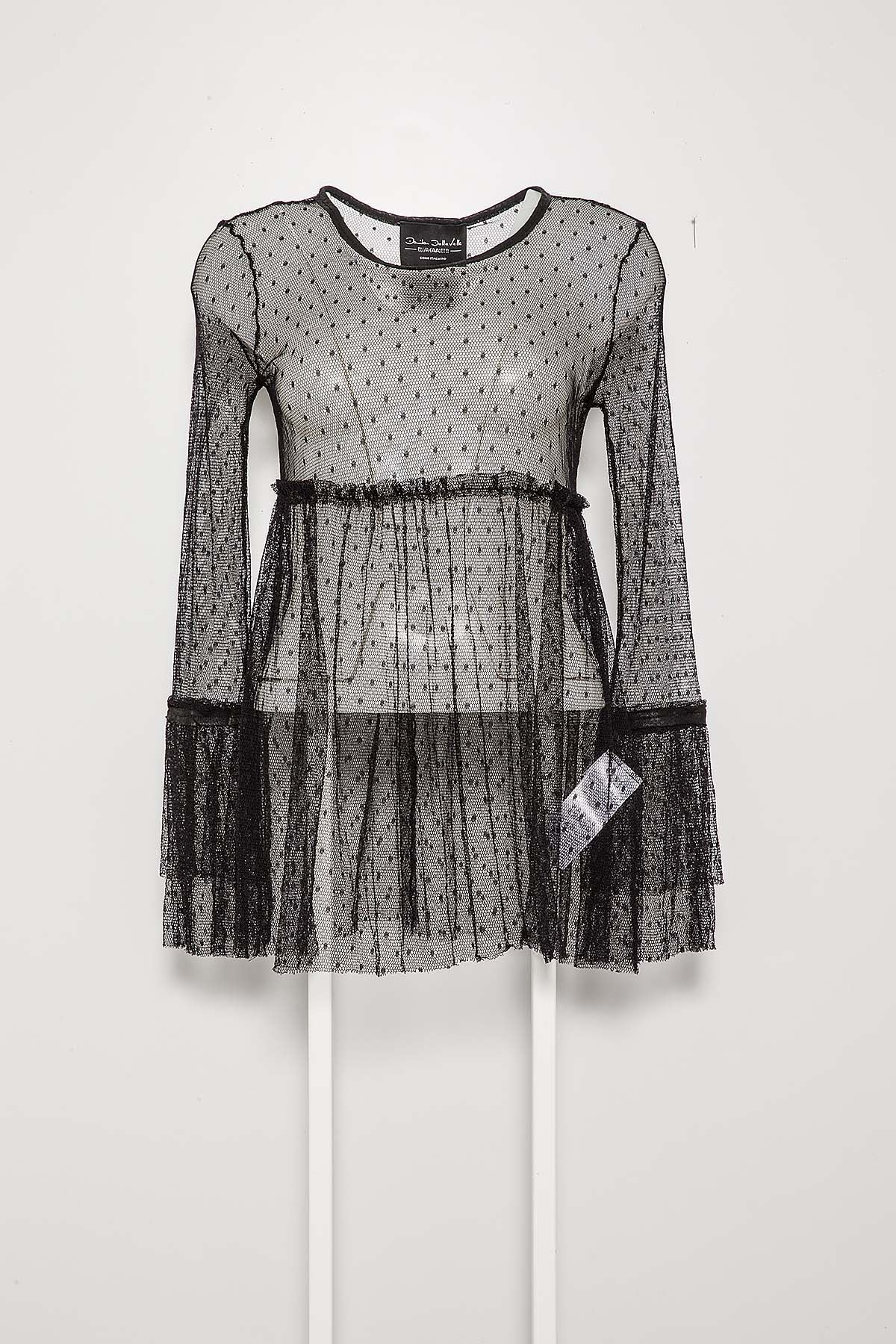 Discover the timeless elegance of ELISA CAVALETTI's Bianco-Nero blouse. This black, sheer blouse with long sleeves captivates with its sophisticated look and adds a refined touch to any outfit. Perfect for special occasions or to give your look that certain something.