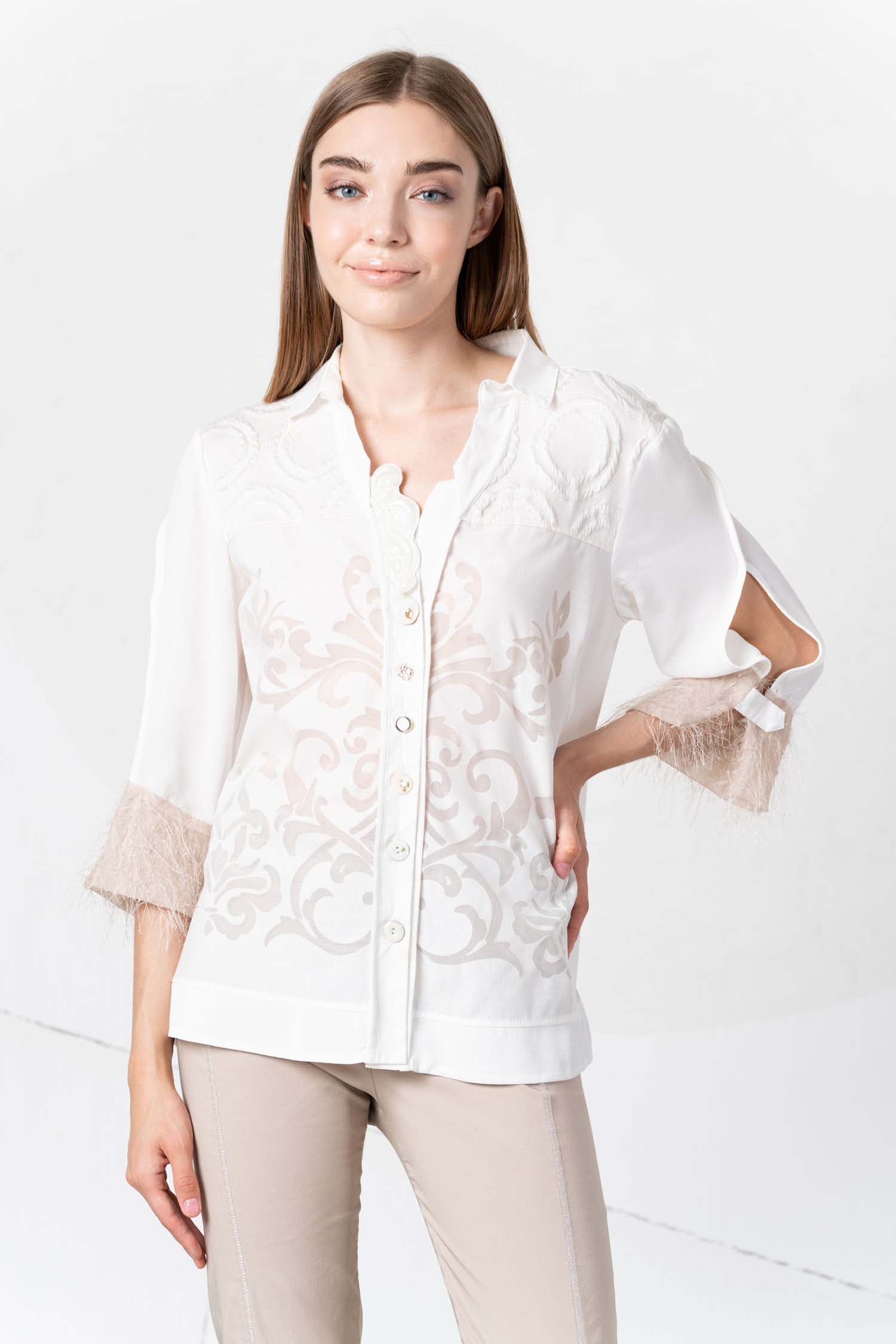 Discover the beauty of the ELISA CAVALETTI Incontro blouse! With its gorgeous white and beige pattern and elegant collar, it adds a special touch to any outfit. Perfect for stylish and discerning women looking for a unique piece. Make your outfit shine and feel confident and modern!