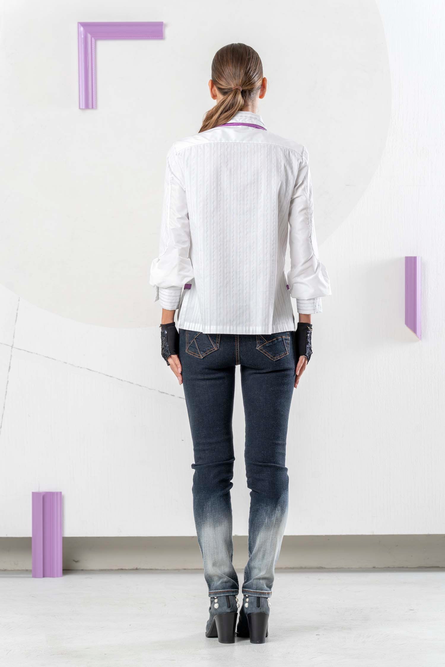 Discover your femininity with the ELISA CAVALETTI "Incontro Femminile" blouse! This striped white blouse features striking purple appliqués that add a feminine touch. Whether at the office or in your free time, this blouse is the perfect companion for every confident woman. Let its elegance enchant you and feel simply stunning.