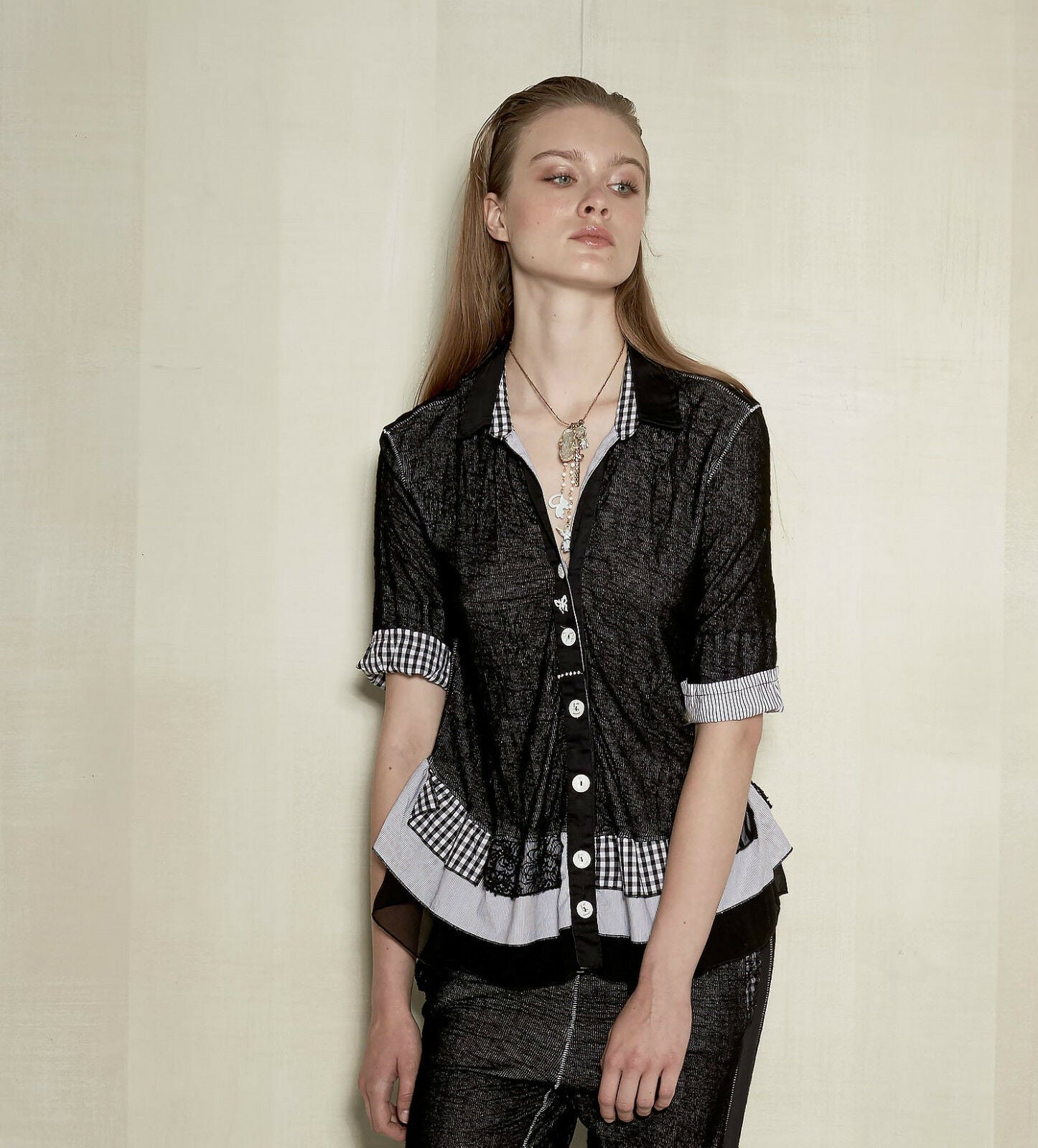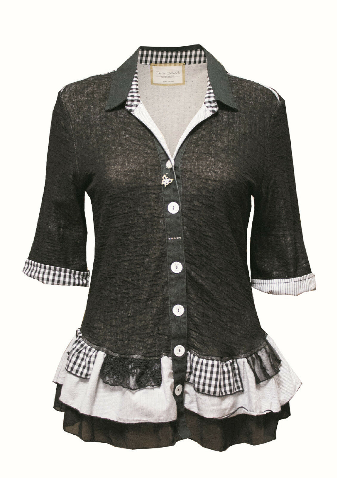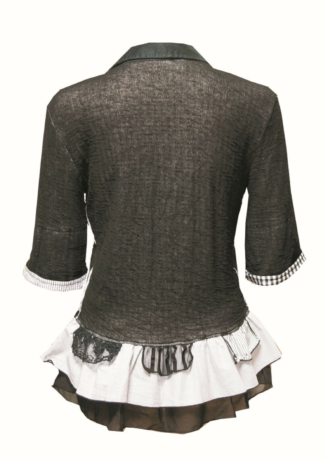 Stylish blouse with different fabrics and patterns in black.