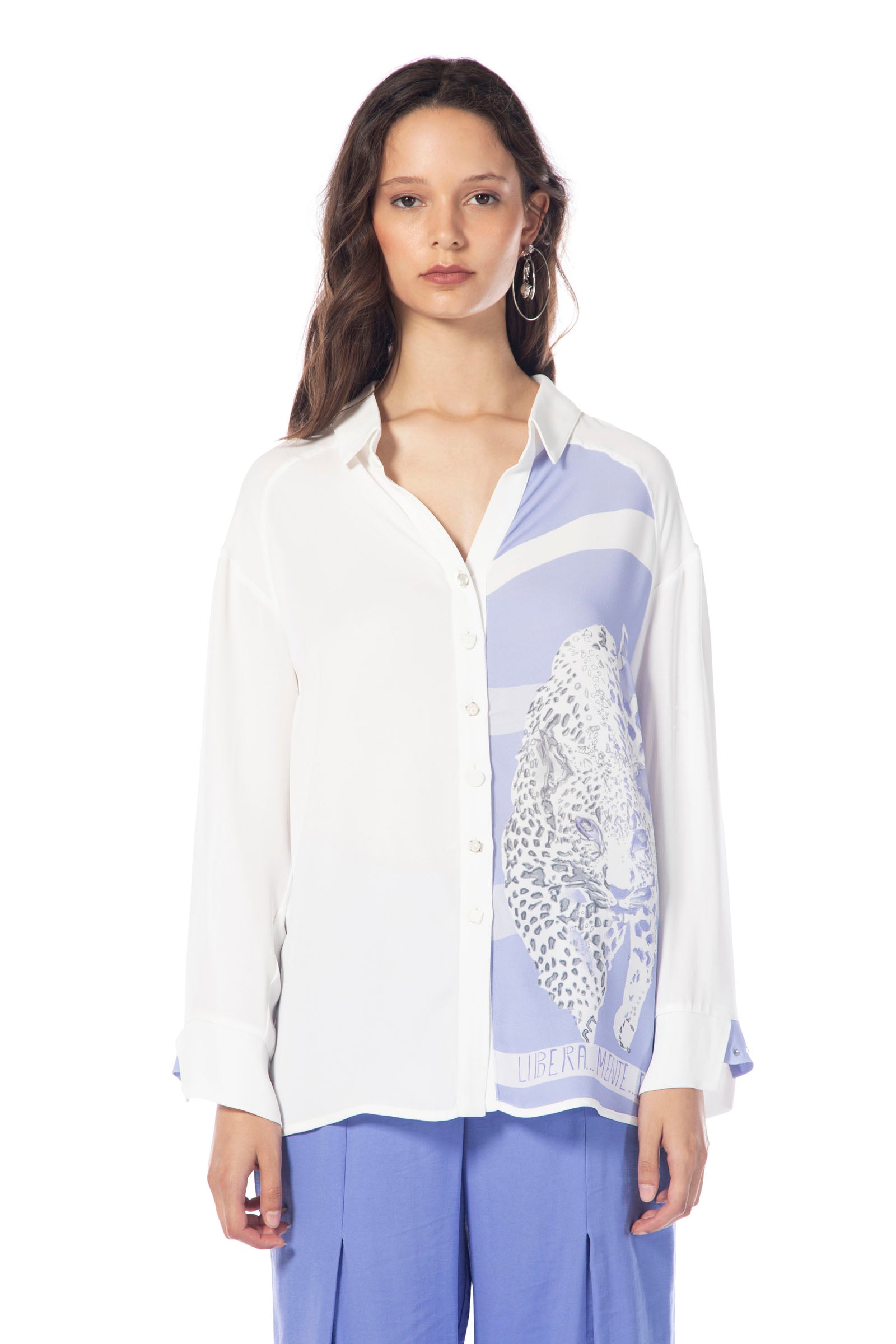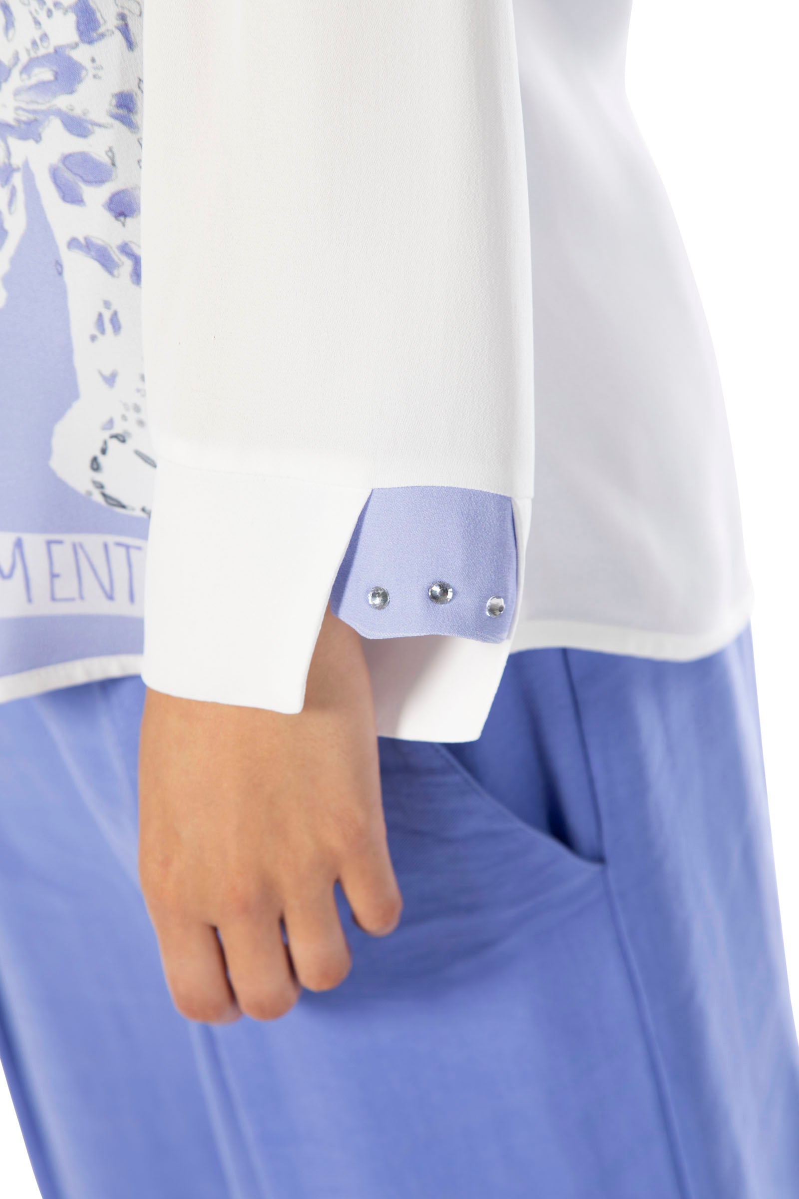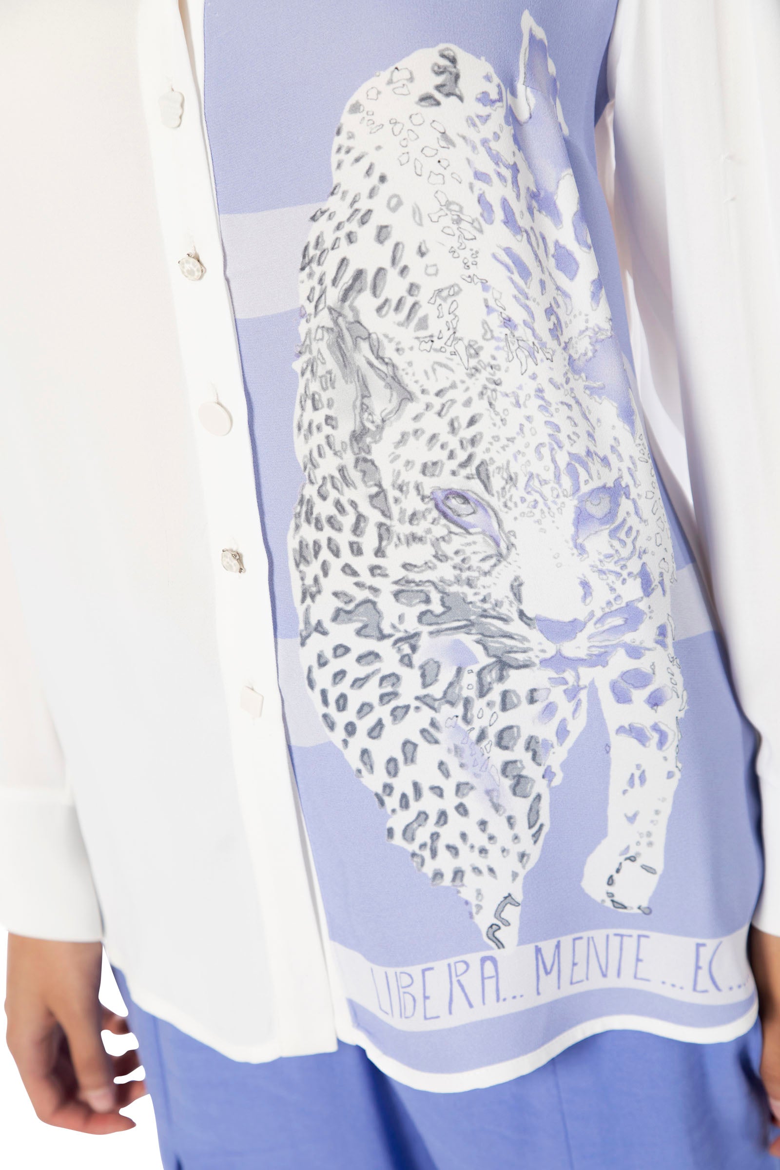 This stunning white and purple blouse from ELISA CAVALETTI is a real eye-catcher! The stylish leopard print adds a touch of wildness to the classic design. Perfect for a unique look and a special appearance. Experience the feeling of luxury and elegance with the St. Lince blouse from ELISA CAVALETTI!
