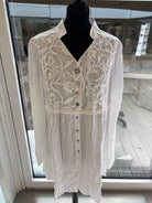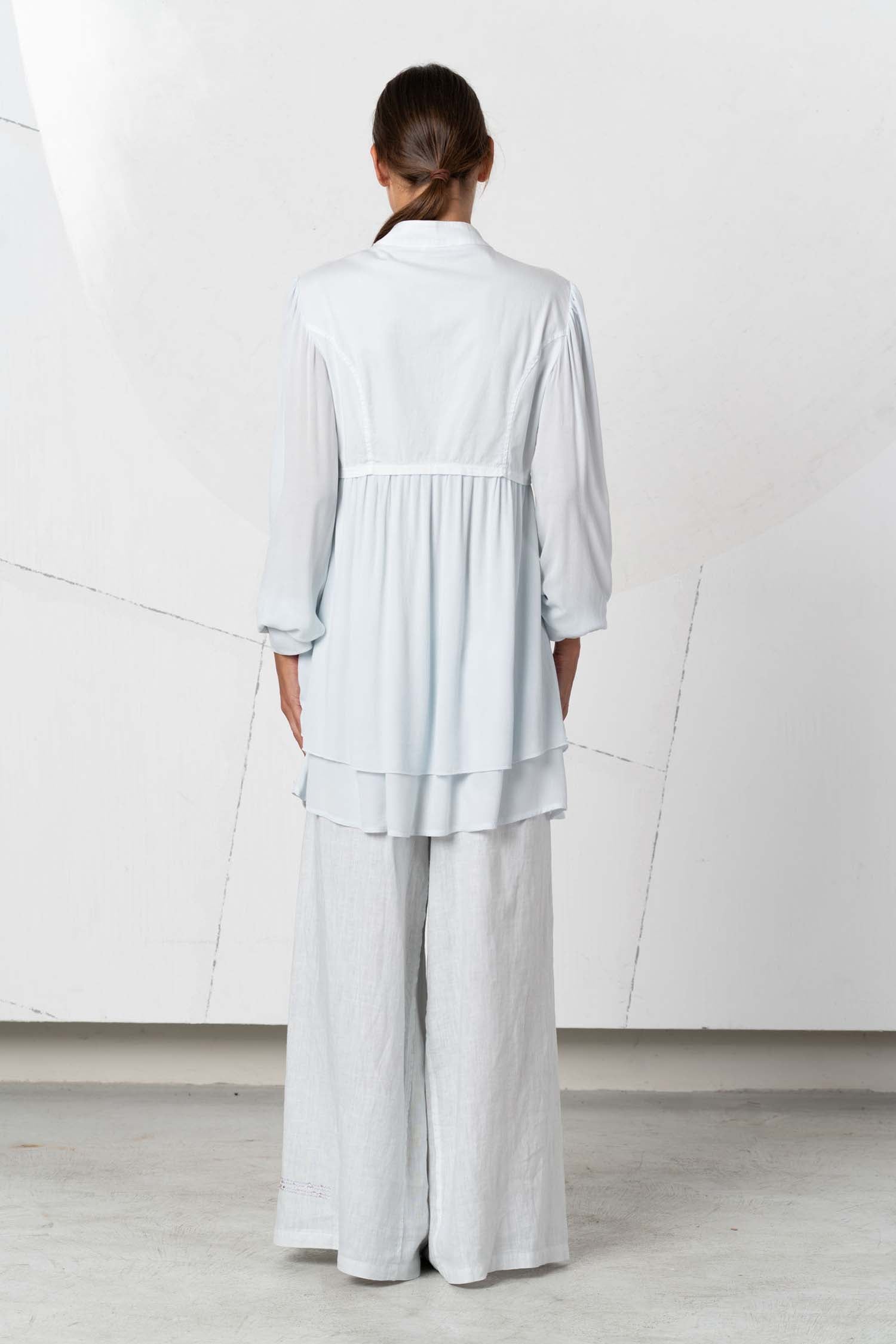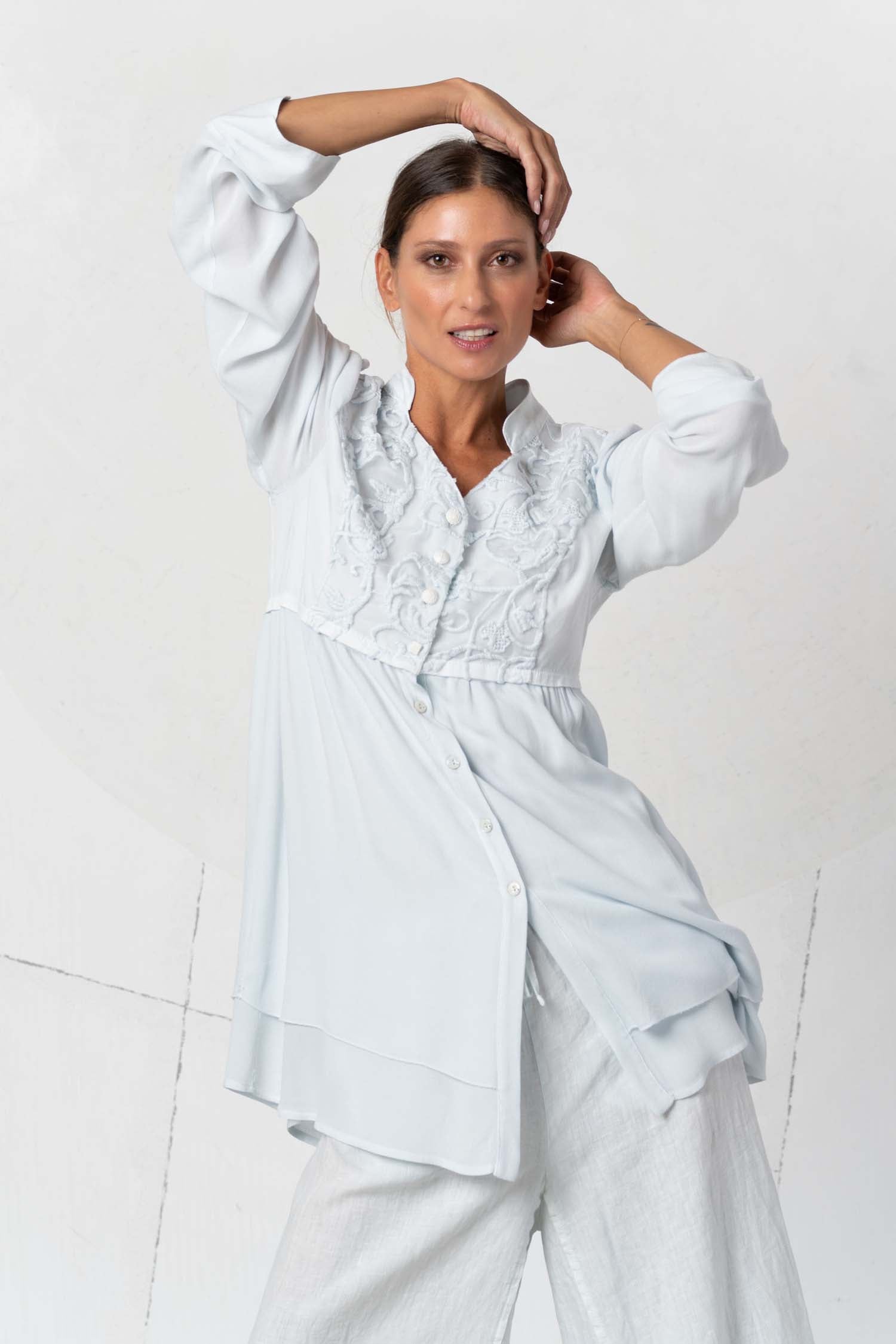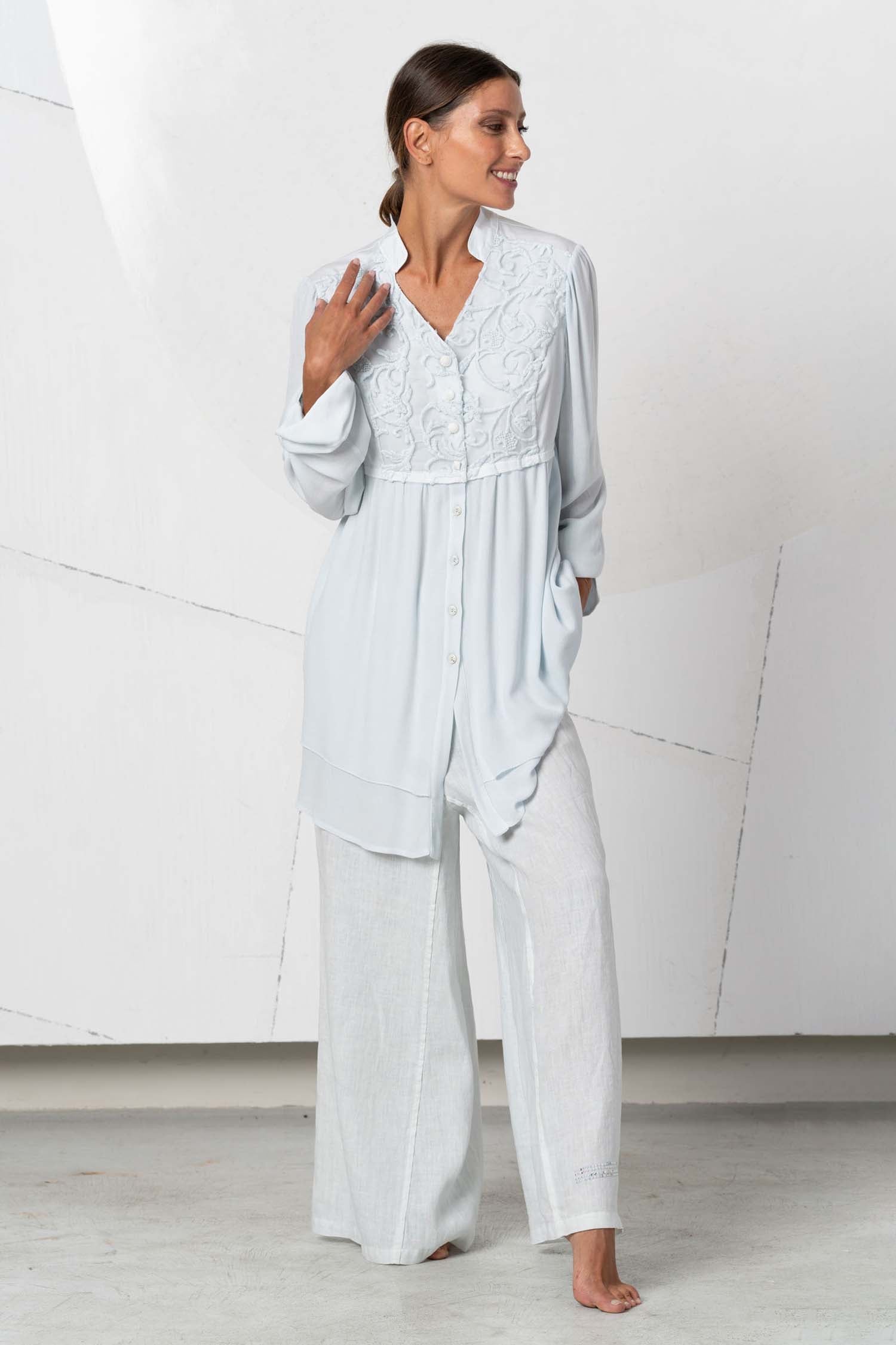 This elegant and beautiful light blue linen blouse, Idillio, enchants with delicate lace and a tunic style. Perfect for a feminine yet playful look. Ideal for special occasions or for standing out and feeling special in everyday life.