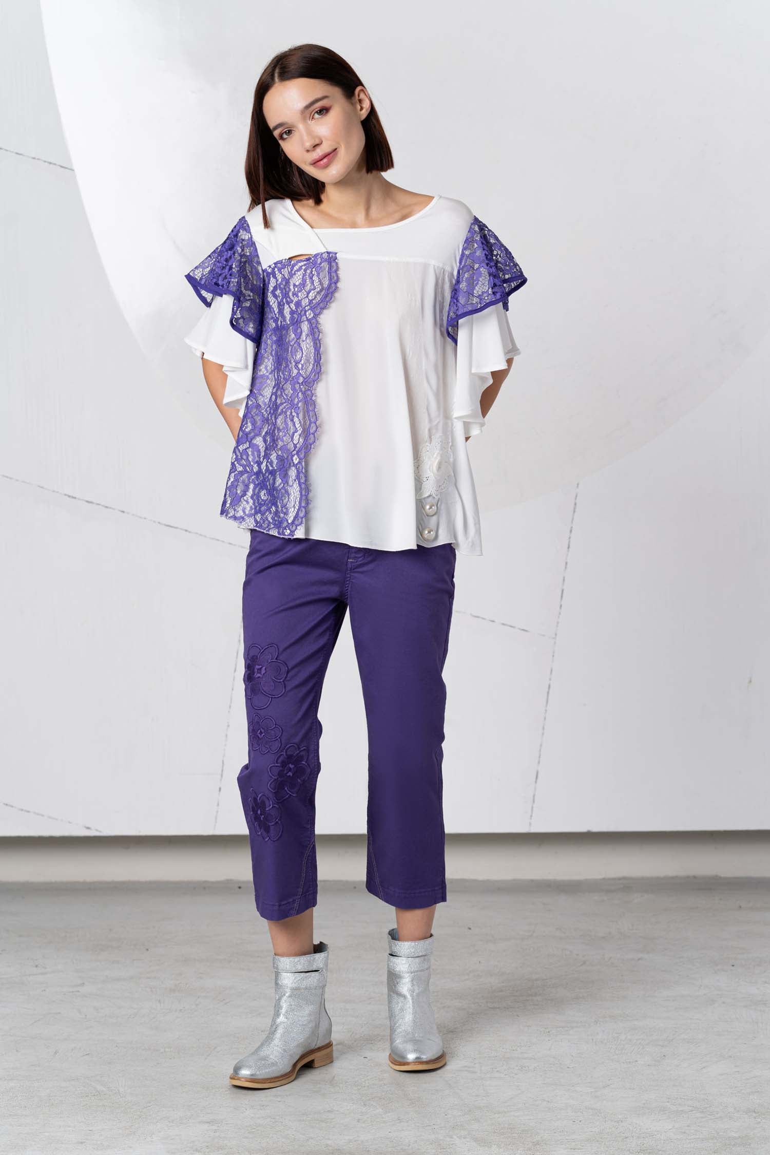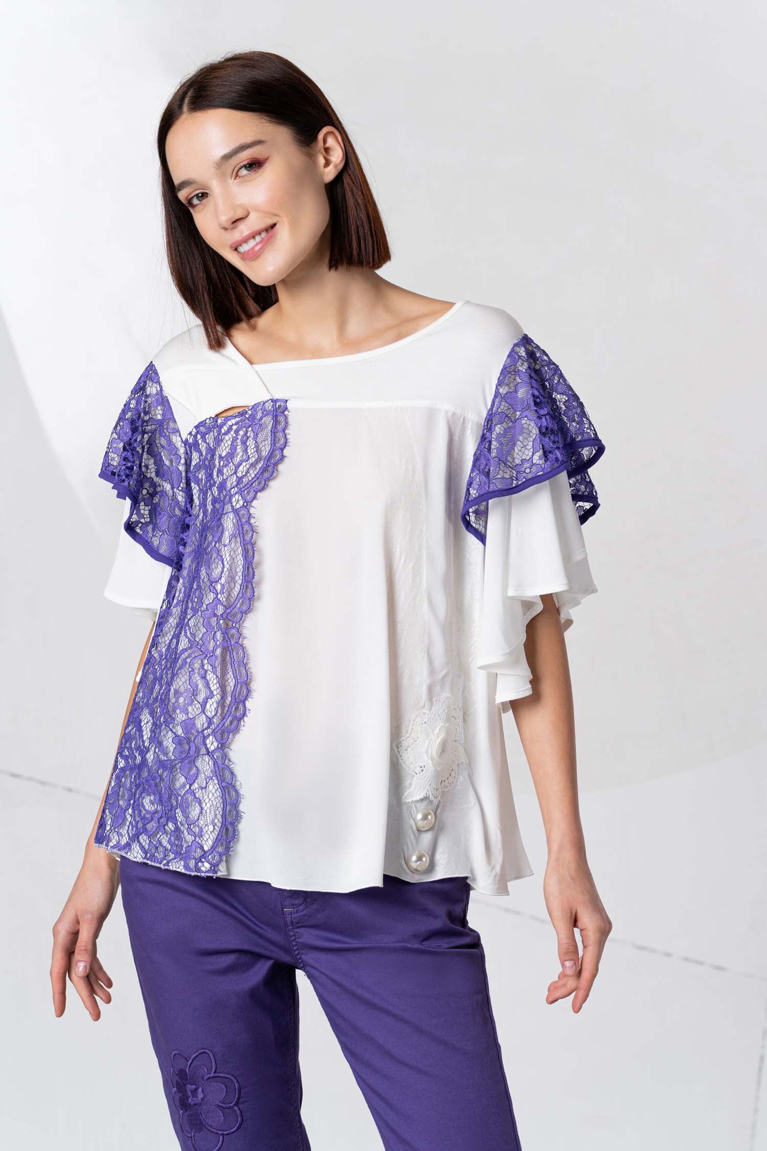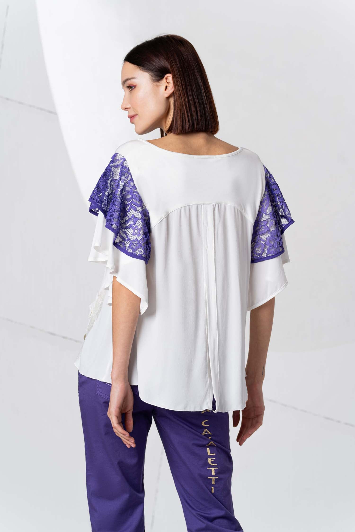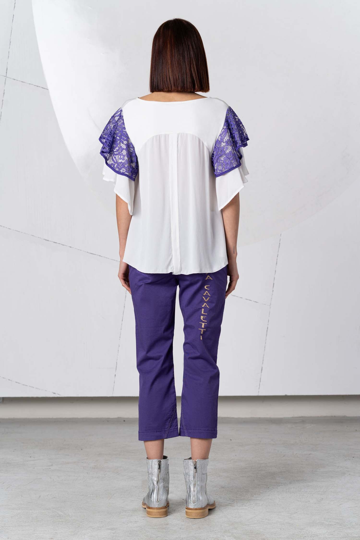 Be captivated by the ELISA CAVALETTI Incontro Impulso blouse! With its white and purple lace trim and short sleeves, it's an extravagant must-have for every wardrobe. Add an impulsive touch to your look and enjoy the attention you'll receive!