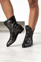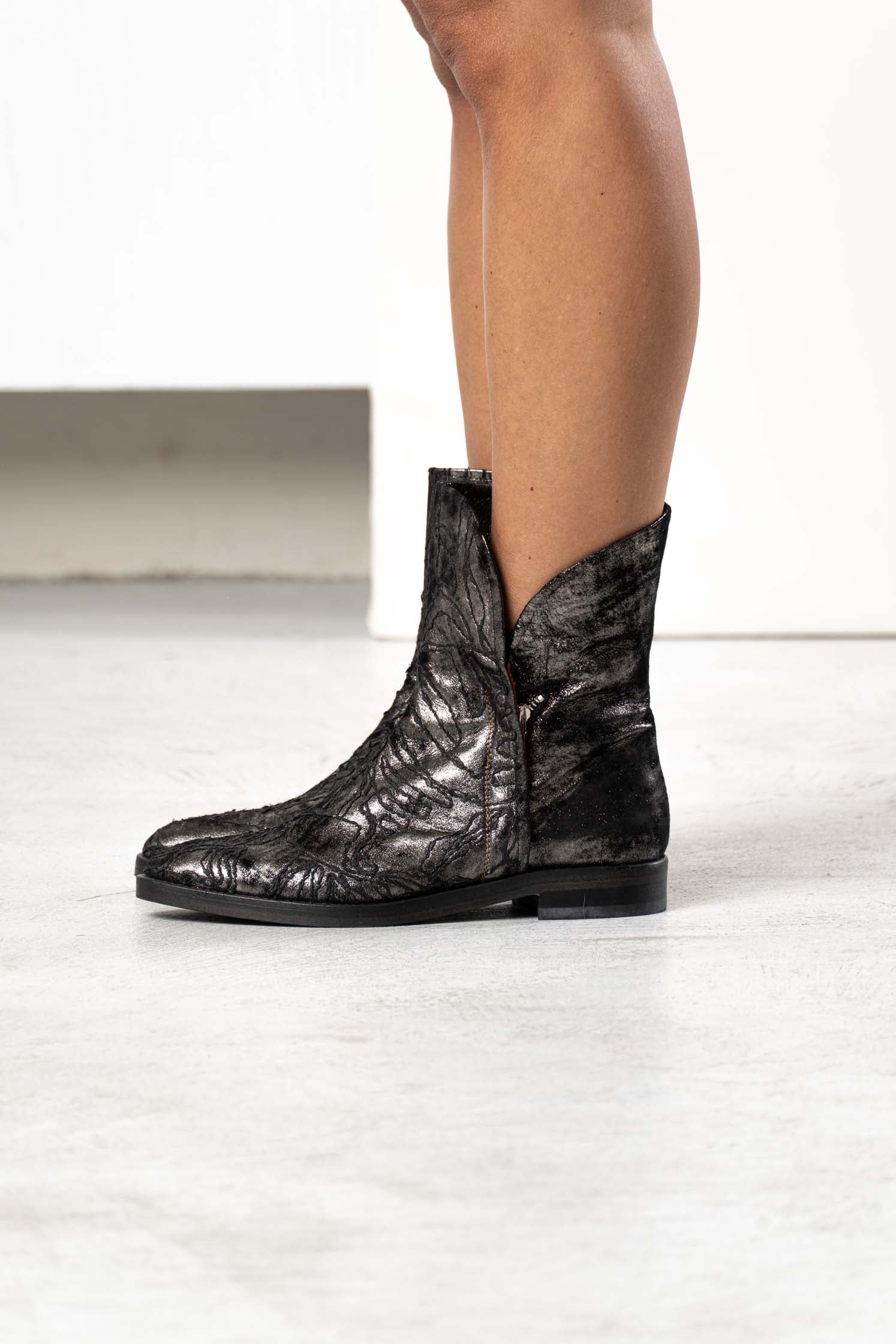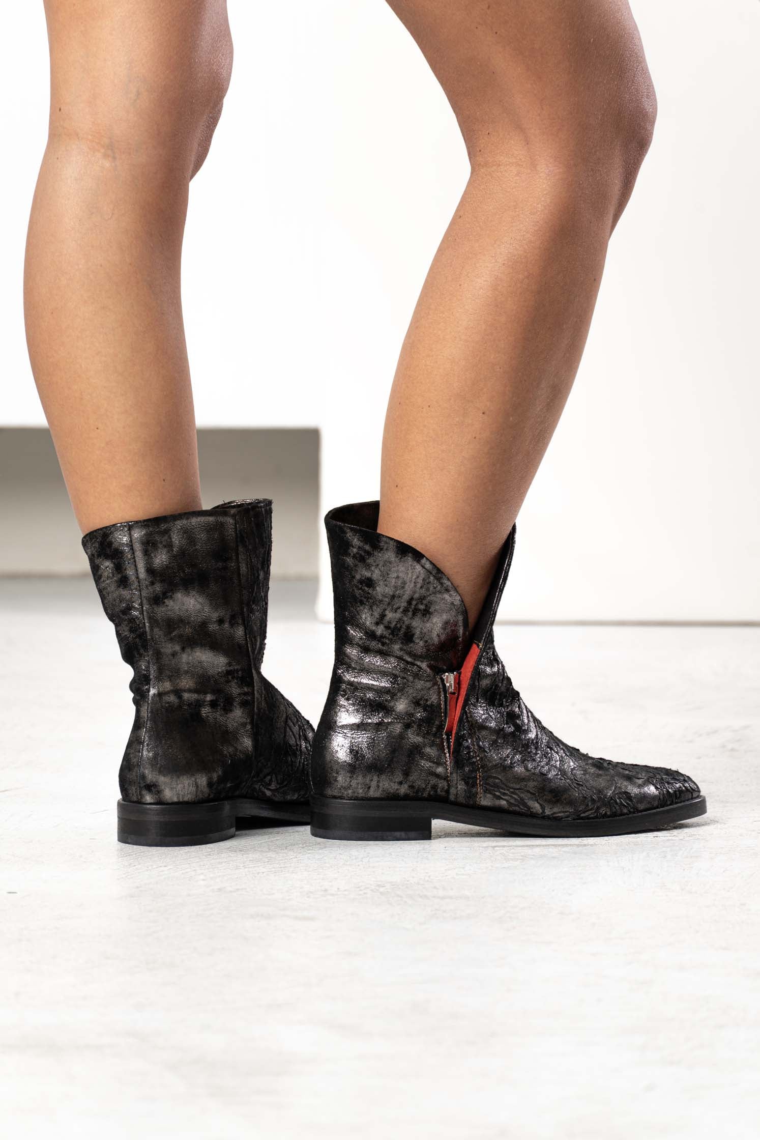 These metallic ankle boots are a must-have for anyone who dares to stand out from the crowd. The luxurious black leather with silver highlights creates a captivating sheen that makes every step a statement. Their striking look instantly adds glamour and individuality to your outfit – perfect for bold fashionistas who want to be different. The high-quality leather guarantees durability and comfort, while the modern design remains timelessly elegant. Whether paired with sophisticated evening looks or casual everyday styling, these ankle boots are the key to an unforgettable appearance with unmistakable character.
