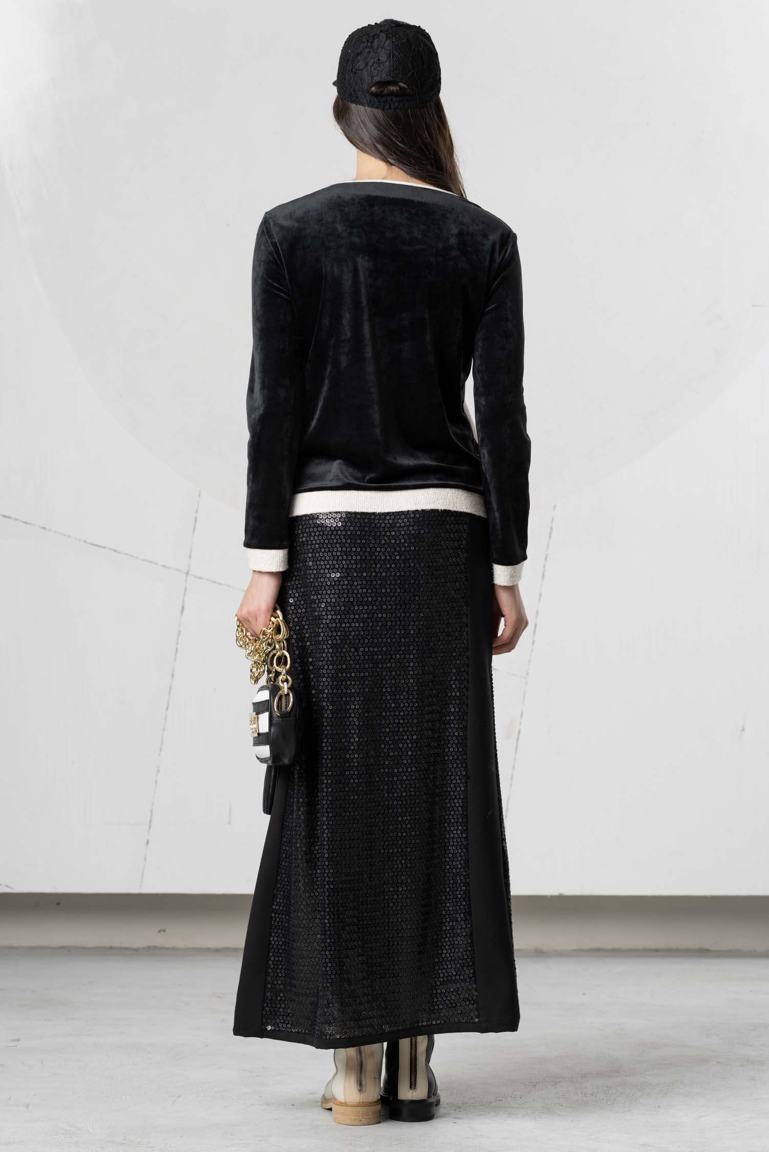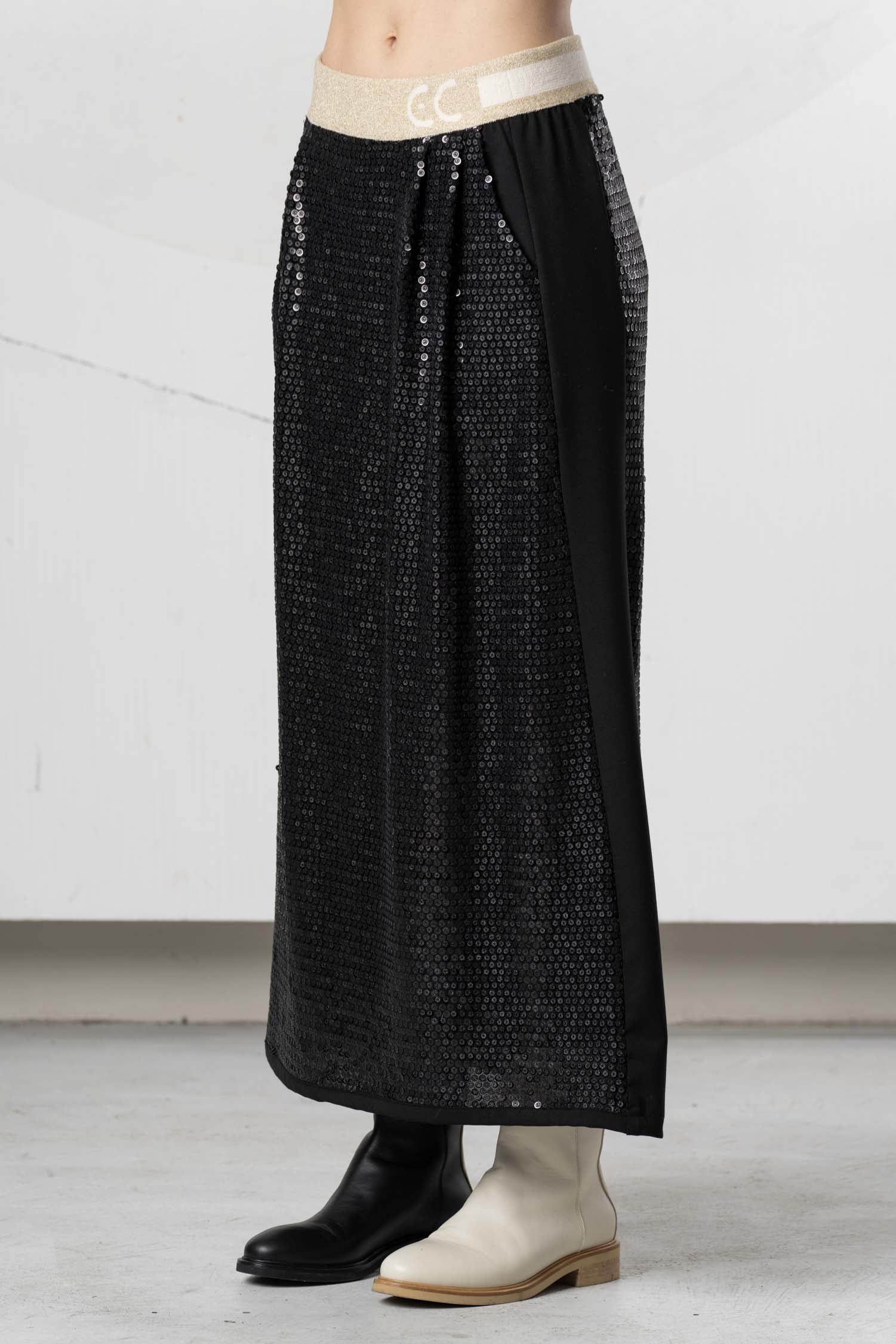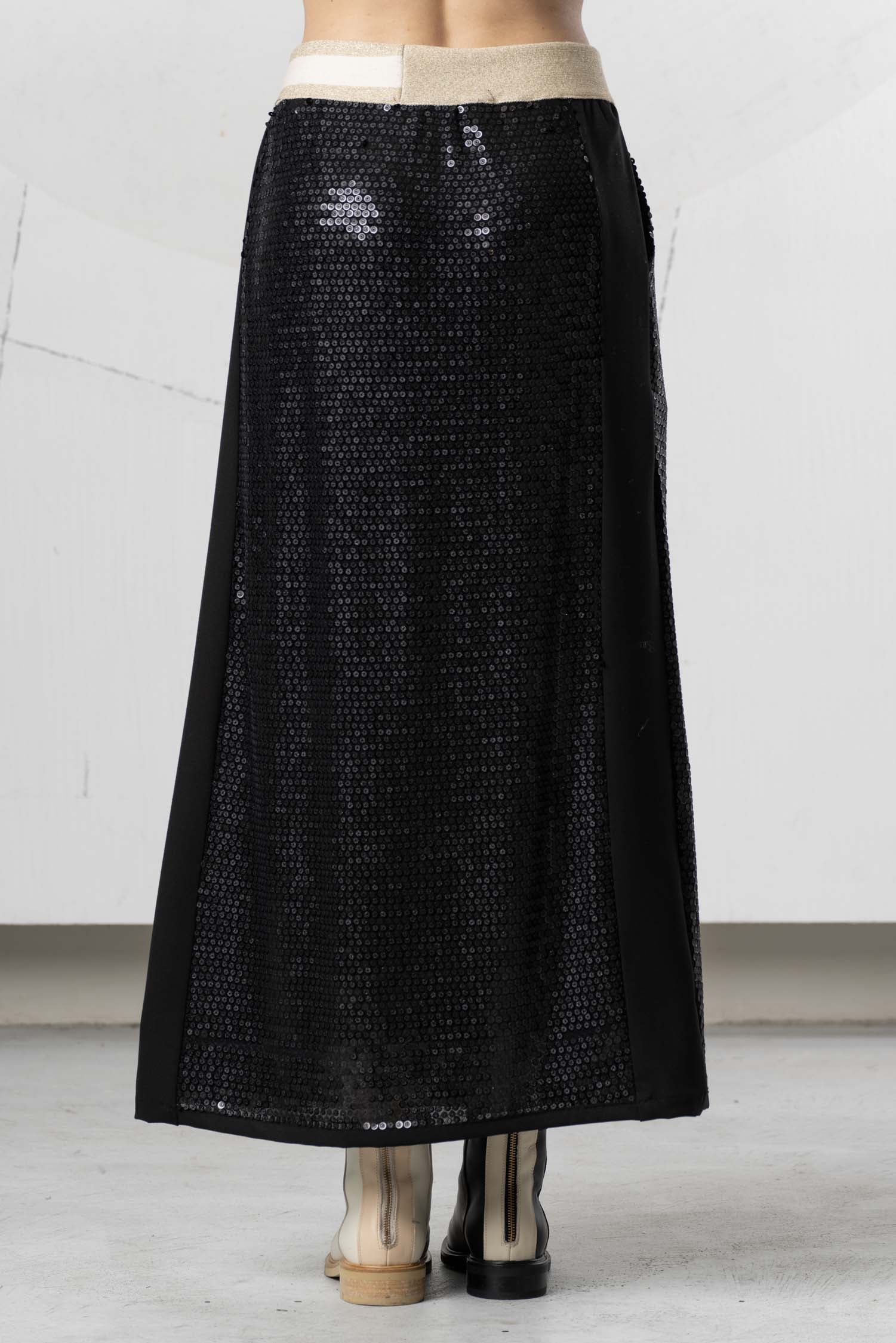 This long skirt in elegant black captivates with its extraordinary sequin appliqués, adding sophisticated accents to any outfit. The flowing silhouette ensures a flattering fit and effortless style, ideal for special occasions and fashionable looks with a touch of class.