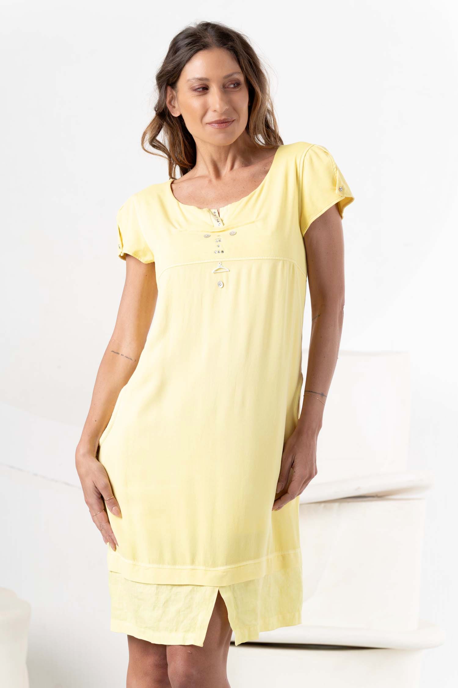 Discover our new collection featuring the ELISA CAVALETTI dress in beige and yellow! This short-sleeved, knee-length dress is perfect for spring. Be inspired by its warm colors and unique design!