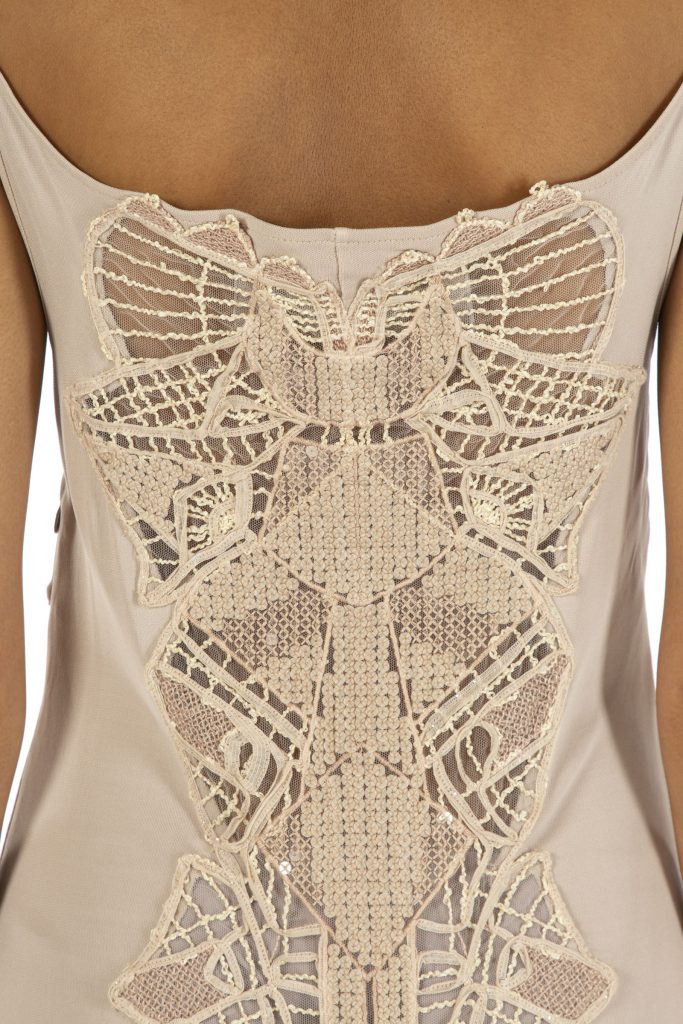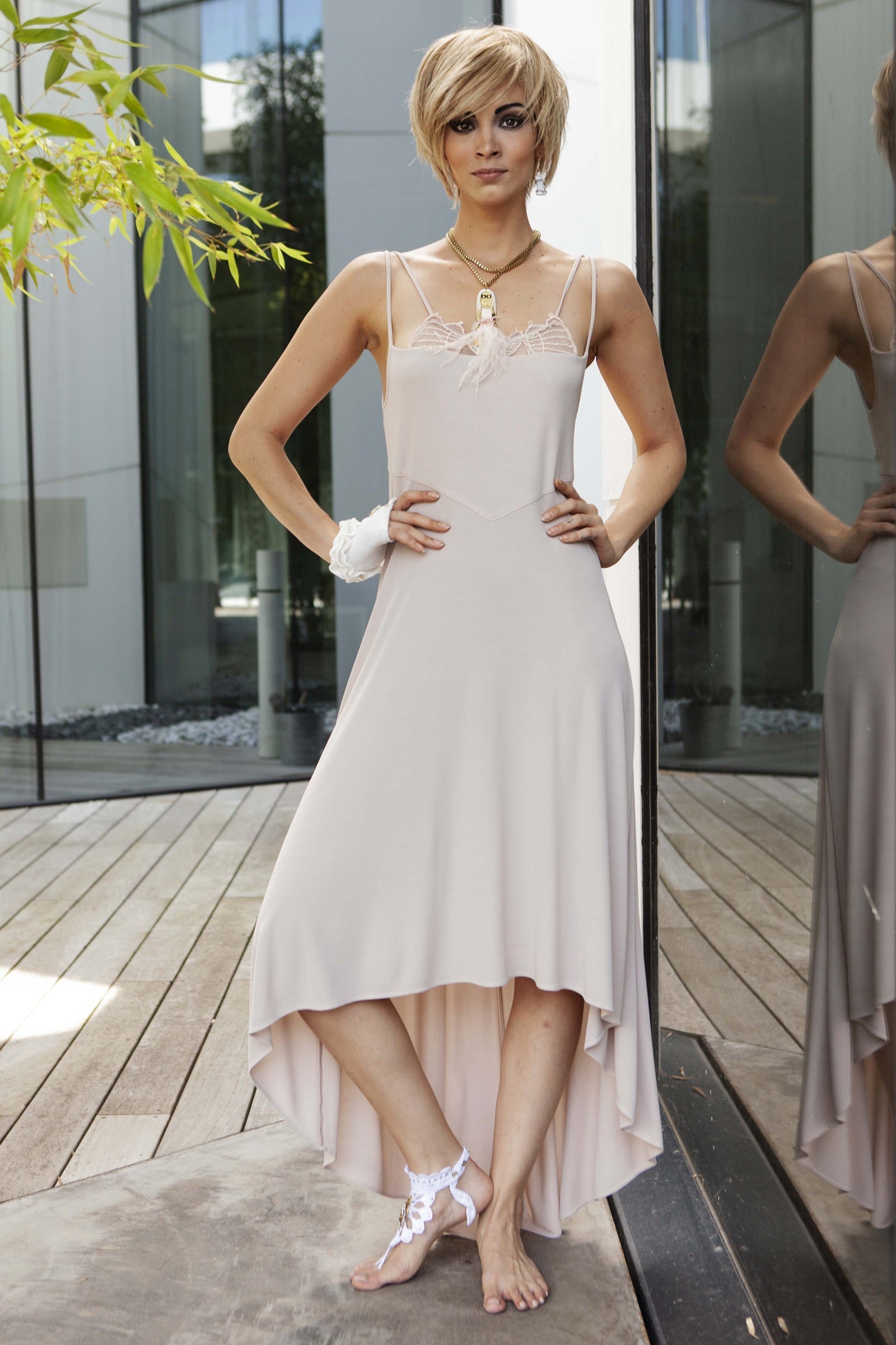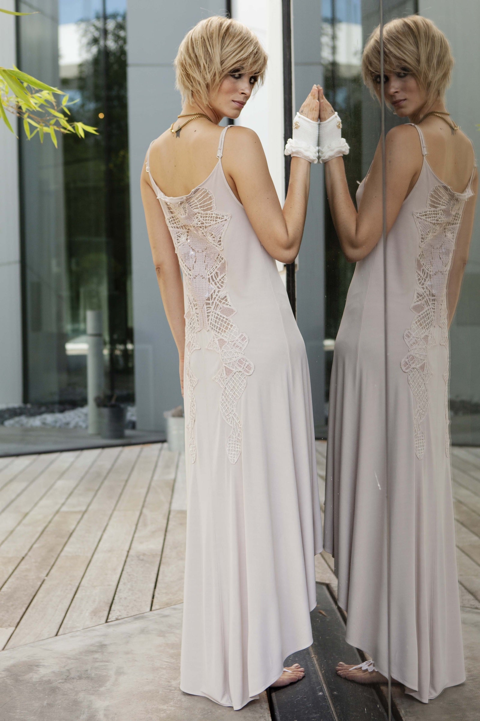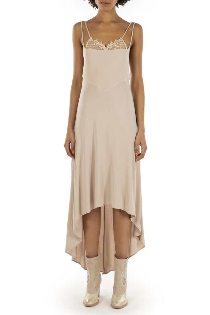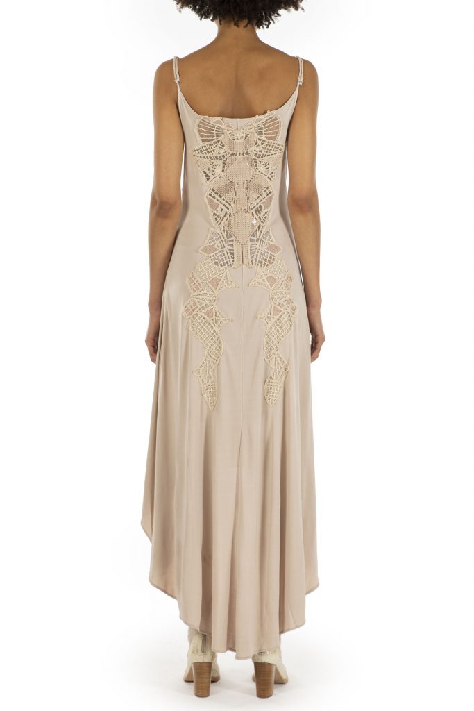 Be enchanted by this long, beige dress with an asymmetrical cut from ELISA CAVALETTI. Adorned with delicate lace and intricate embroidery, it creates a truly special look. A must-have for anyone who loves something extraordinary!