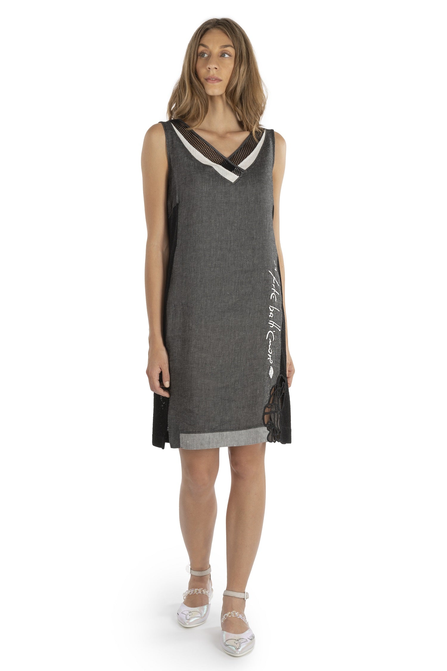 The ELISA CAVALETTI Nero dress has a summery black and grey design with a striking inscription. The knee-length cut and V-neck give the dress a modern, feminine touch. Lightweight and comfortable, it is perfect for warm days and stylish appearances.