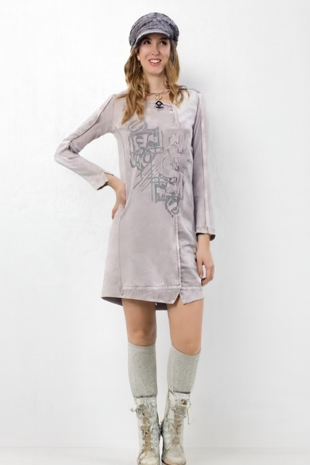 Long-sleeved dress in old pink, decorated with small rhinestones and print. The dress has a beautiful V-neck.
