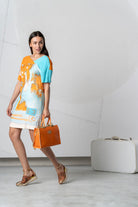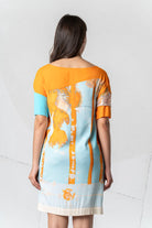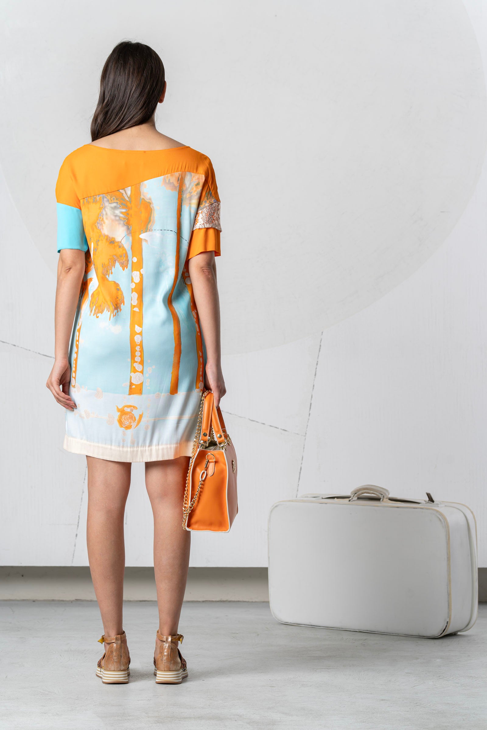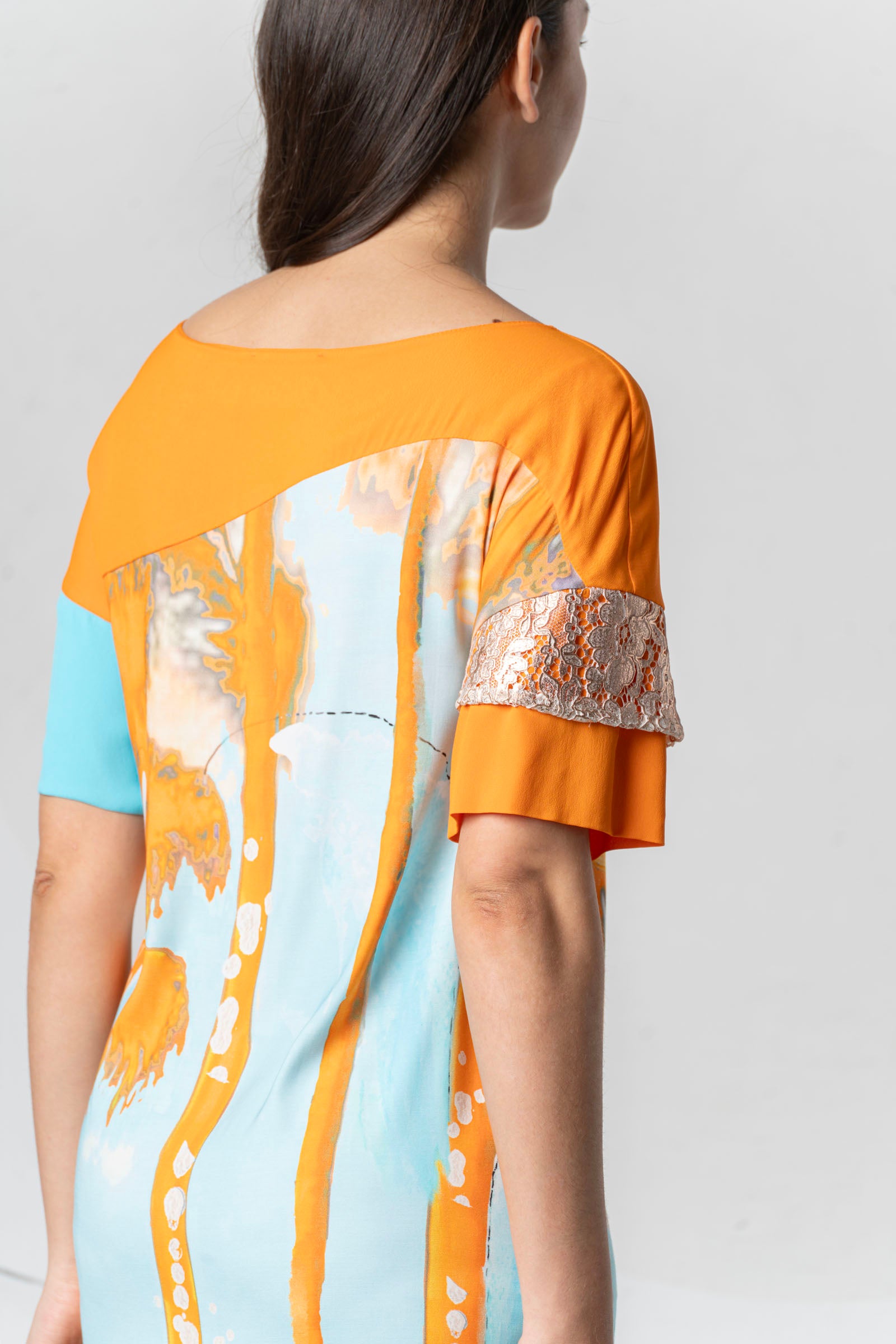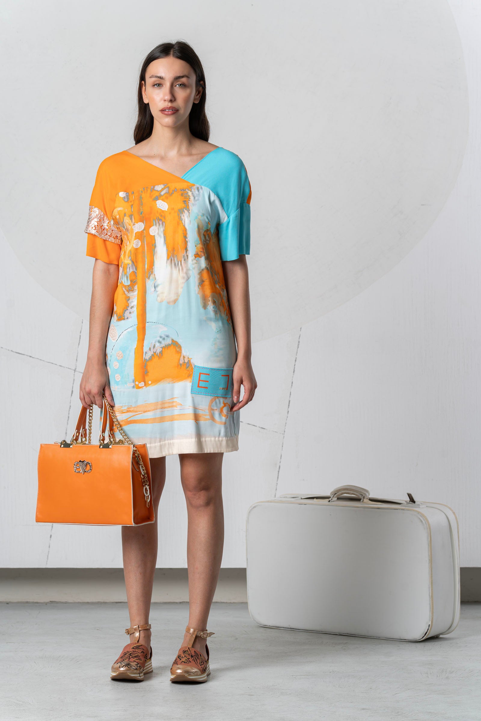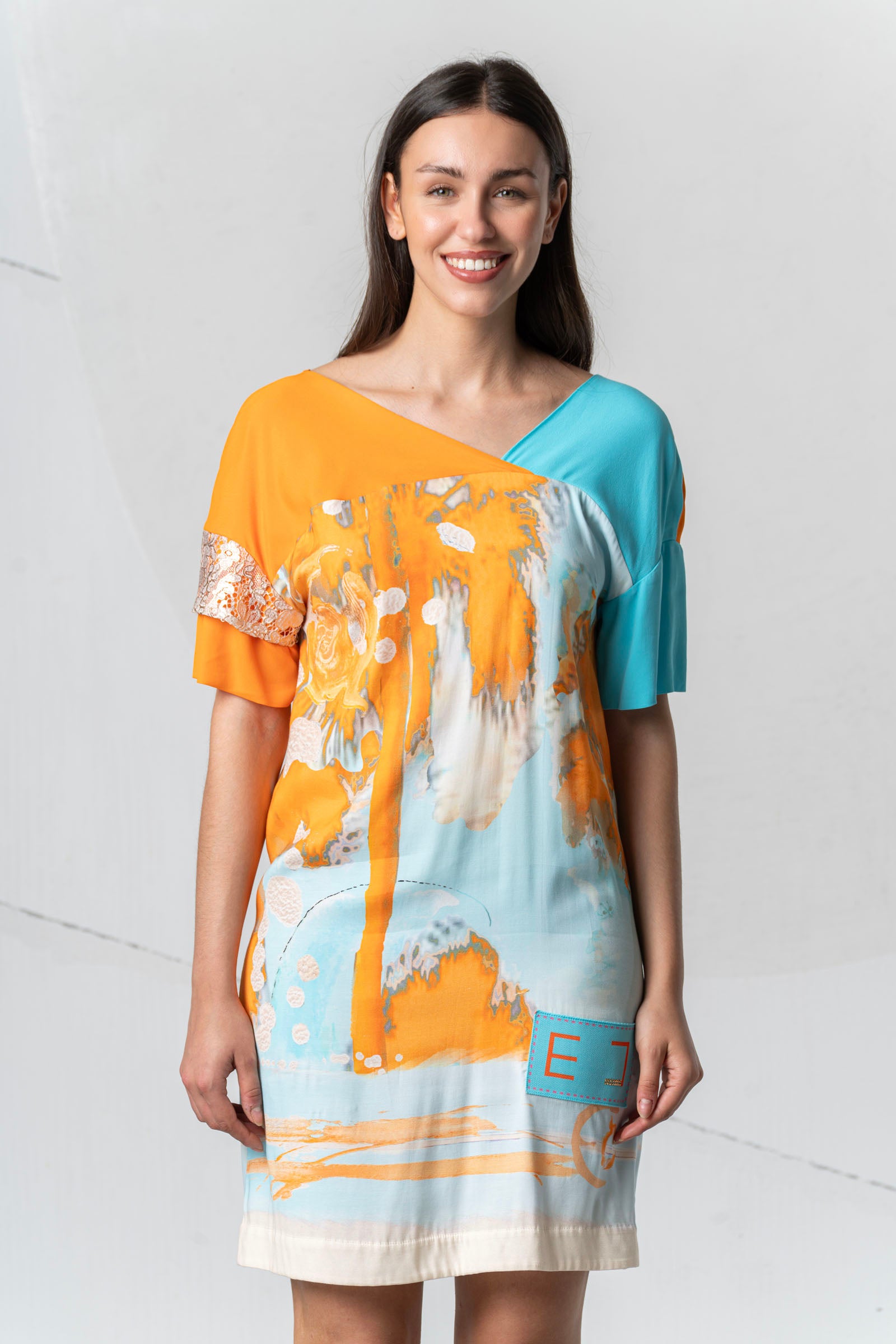 Experience the ultimate head-turner with the ELISA CAVALETTI dress from St. Aironi! This stylish dress boasts an exciting interplay of orange and turquoise colors and will make you stand out. Whether at the office or at a party, this dress will give you a unique look.