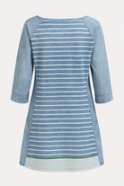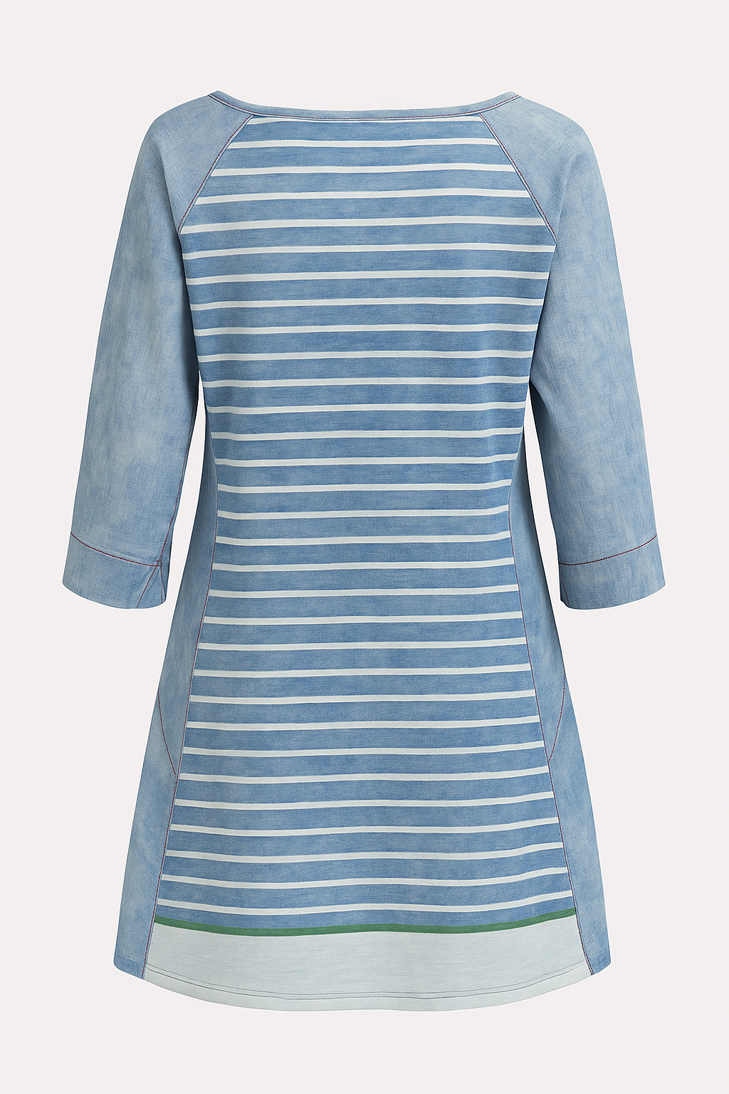 Light blue striped dress with various appliqués.