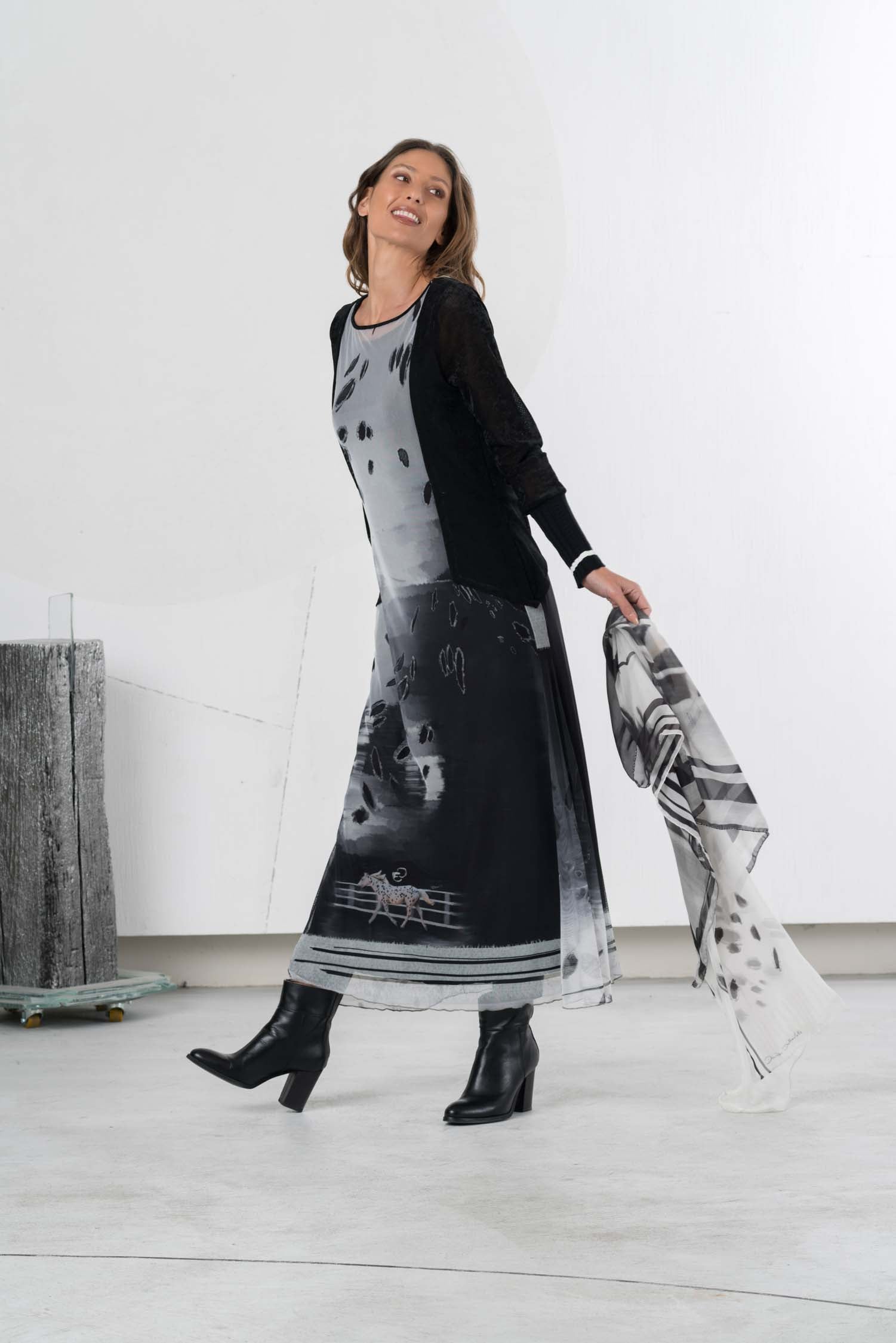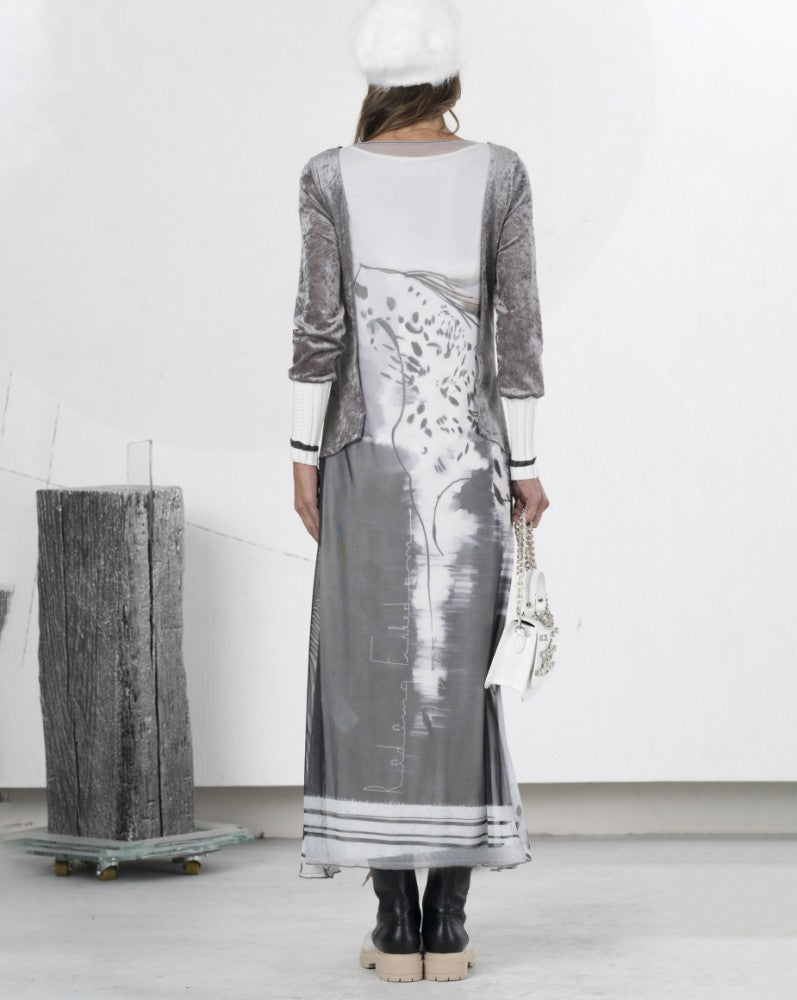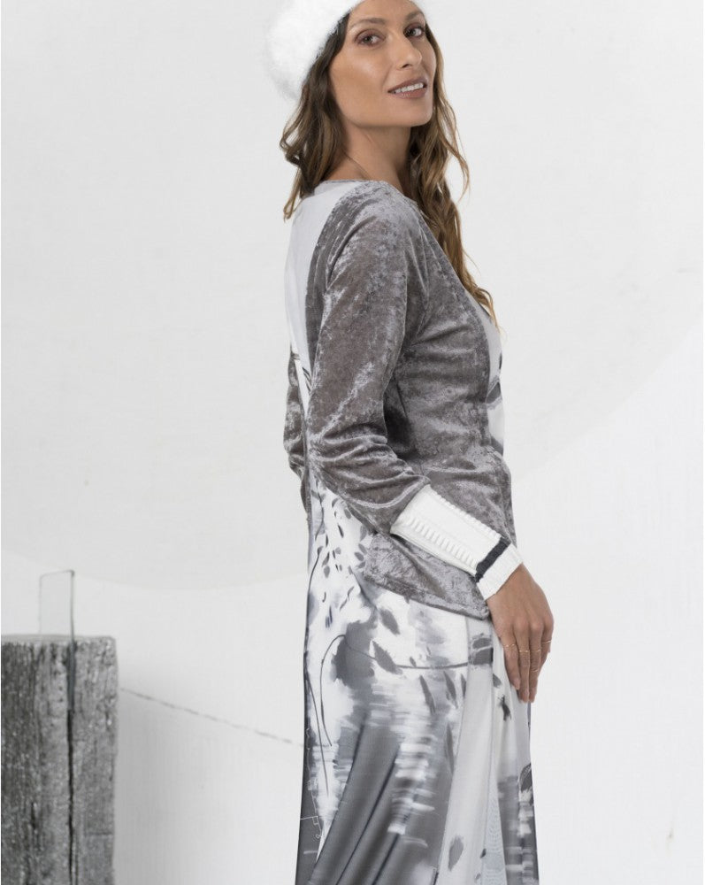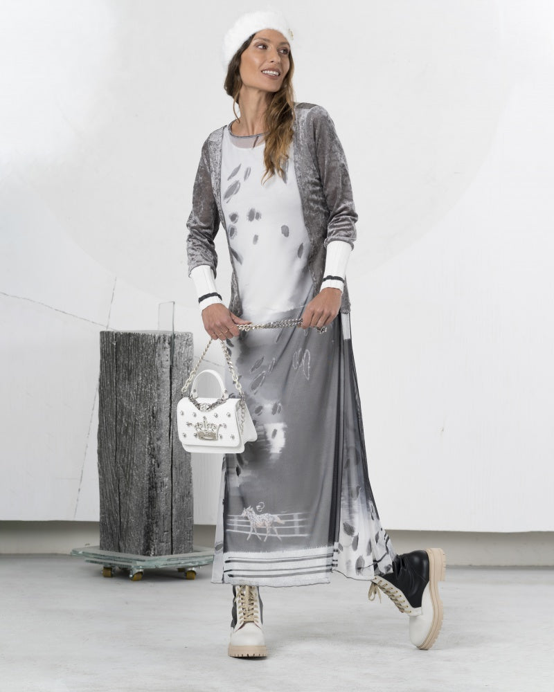 This long dress impresses with its stylish color contrast in black/grey and white/grey. The long sleeves made of velvety material give the dress a luxurious feel and add elegant accents. The subtle print design harmoniously completes the overall look and makes the dress a versatile choice for sophisticated occasions.