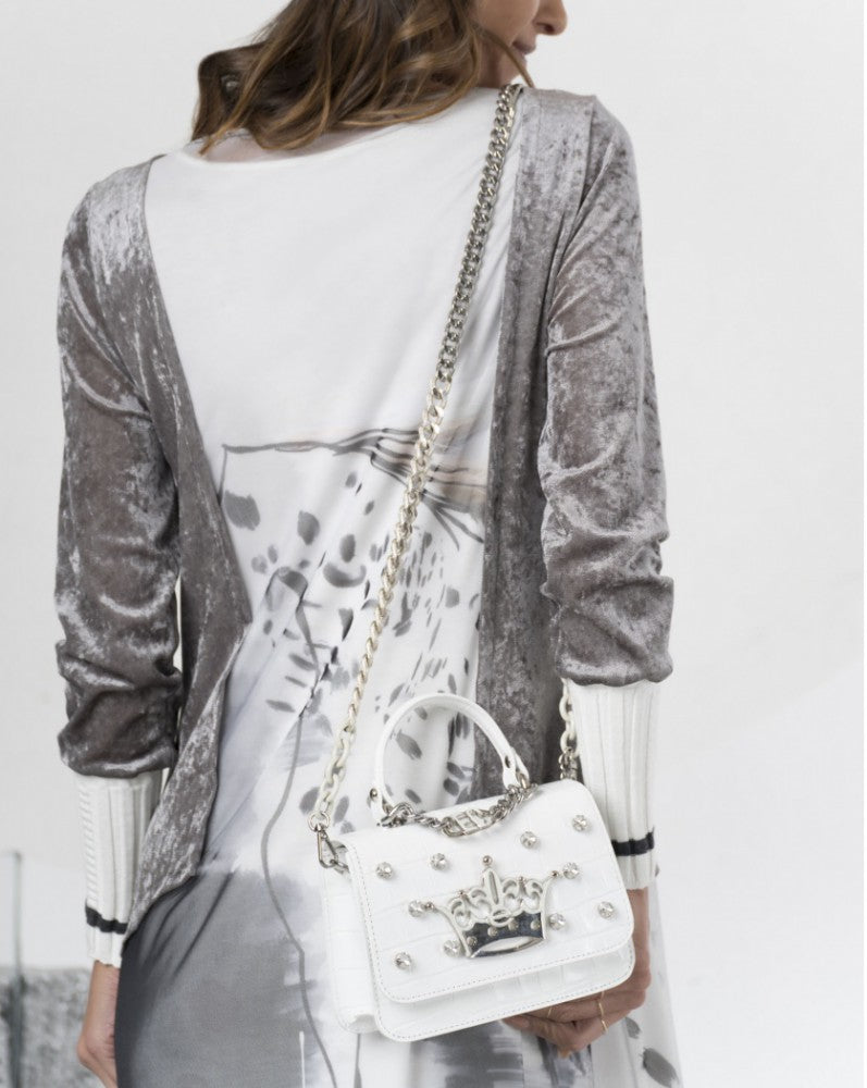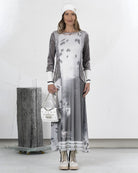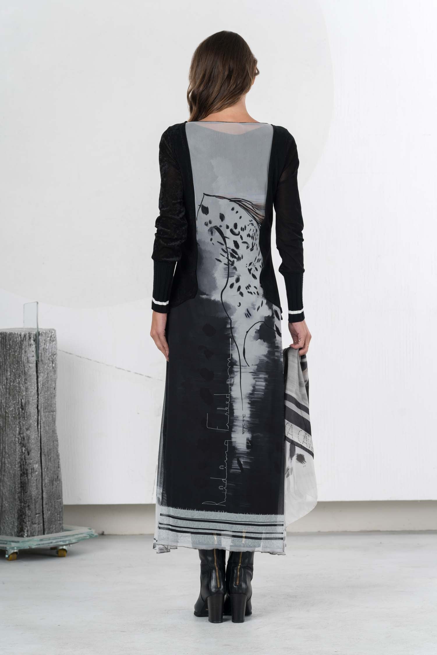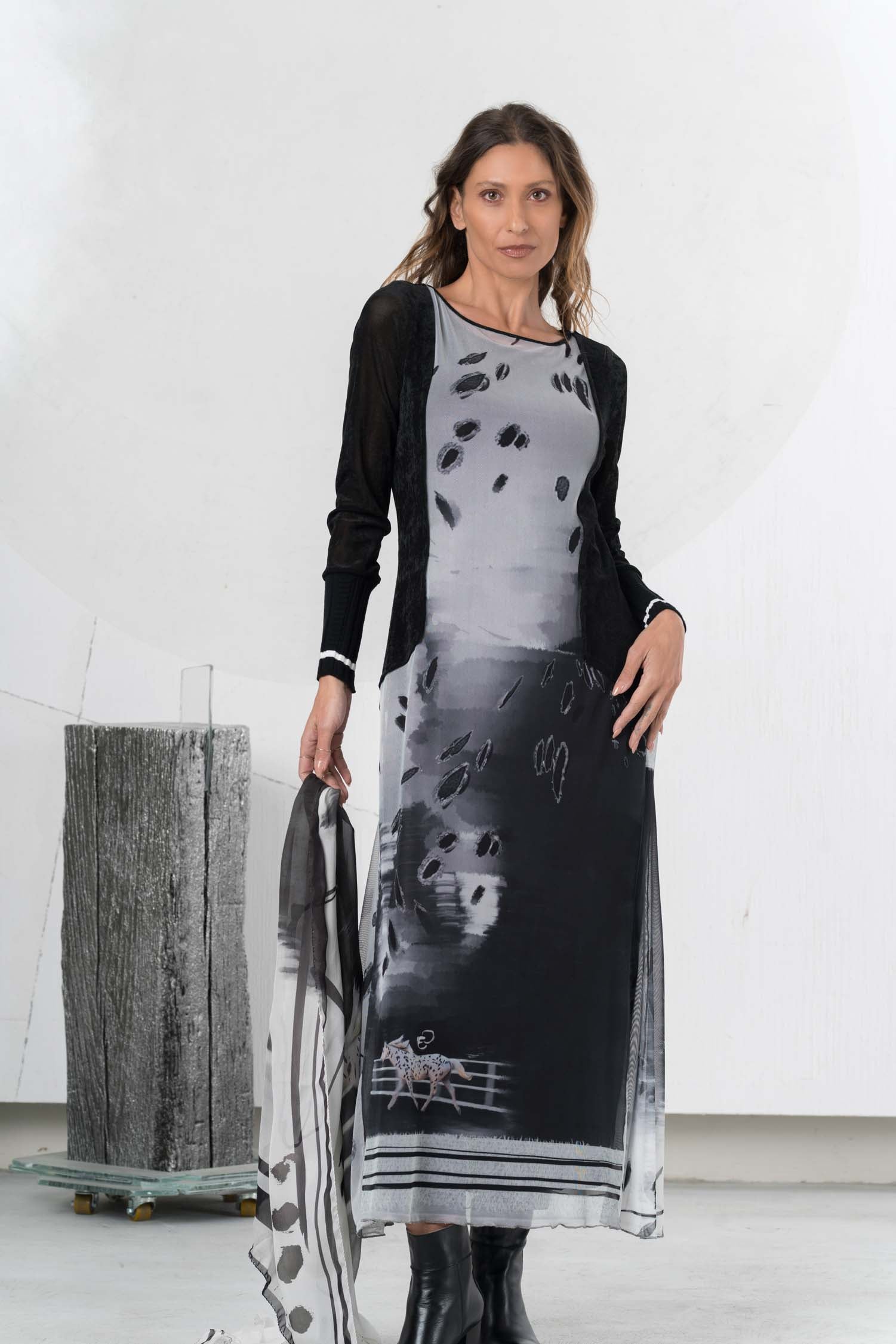 This long dress impresses with its stylish color contrast in black/grey and white/grey. The long sleeves made of velvety material give the dress a luxurious feel and add elegant accents. The subtle print design harmoniously completes the overall look and makes the dress a versatile choice for sophisticated occasions.