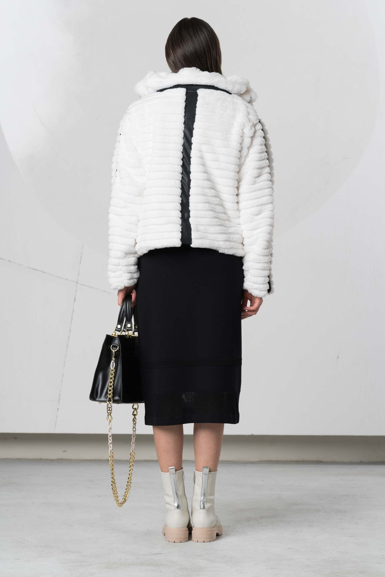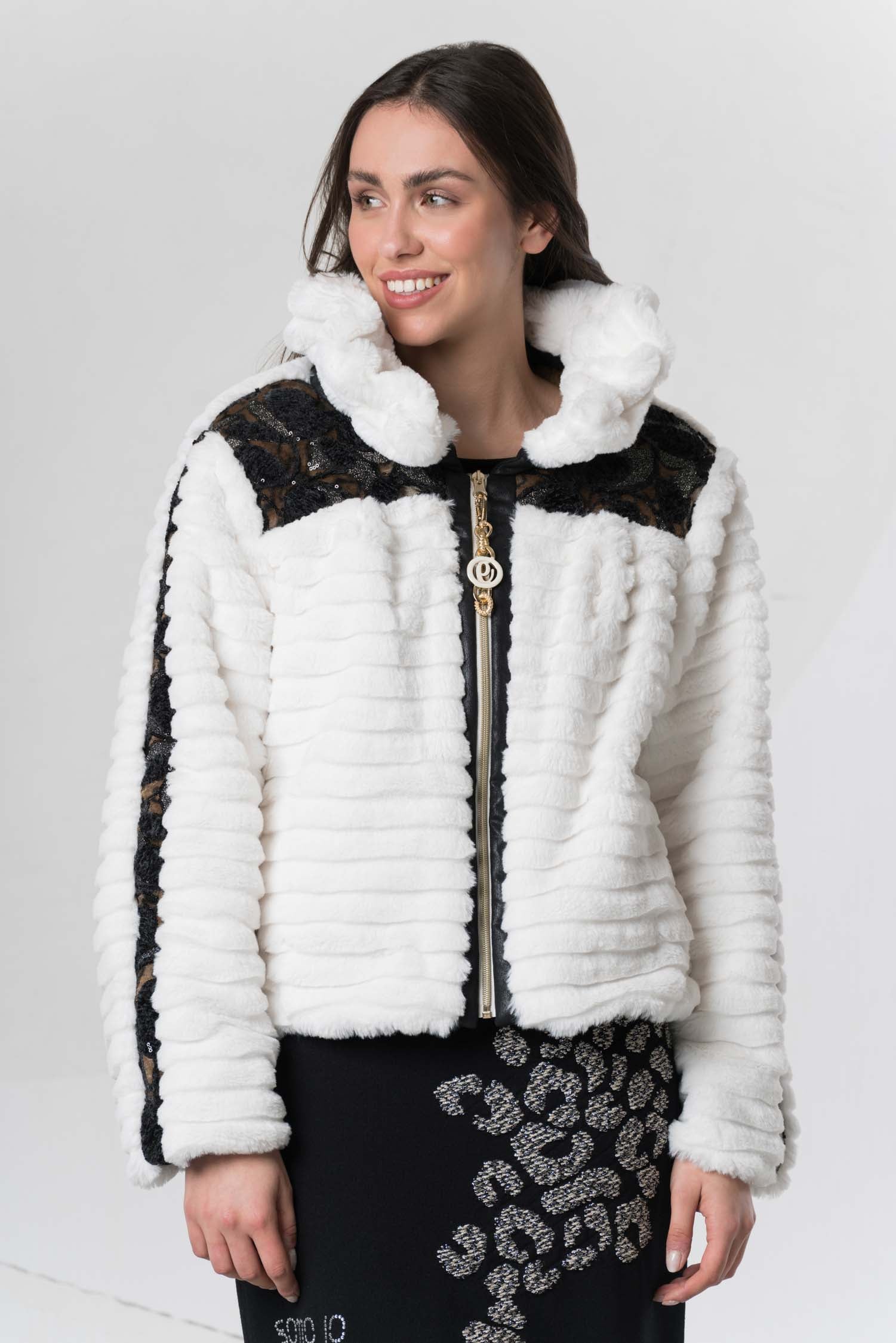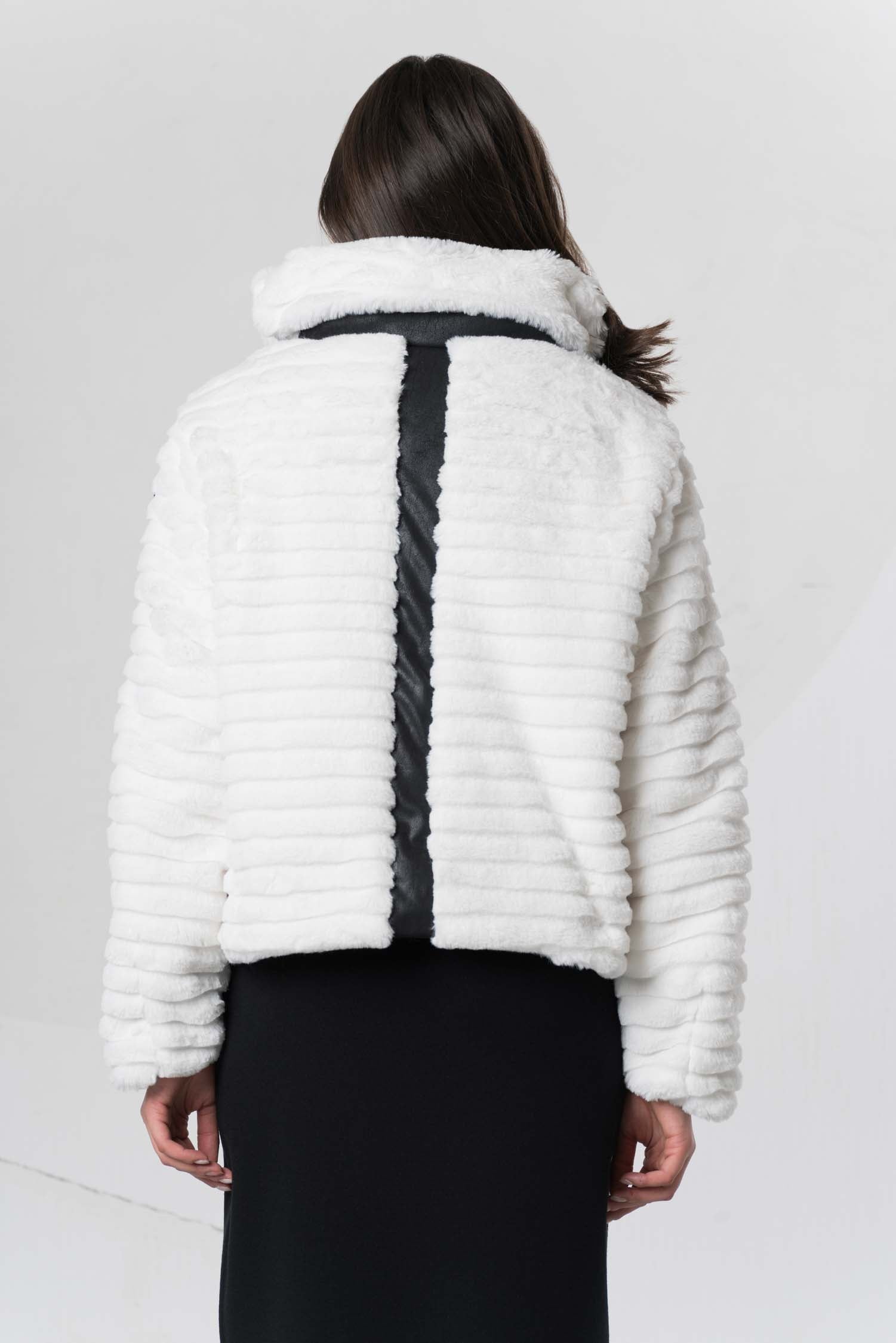This stylish jacket impresses with its high-contrast black and white design and a high fur collar that not only provides warmth but also adds an elegant touch. The clean color scheme underscores a modern, timeless aesthetic that can be combined in many ways. Ideal for cool days, this jacket combines comfort with a sophisticated look.