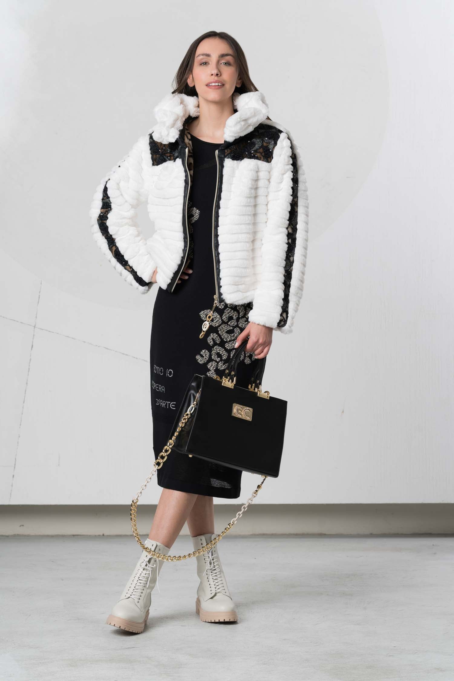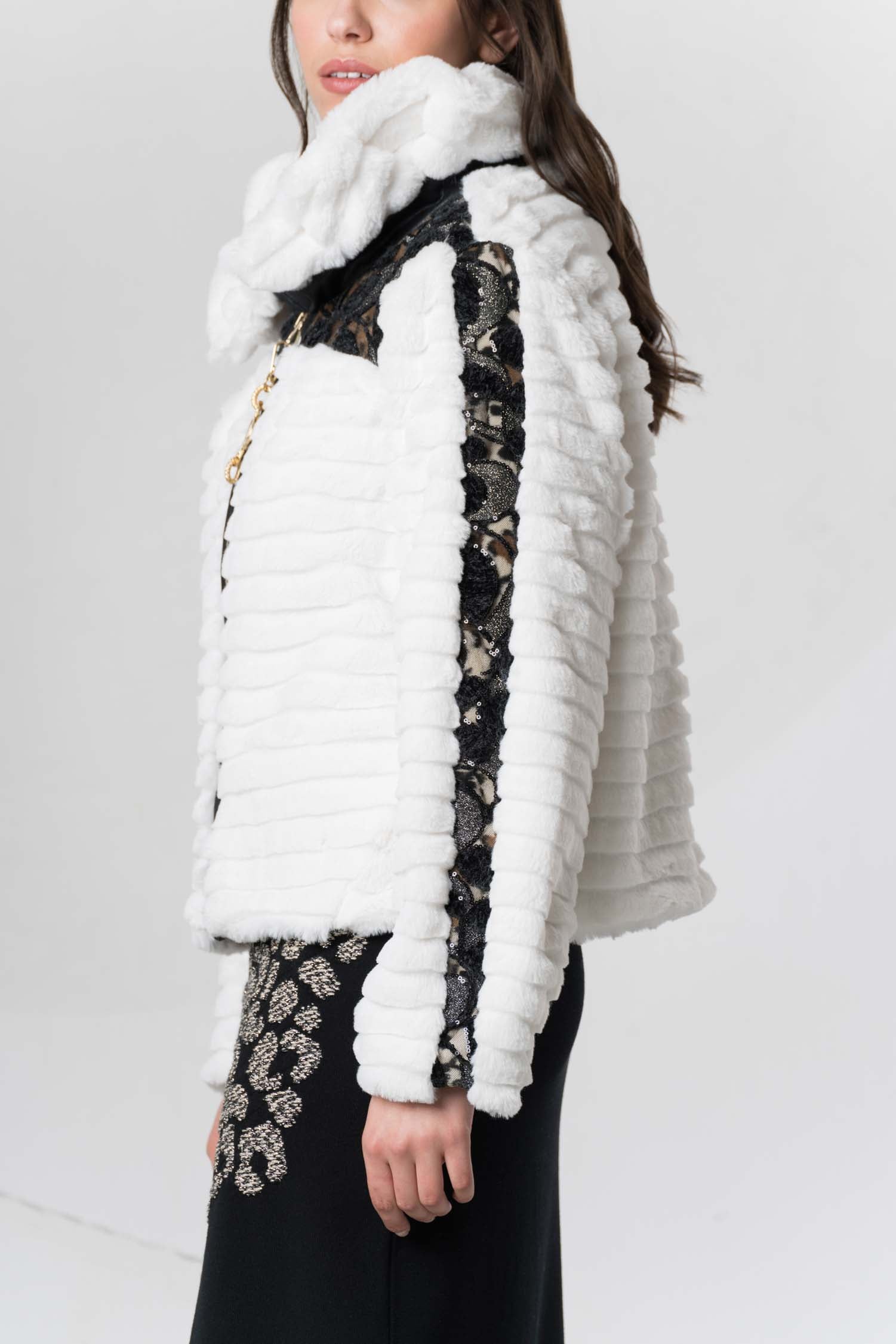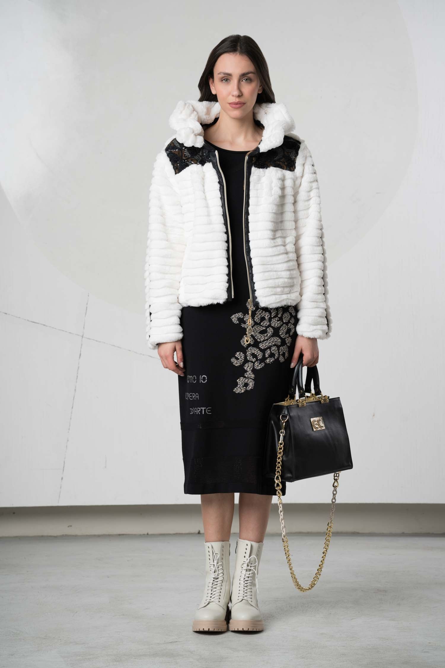 This stylish jacket impresses with its high-contrast black and white design and a high fur collar that not only provides warmth but also adds an elegant touch. The clean color scheme underscores a modern, timeless aesthetic that can be combined in many ways. Ideal for cool days, this jacket combines comfort with a sophisticated look.
