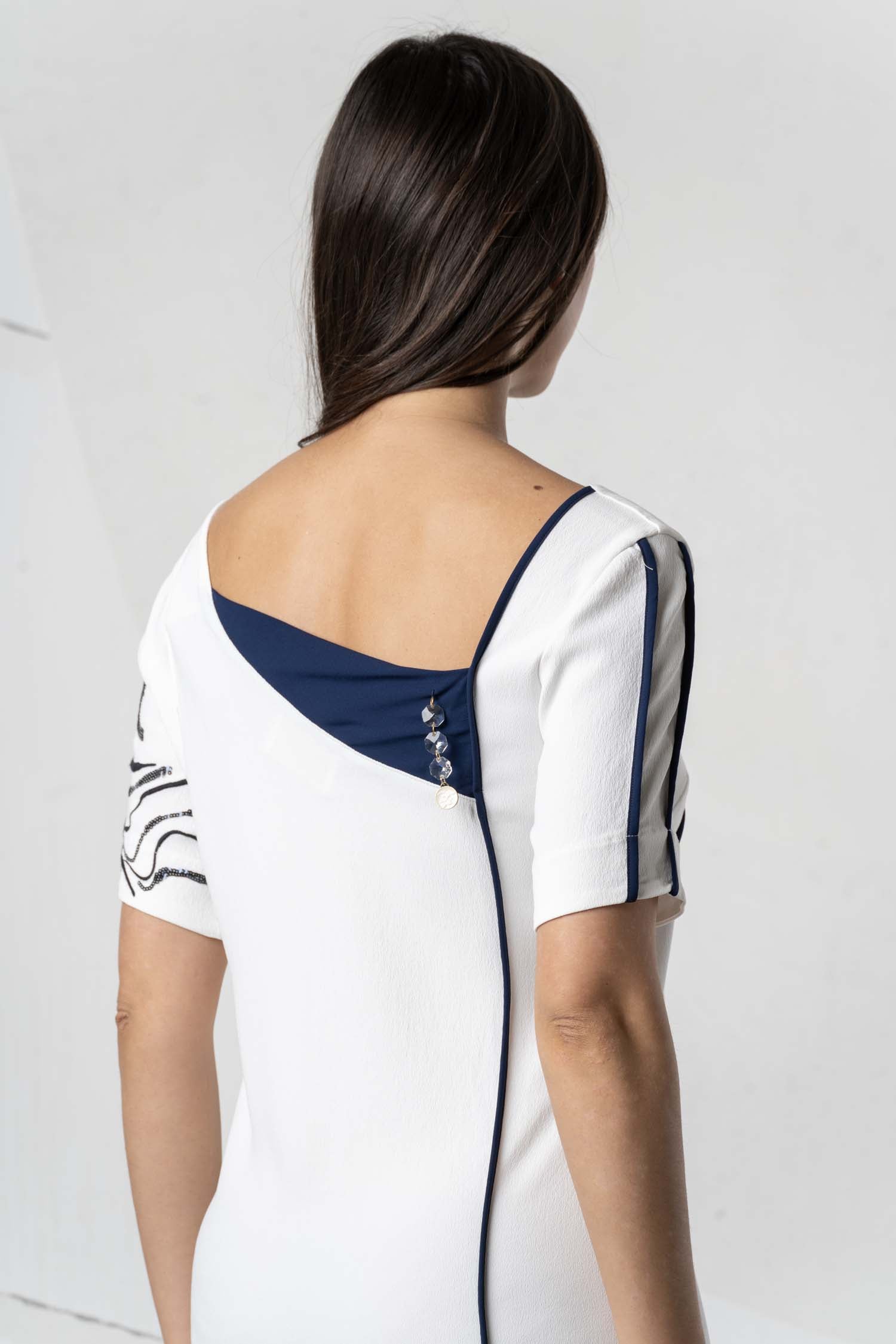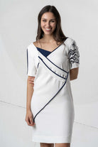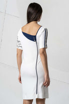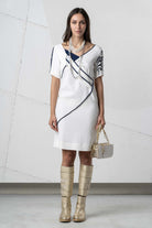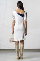 This knee-length dress captivates with its elegant white, stylishly accentuated by dark blue appliqués. The high-quality cut ensures a perfect fit and emphasizes a timeless silhouette. Ideal for sophisticated occasions, it offers a harmonious combination of understated elegance and modern details.