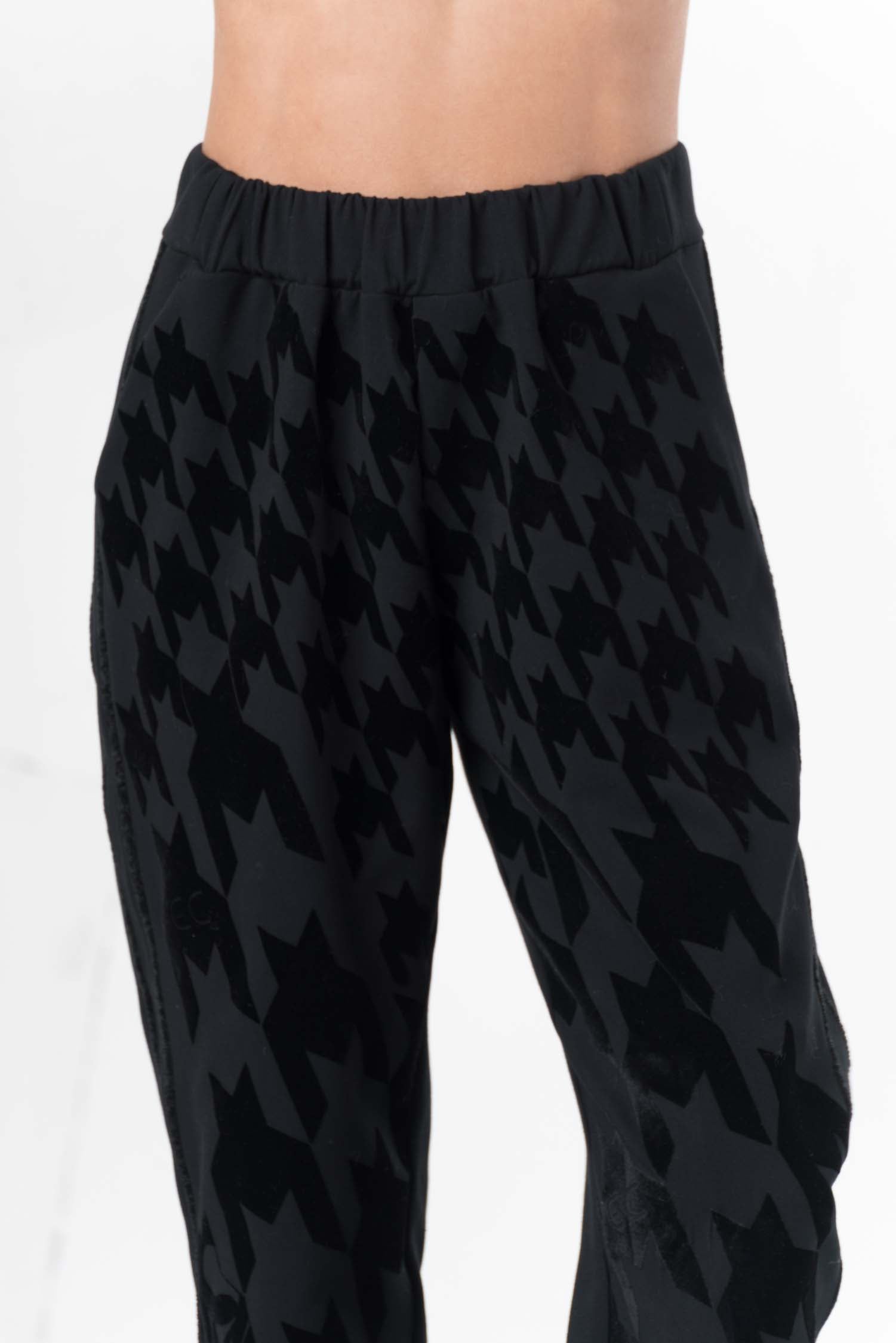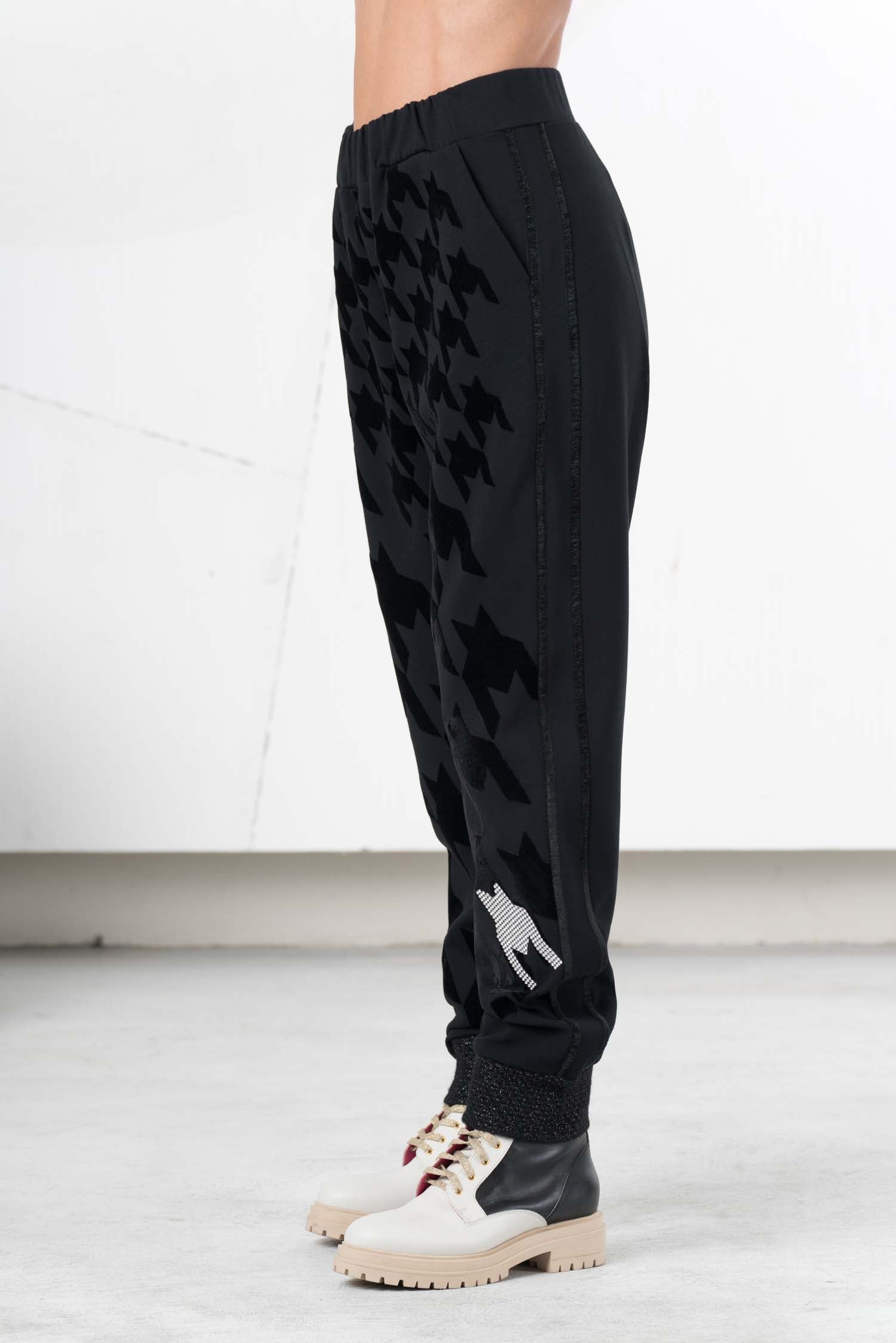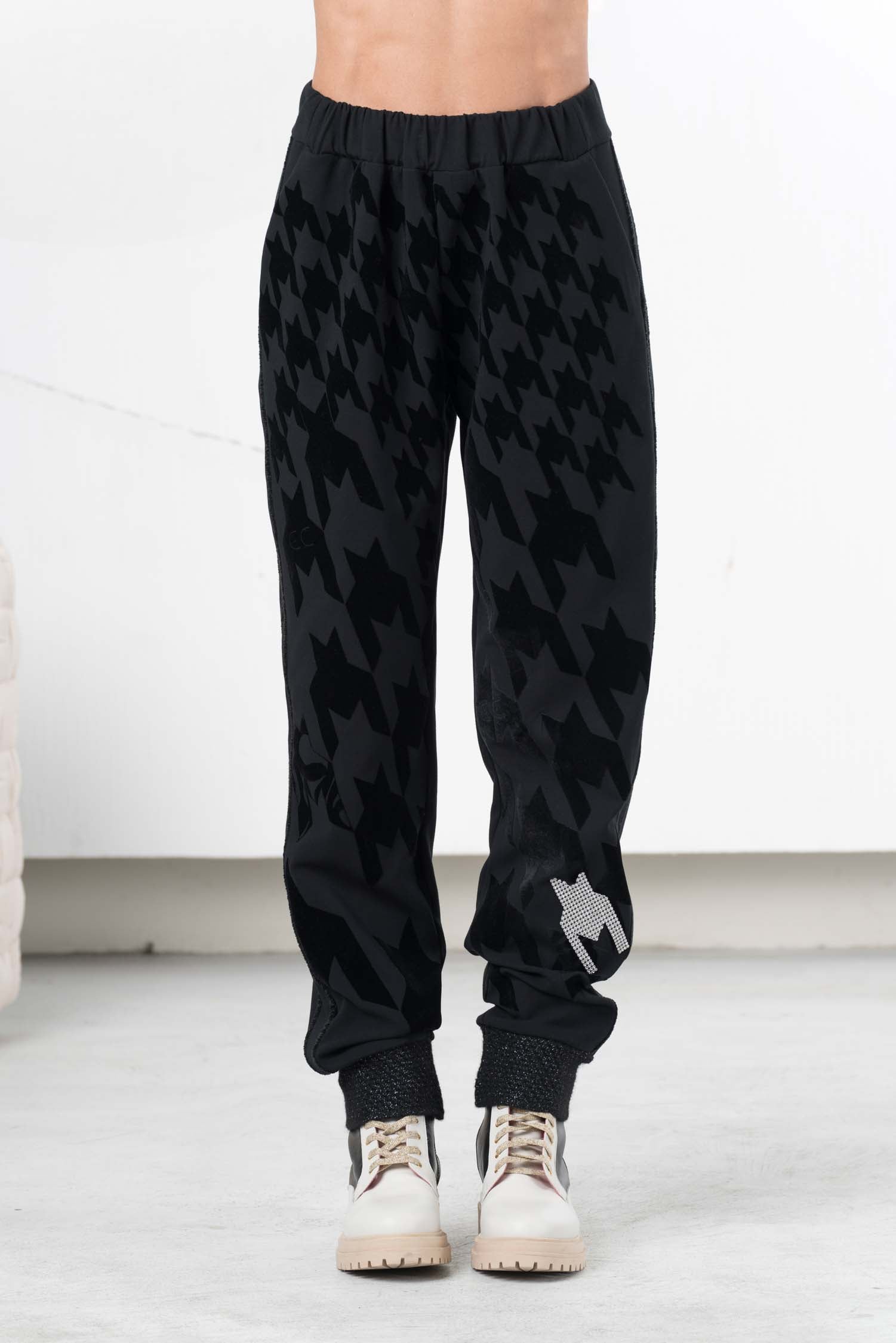 These black diamond-patterned trousers impress with their extravagant design and elegant use of silver rhinestones, which add a sparkling accent. The comfortable material guarantees exceptional comfort, while the sophisticated diamond pattern gives the trousers a modern, stylish look. Ideal for special occasions or sophisticated everyday wear, this style combines comfort with a touch of luxury.