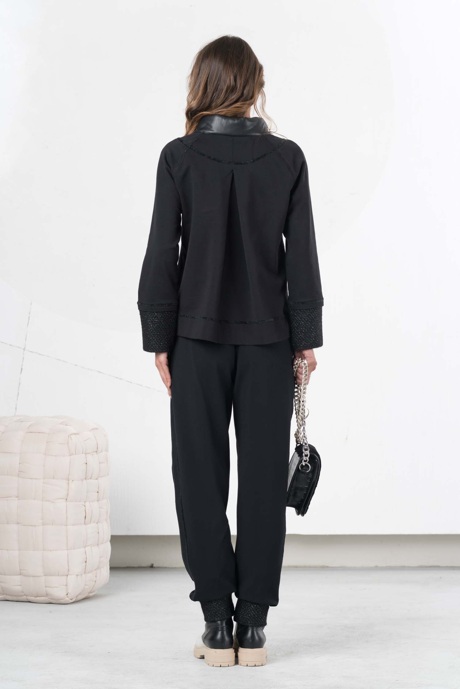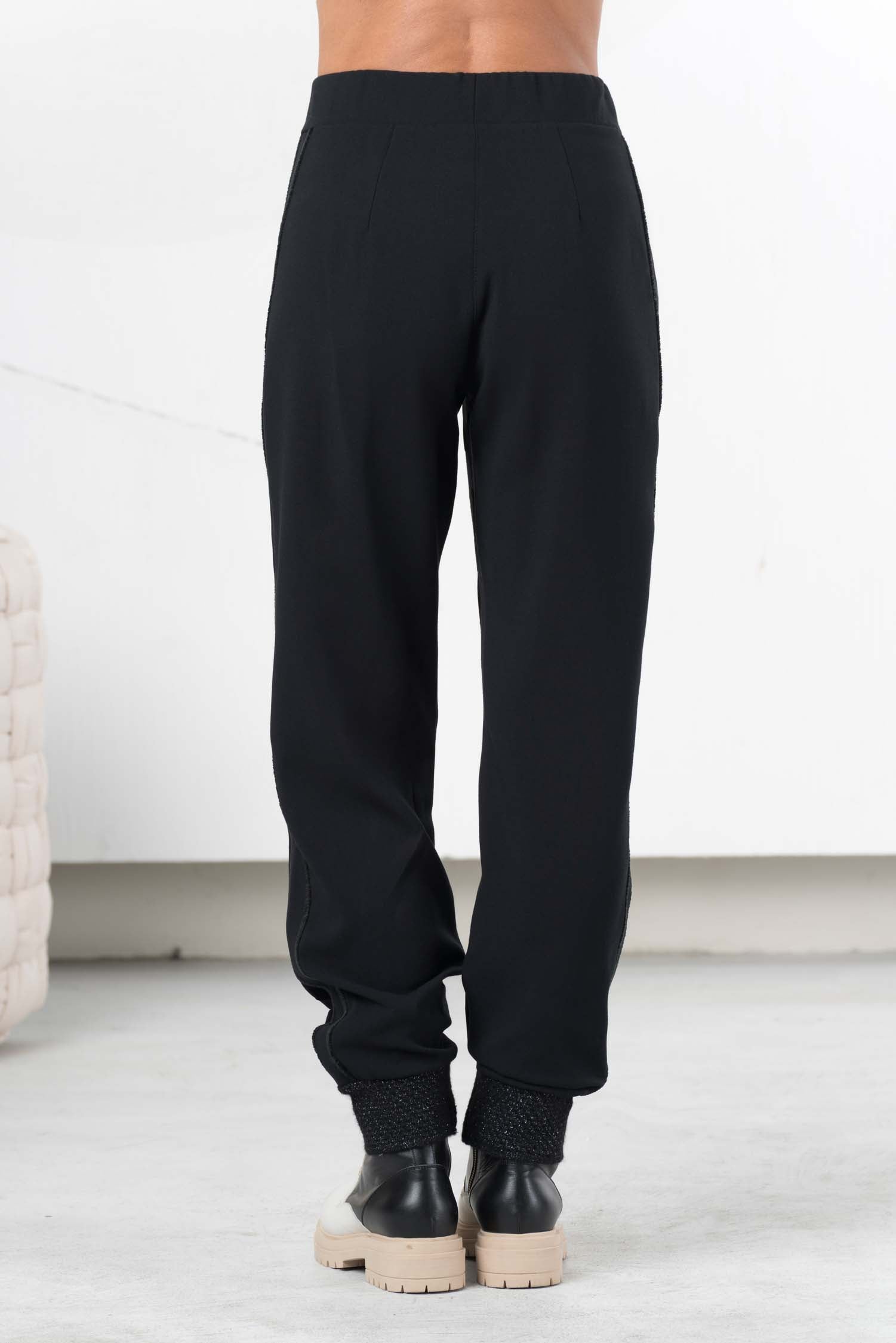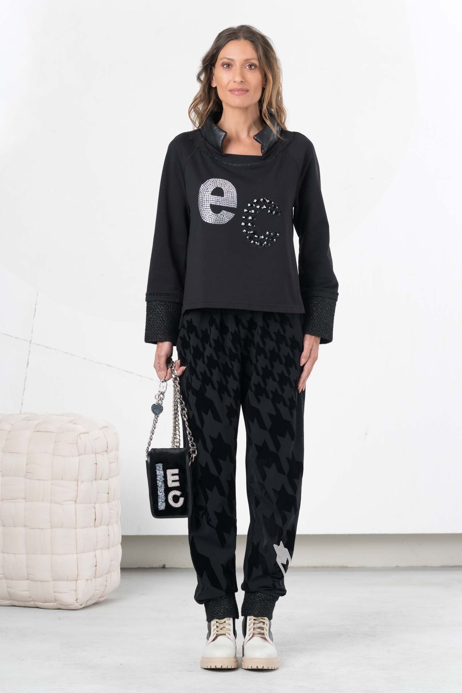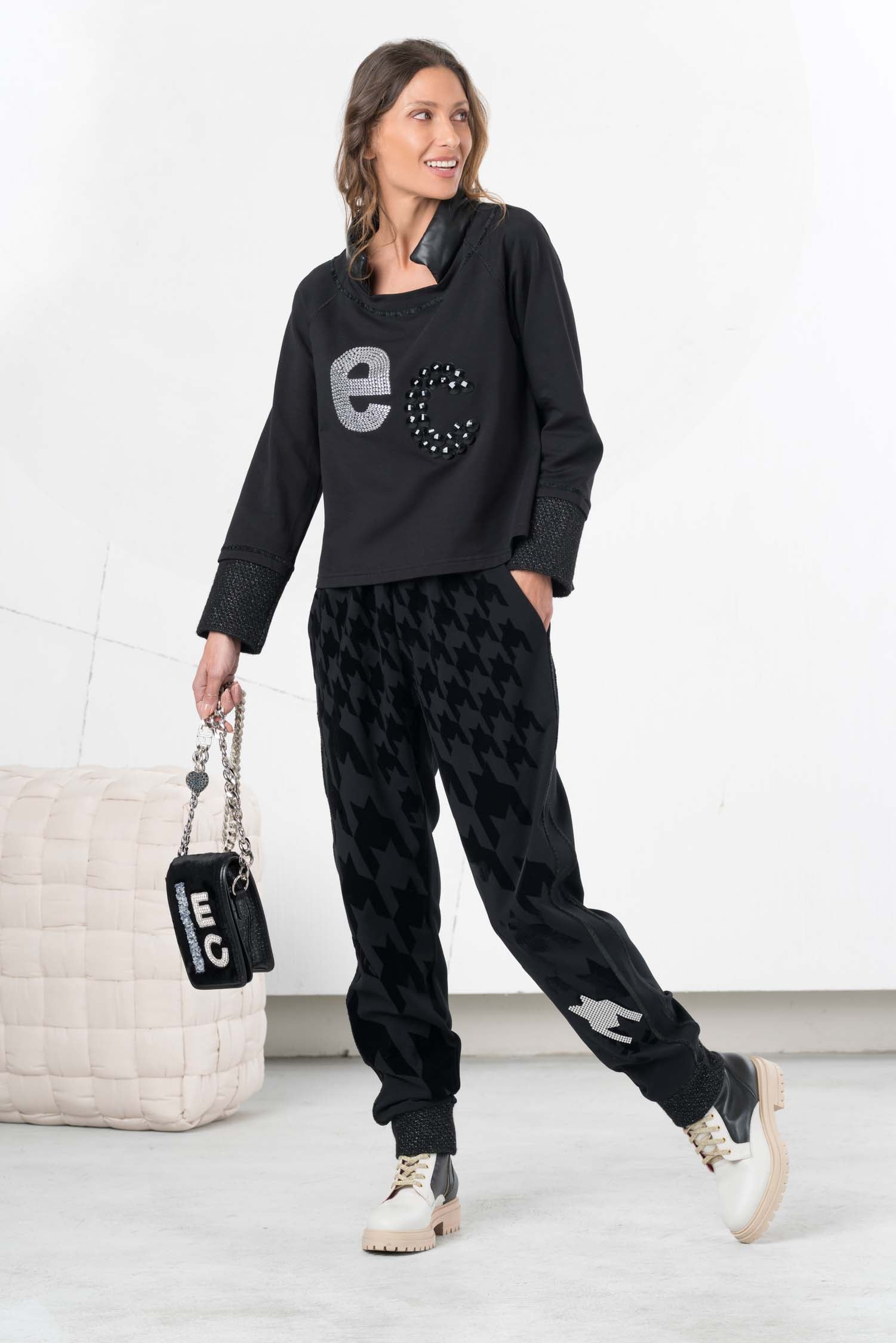 These black diamond-patterned trousers impress with their extravagant design and elegant use of silver rhinestones, which add a sparkling accent. The comfortable material guarantees exceptional comfort, while the sophisticated diamond pattern gives the trousers a modern, stylish look. Ideal for special occasions or sophisticated everyday wear, this style combines comfort with a touch of luxury.
