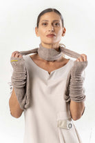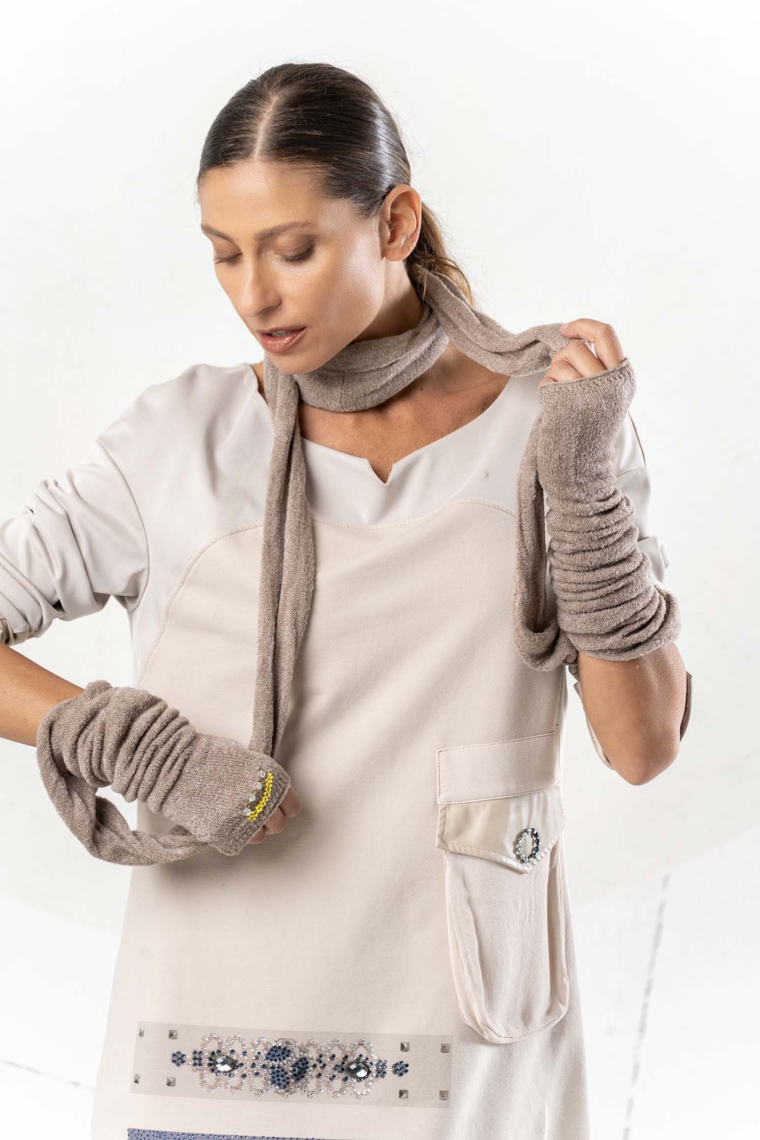 This innovative infinity scarf combines comfort and style in one practical accessory. The knitted sleeves provide extra warmth and offer versatile wearing options – whether worn classically around the neck or pulled over the arms. The warm beige and brown tones harmonize with almost any garment, effortlessly creating a cozy yet elegant look. The high-quality knit ensures lasting comfort, making this infinity scarf an indispensable companion throughout the colder months. A thoughtful design that perfectly blends functionality and fashion.