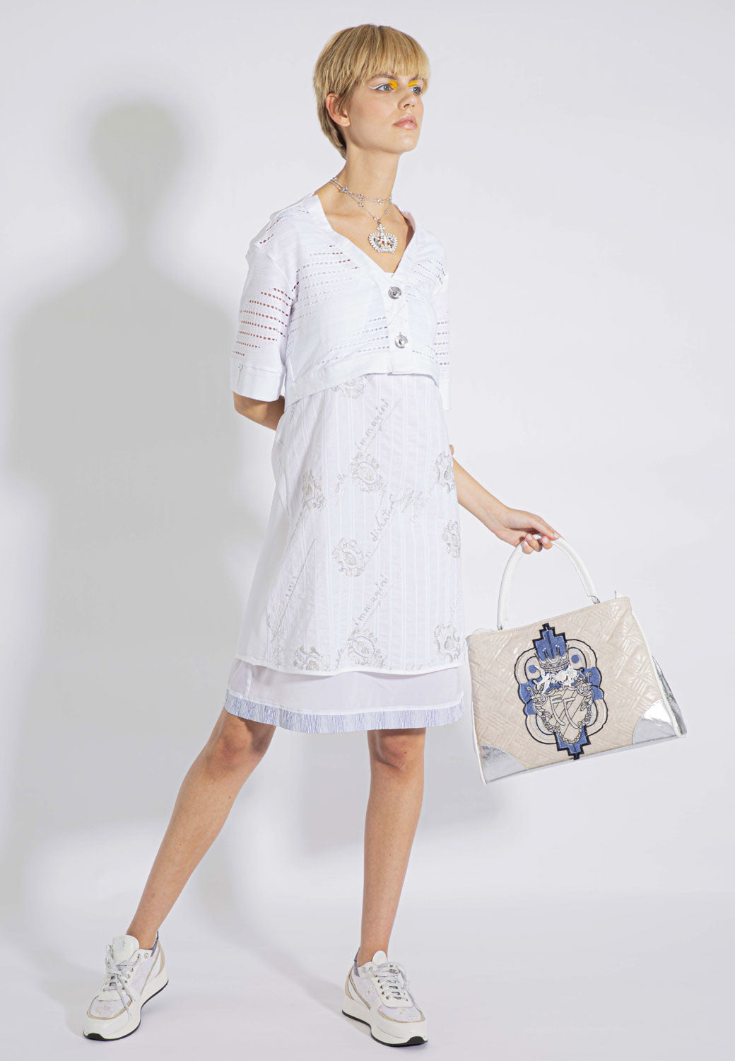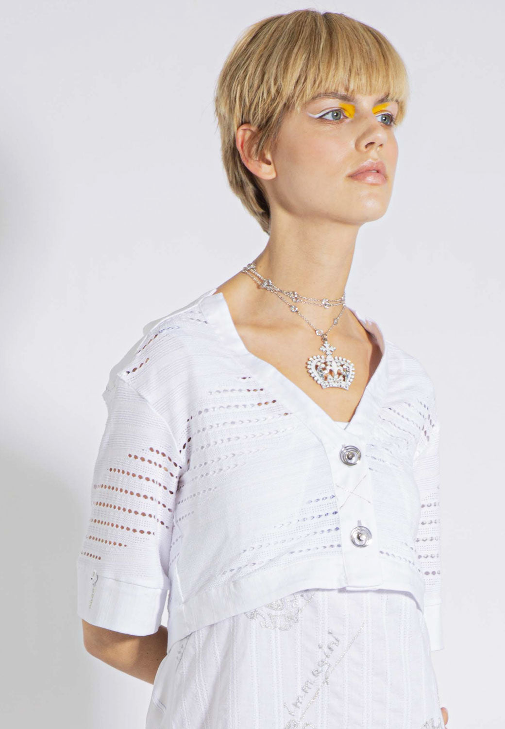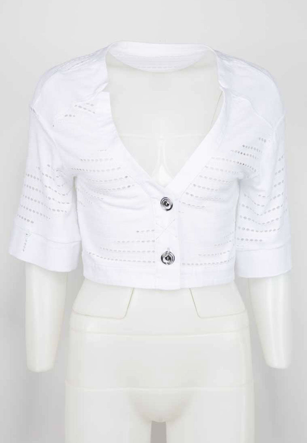 Discover the unique style of ELISA CAVALETTI with this charming white bolero jacket. The perforated pattern gives the garment a sophisticated touch and lets your skin shine through. Perfect for summer evenings and special occasions. Make a fashion statement with this jacket!