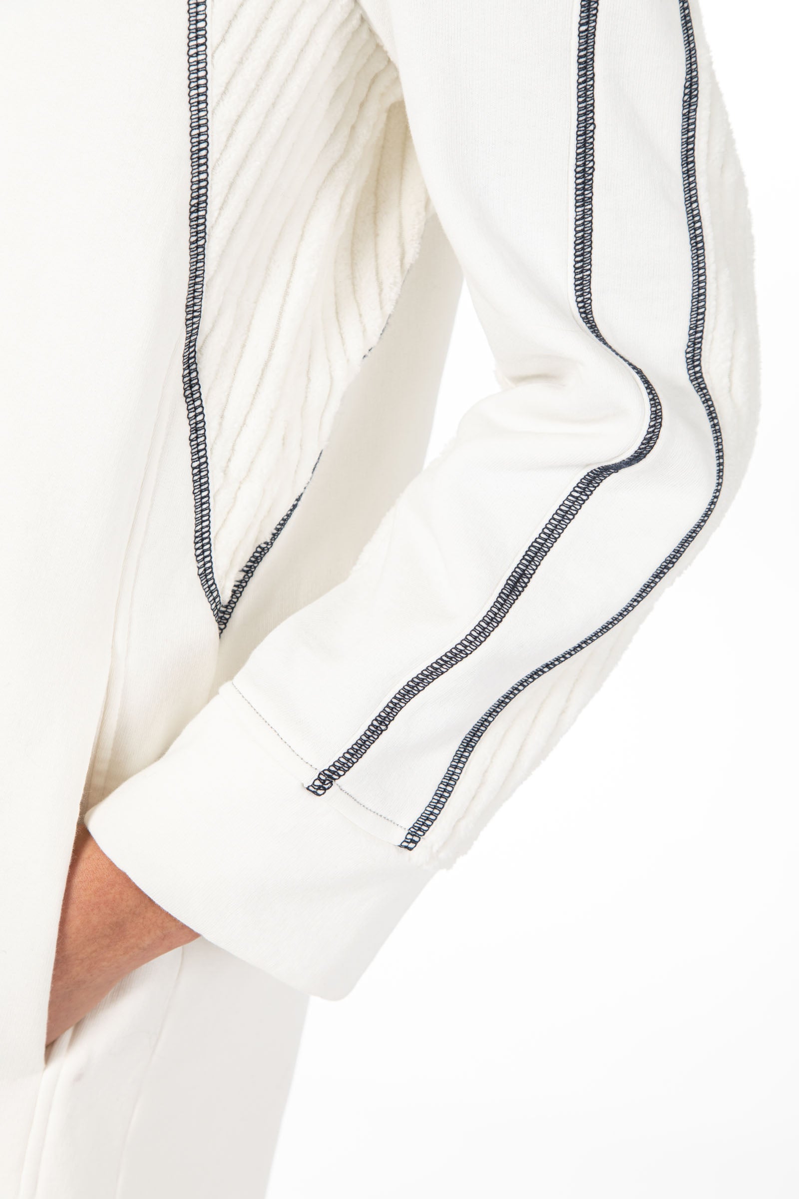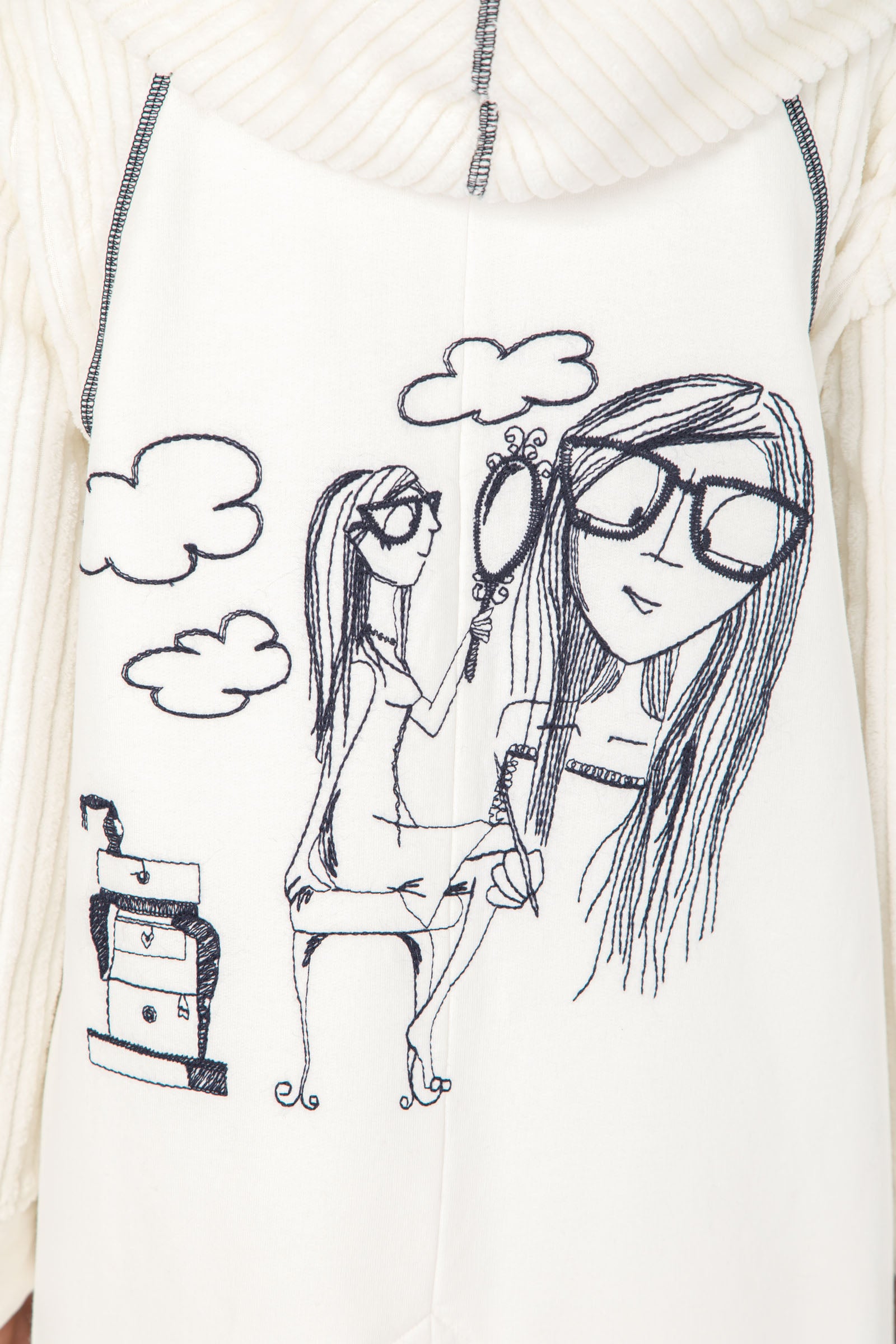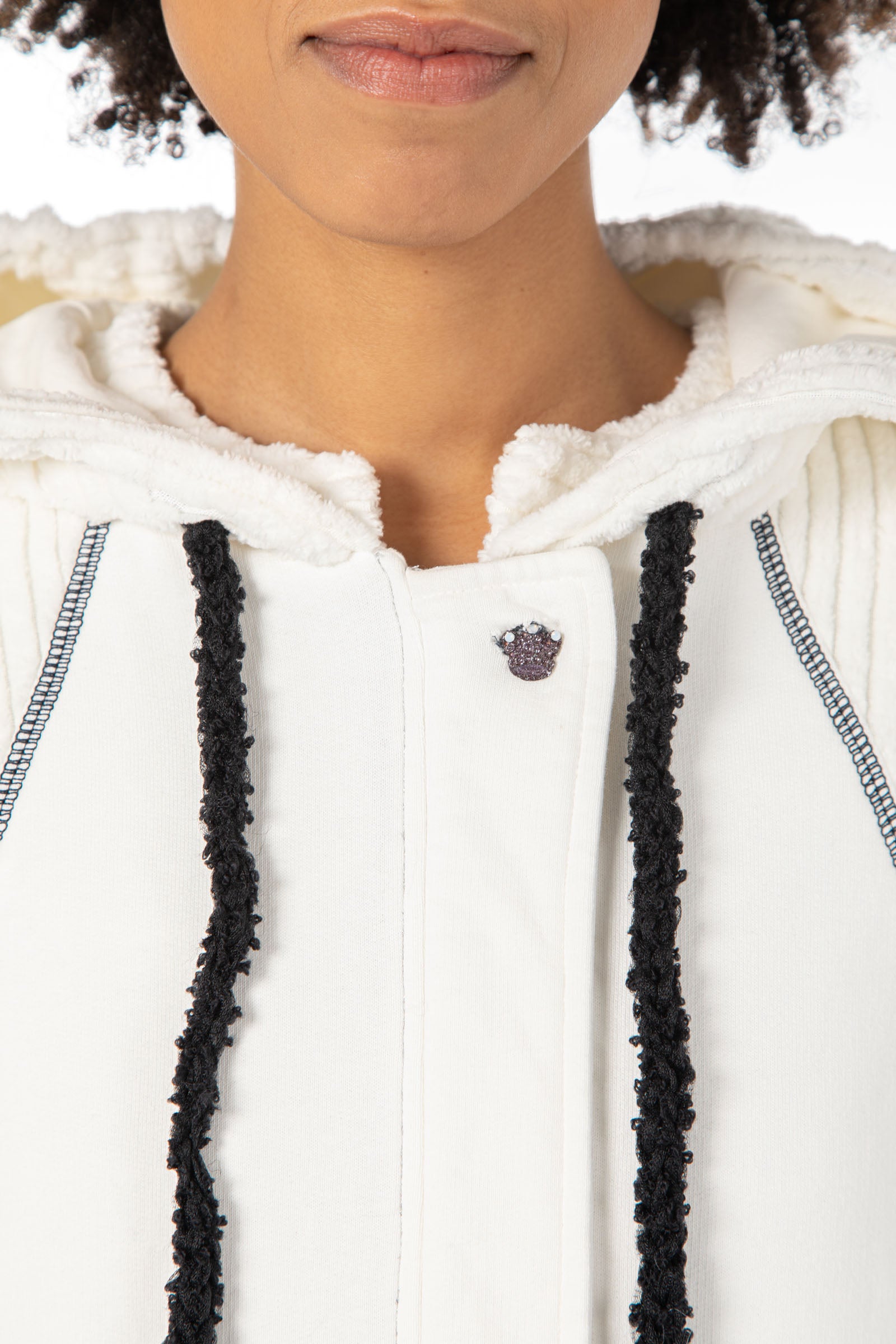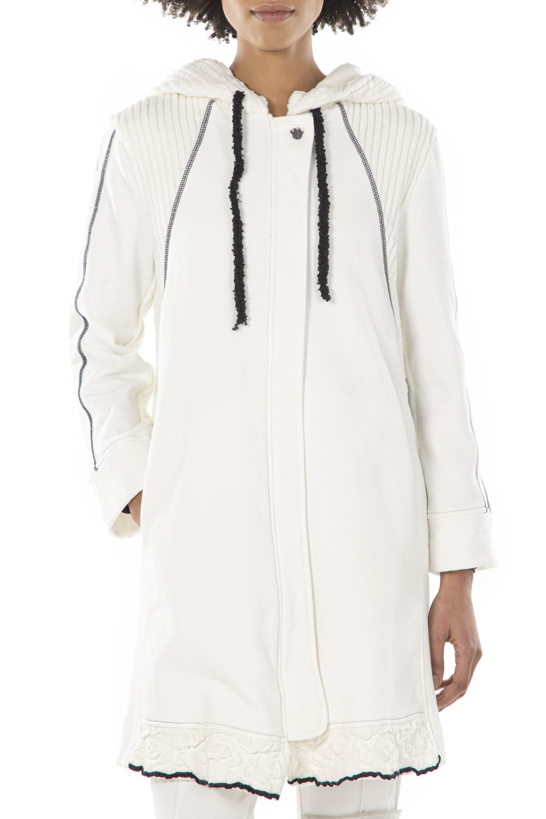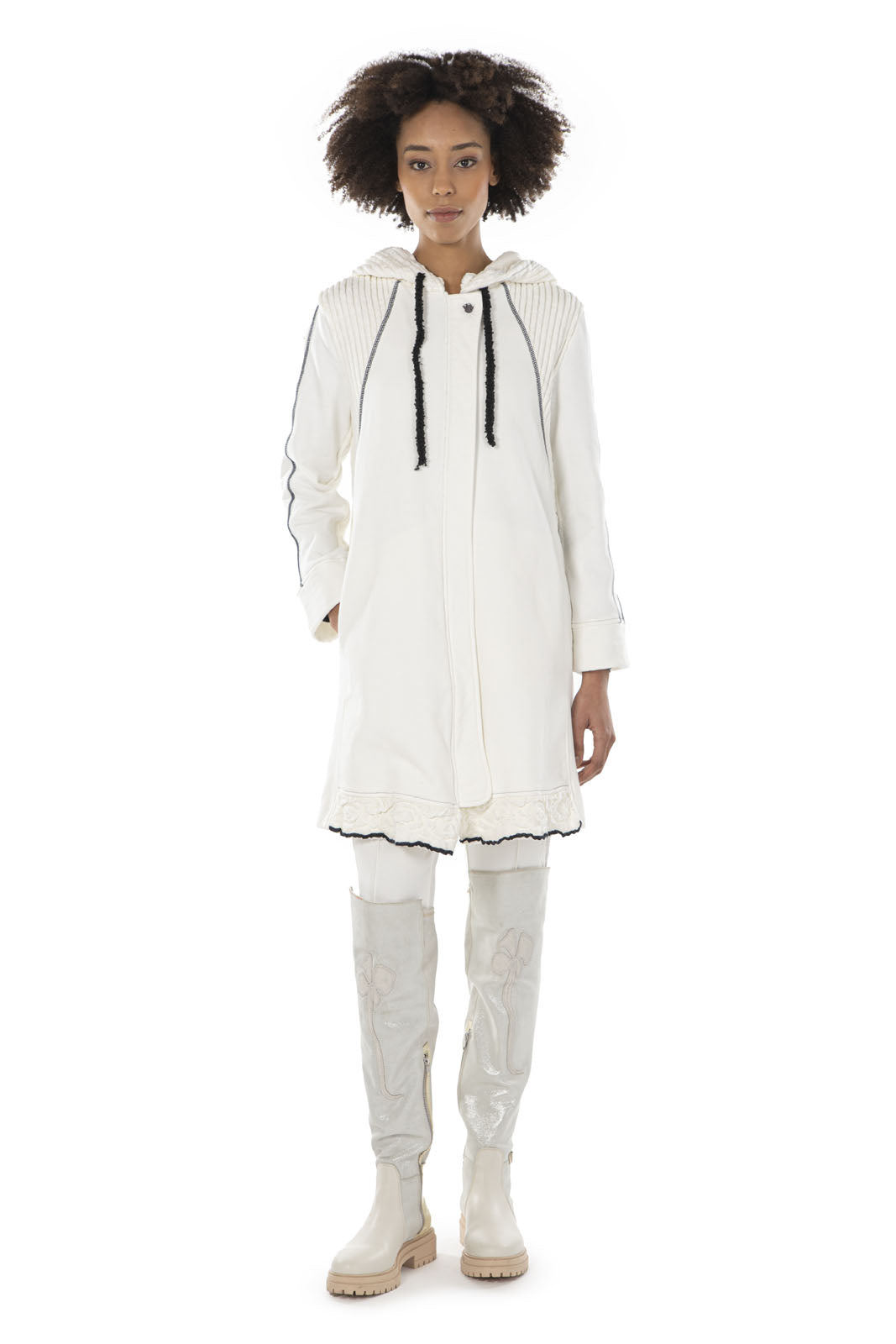 Beautiful, long, cream-colored jacket with a hood and a cute motif on the back.