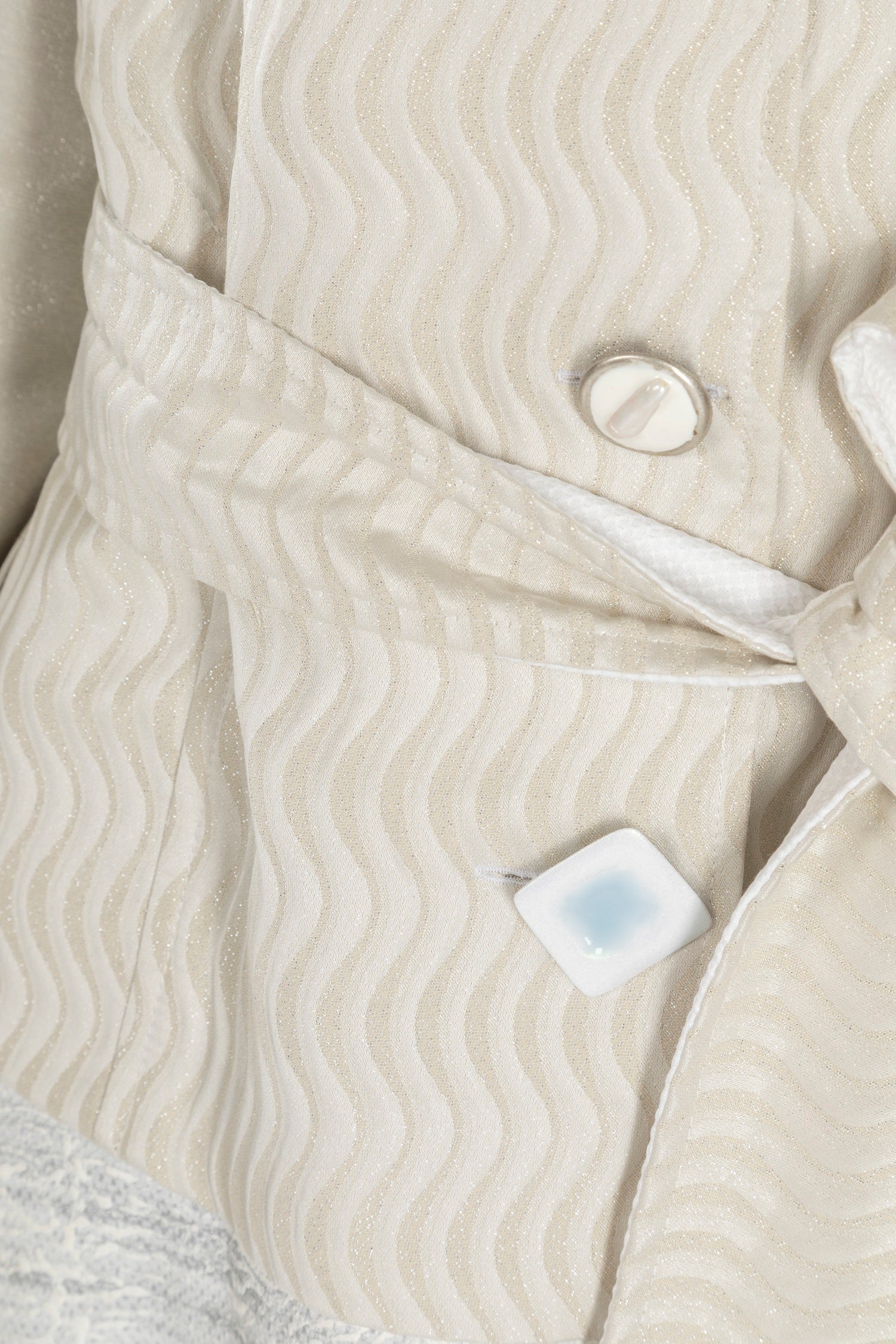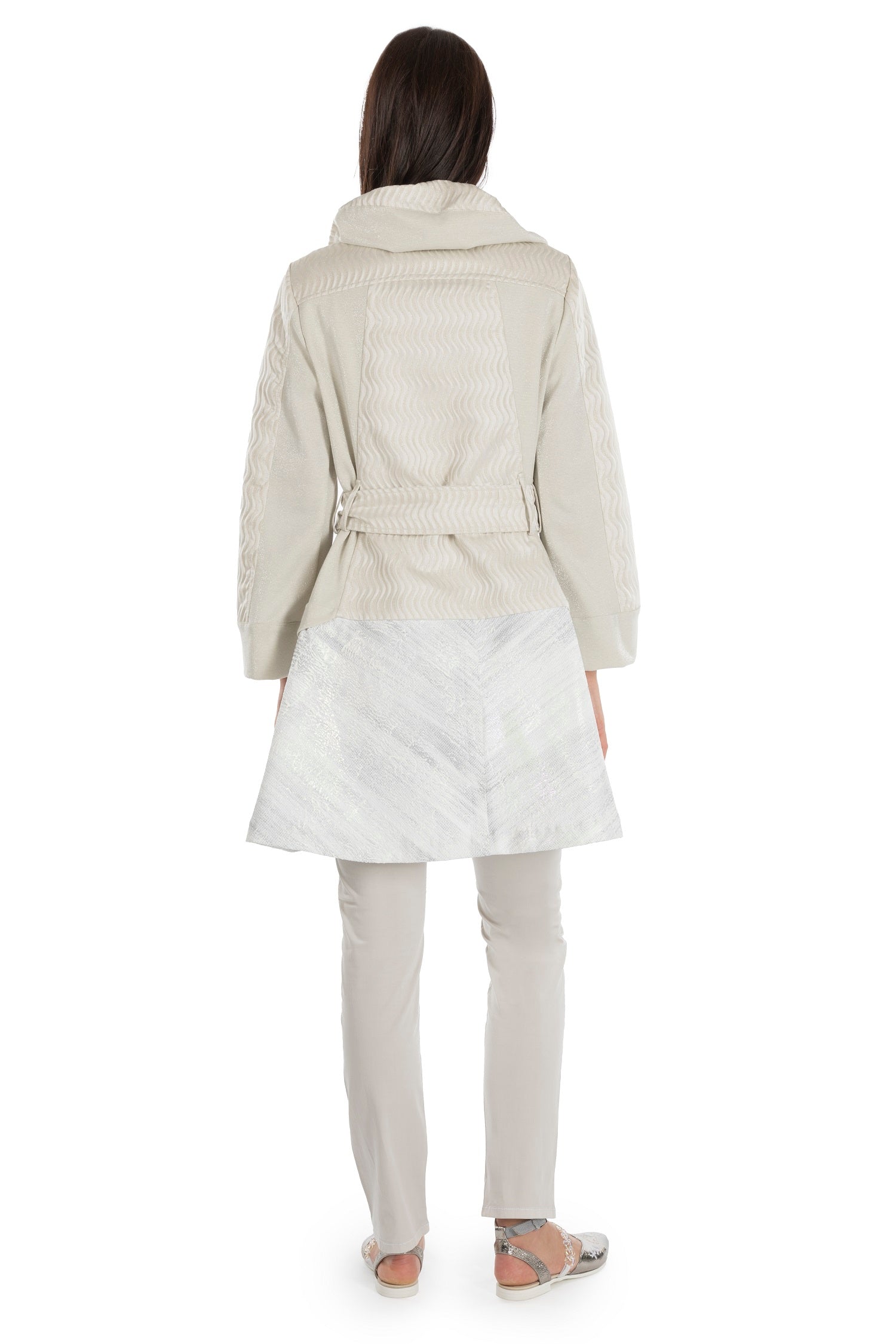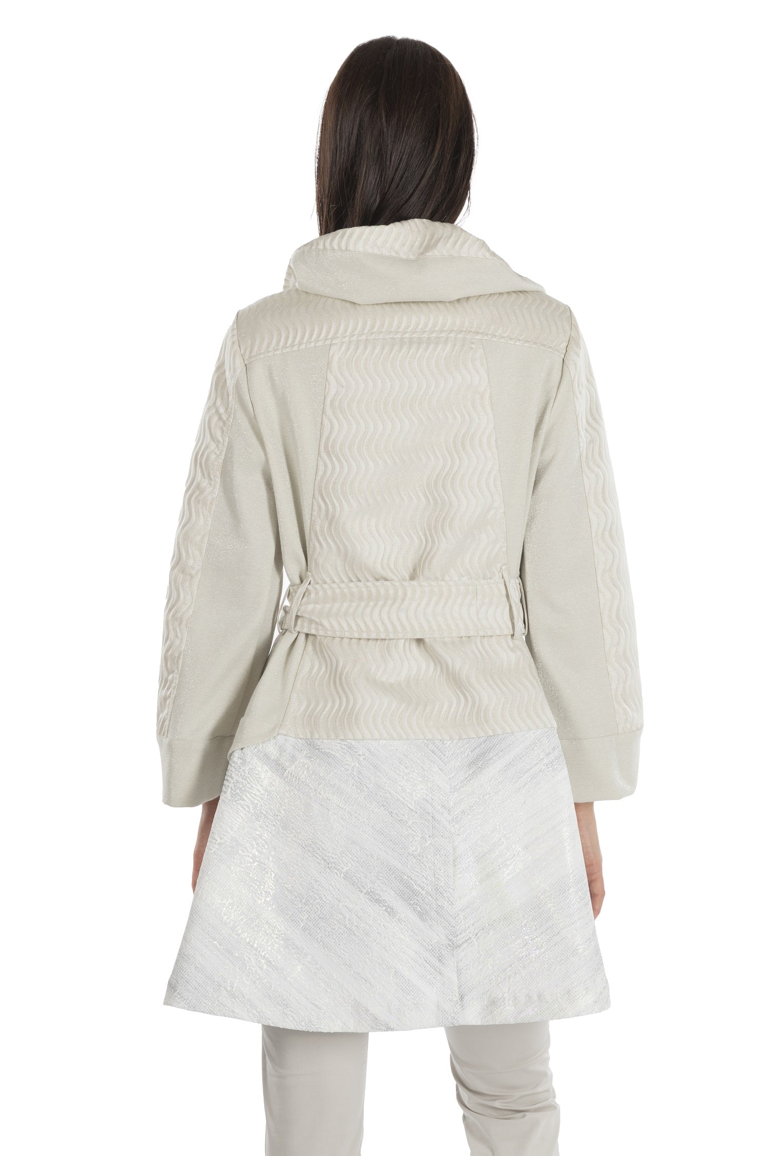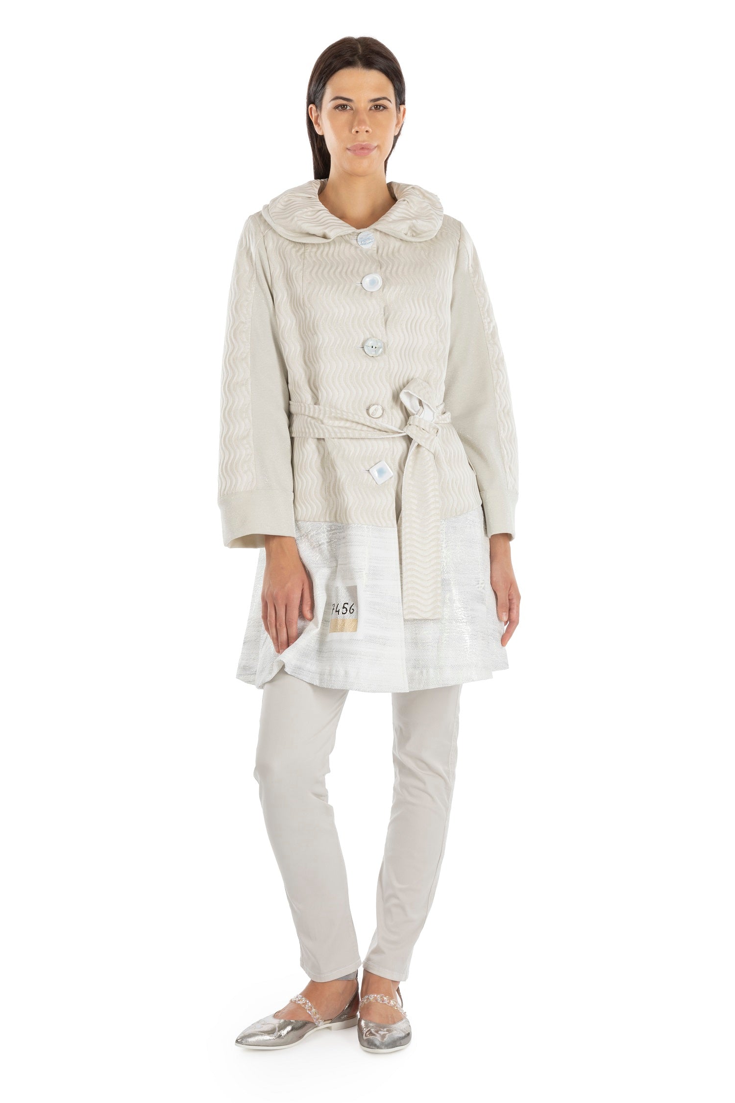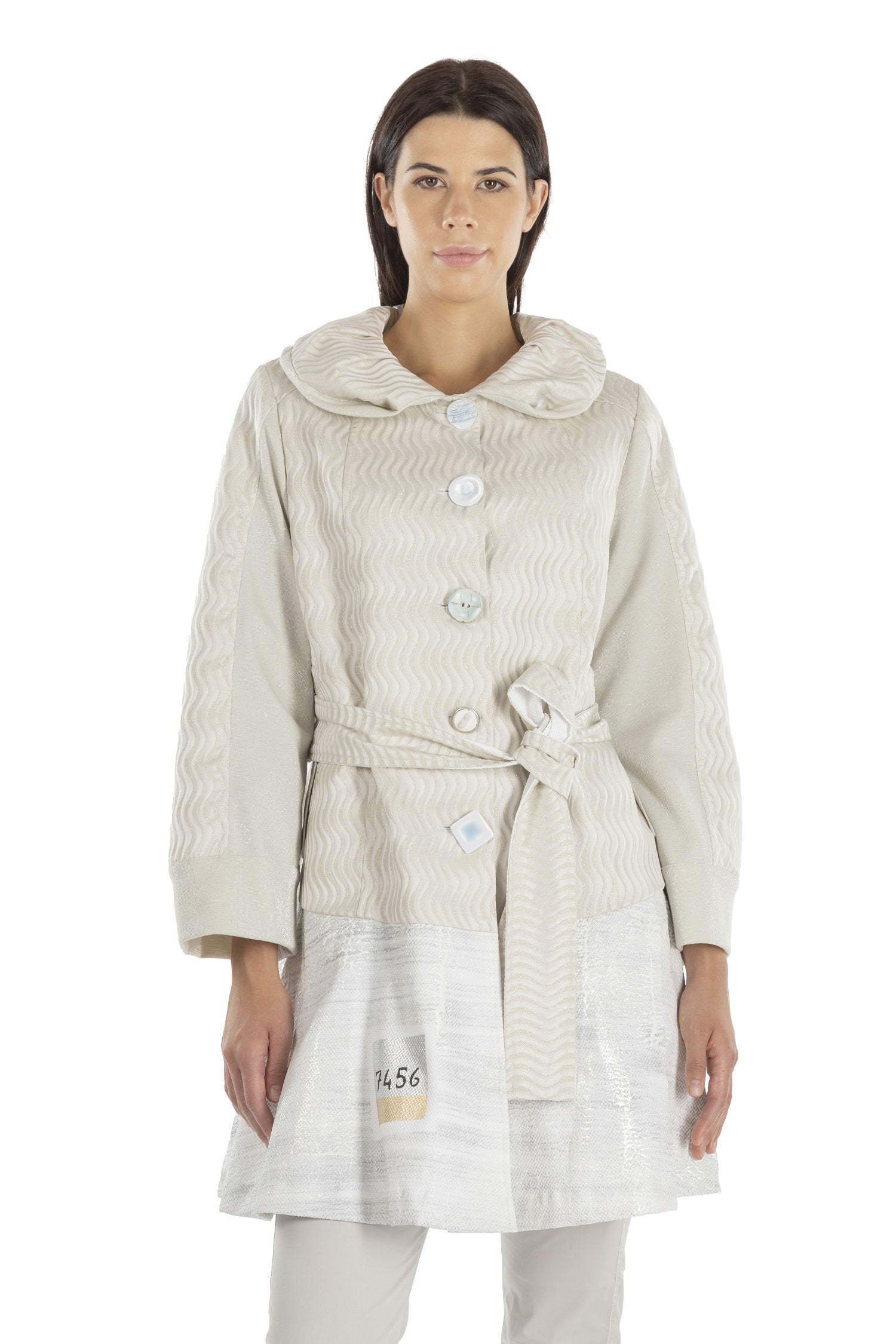 The ELISA CAVALETTI summer coat allows you to be both fashionable and elegant. Its light cream color creates a modern yet classic look. The coat features a variety of buttons, a wide collar, and is beautifully decorated with different colored patterns.