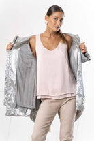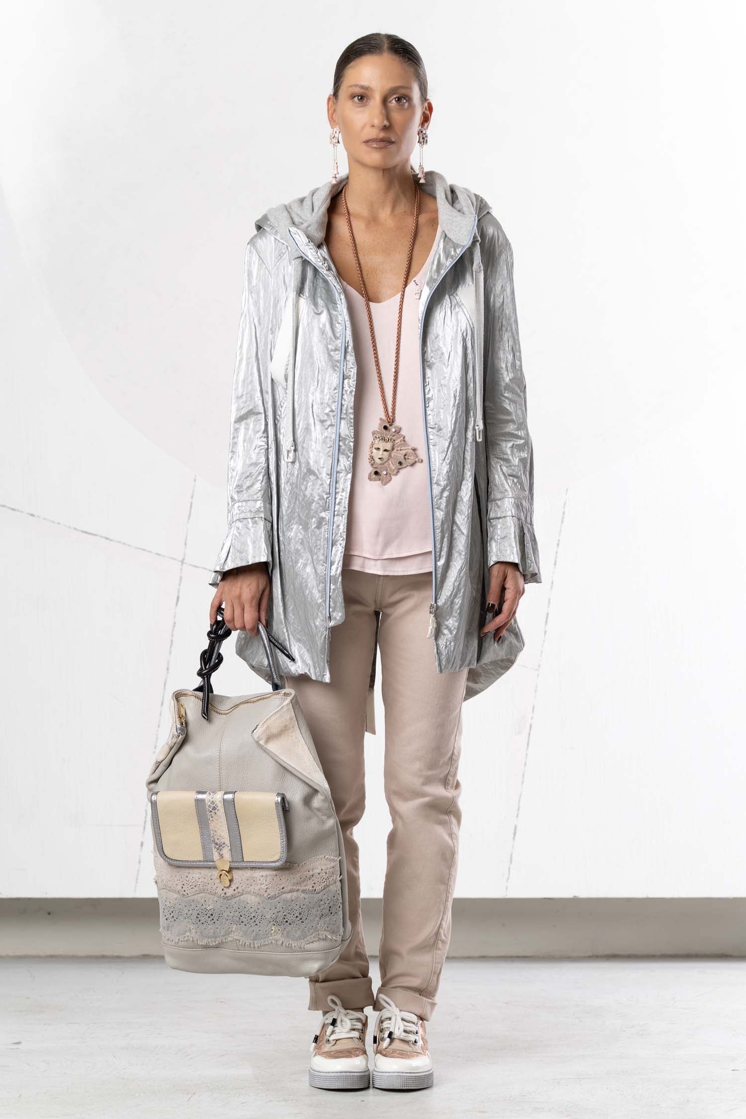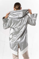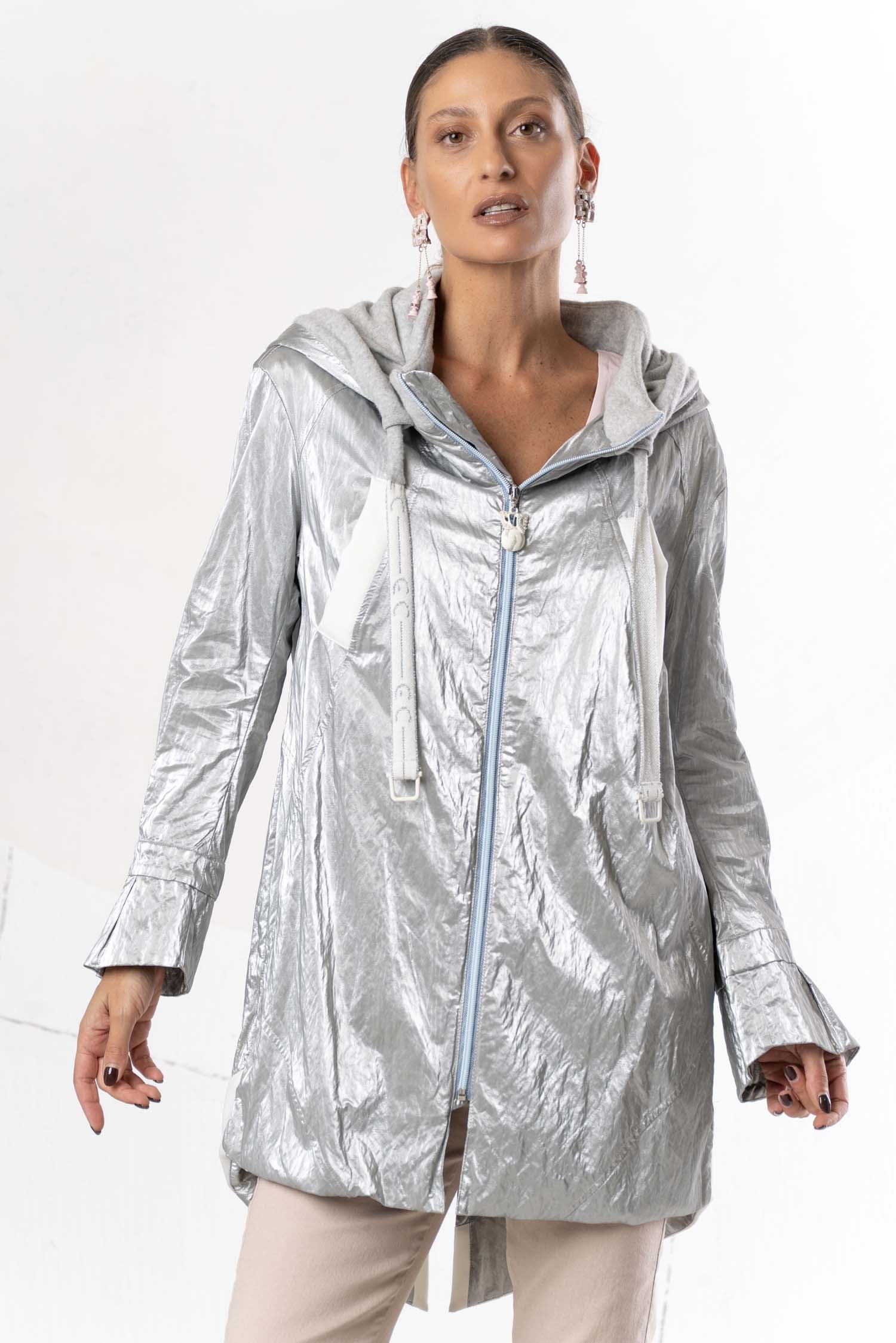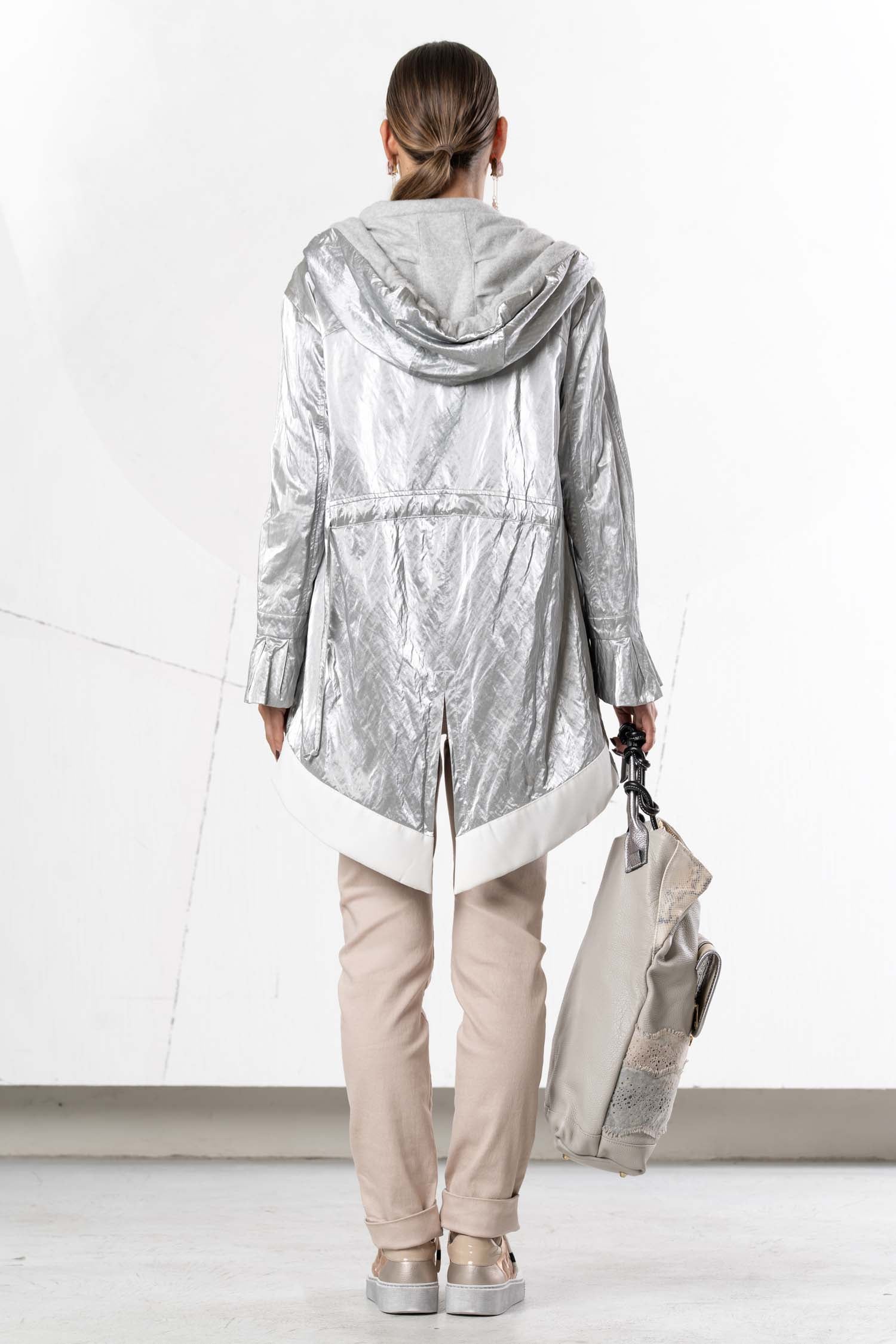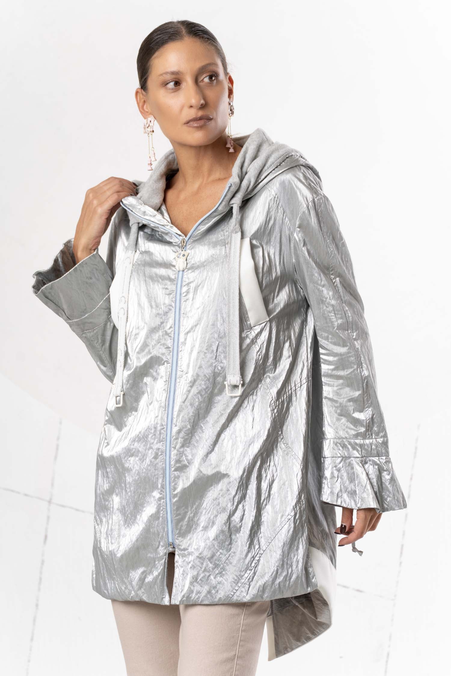 Stylish, silver-colored parka with a gray hood and white appliqués .