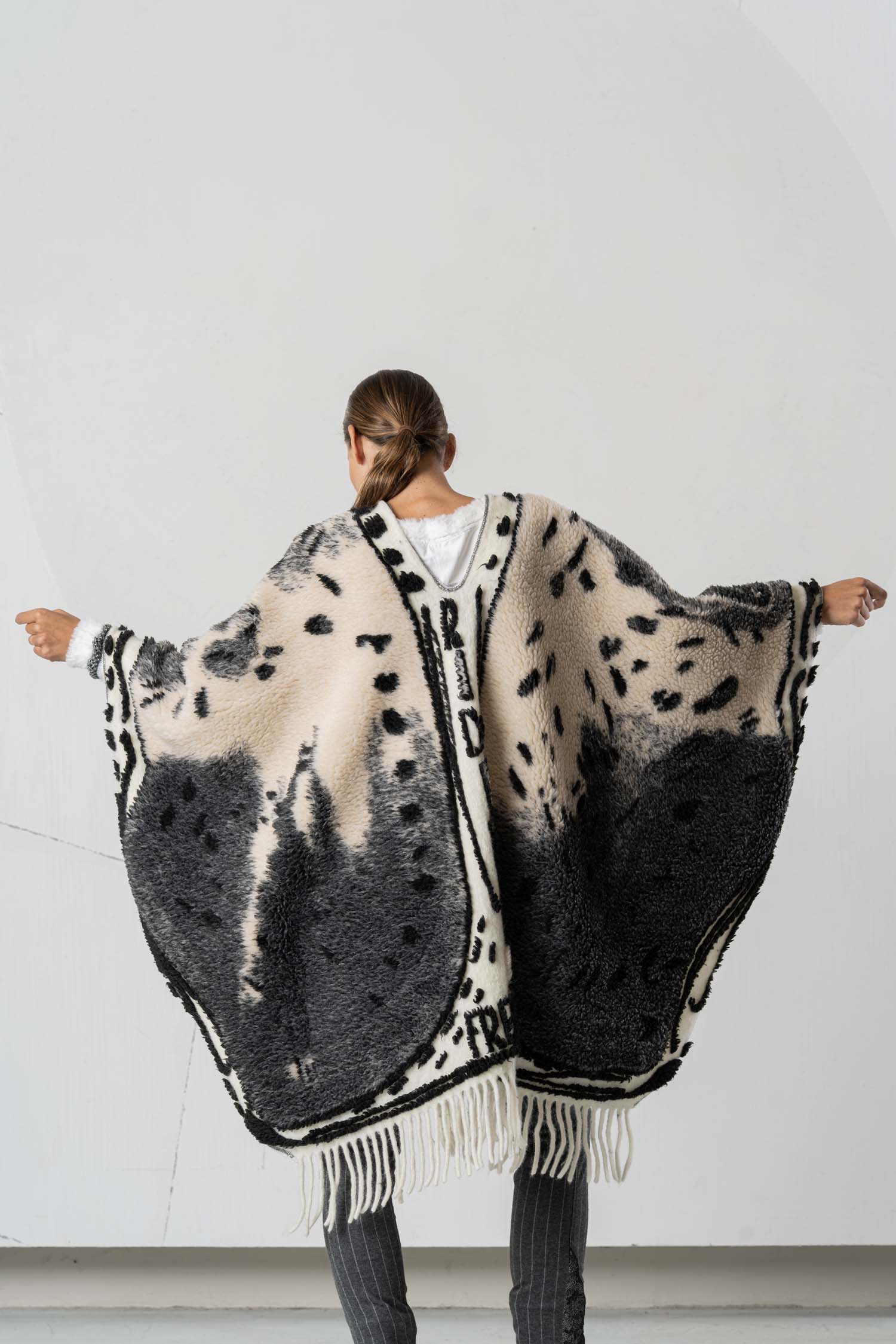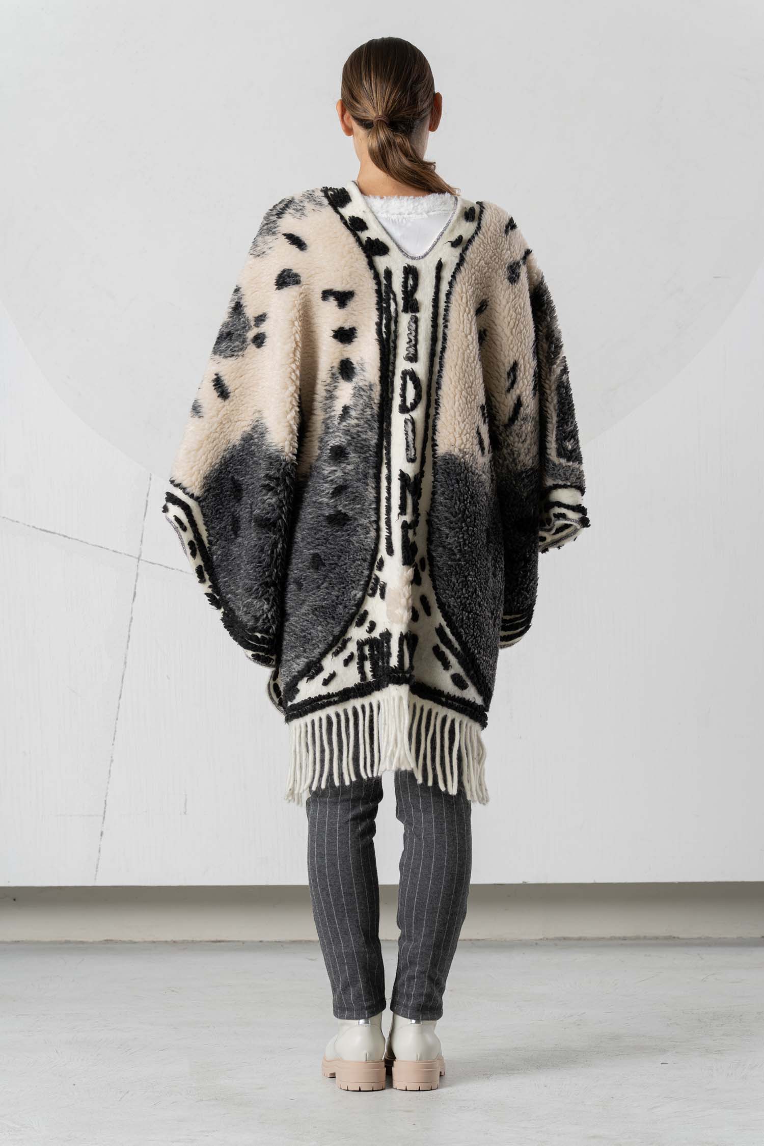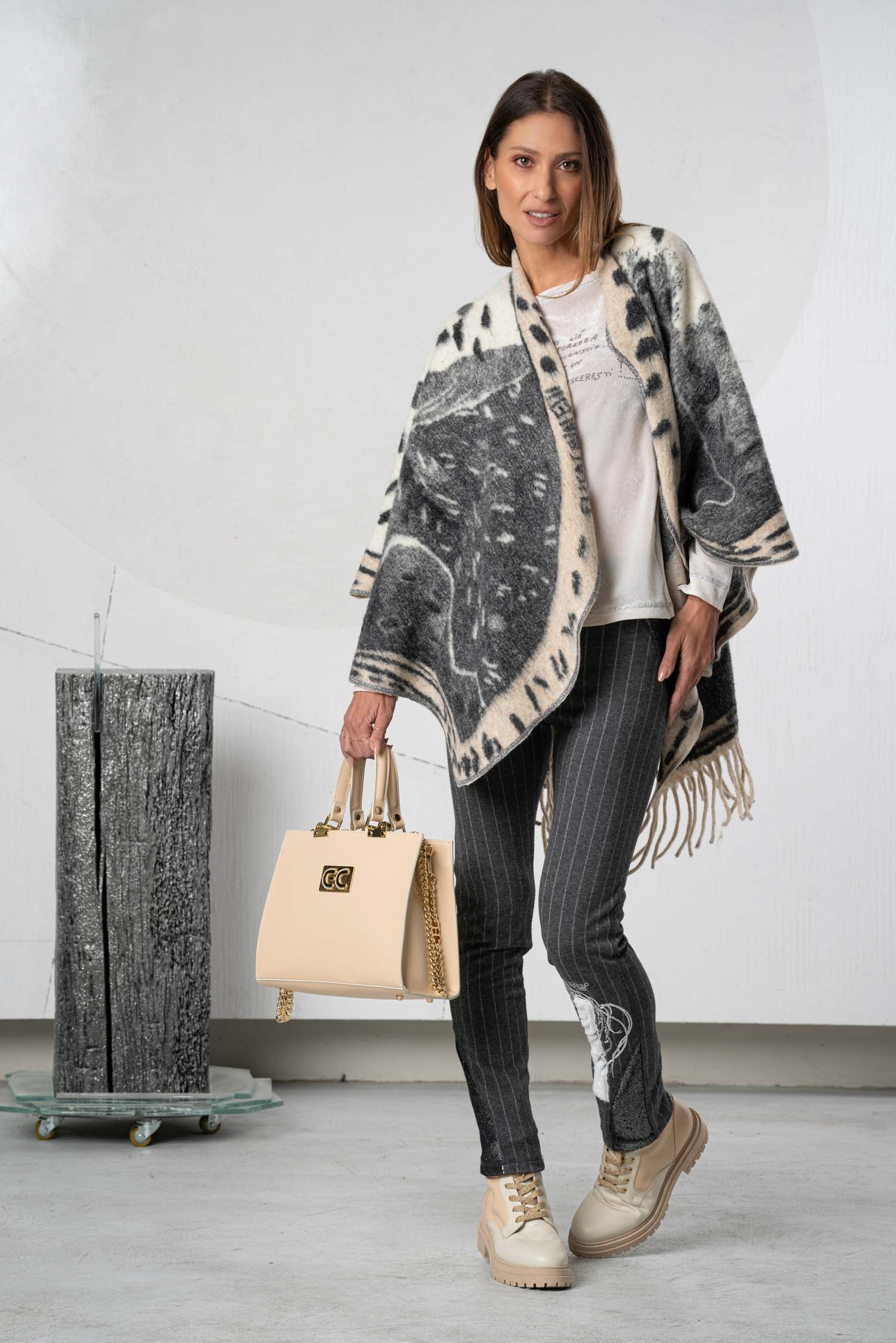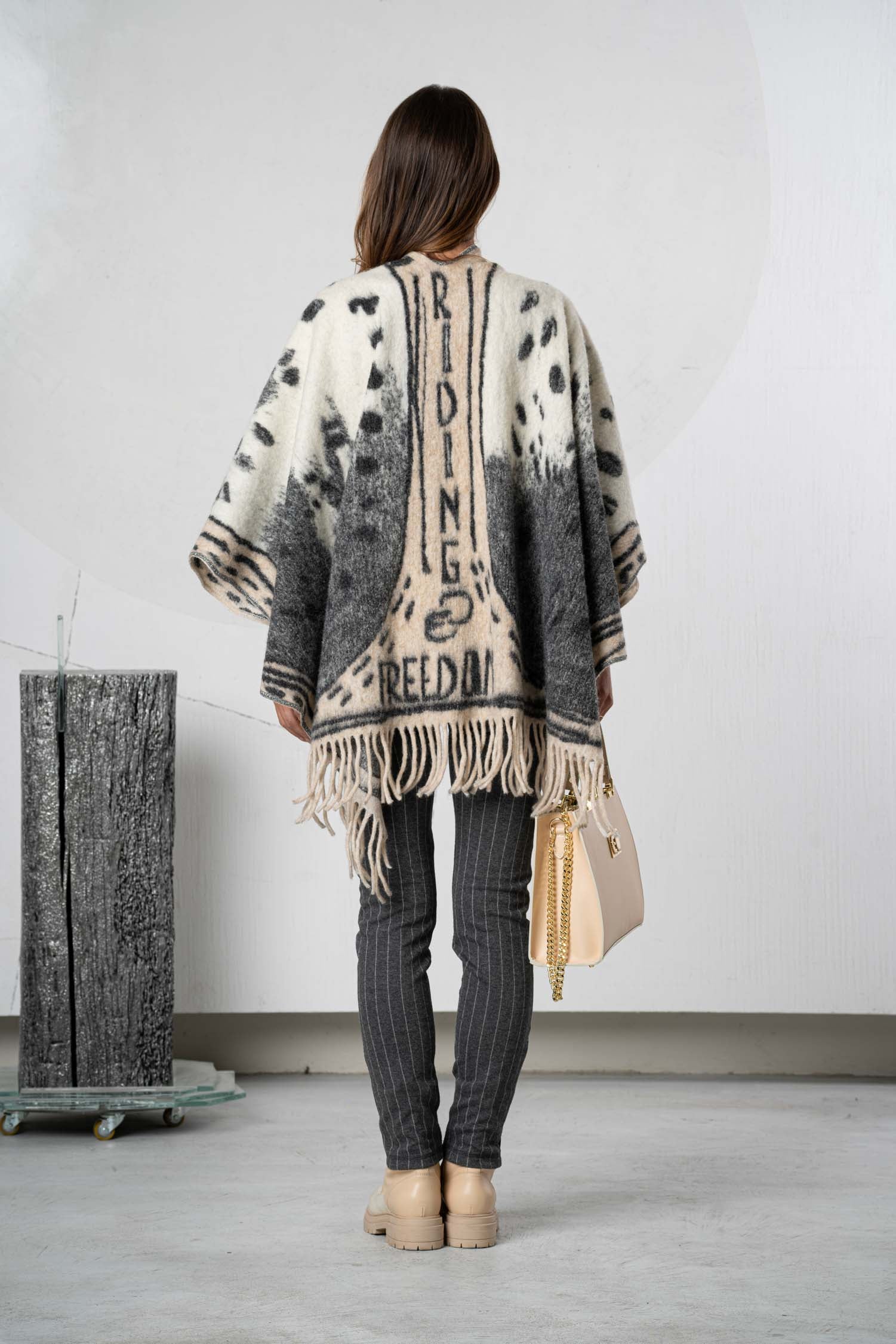 This poncho, crafted from high-quality wool, boasts a harmonious color combination and provides cozy warmth on cooler days. The soft, cuddly material offers exceptional comfort and enhances any outfit with its stylish design. Ideal for fashion-conscious women who appreciate timeless elegance and comfort.