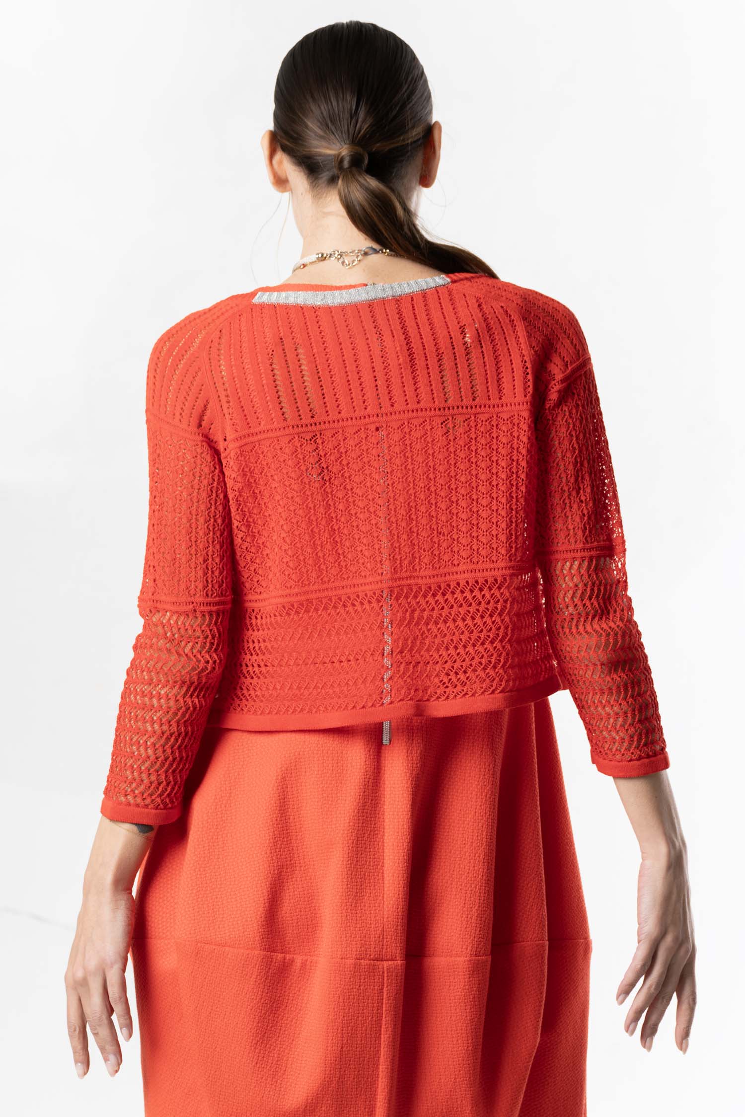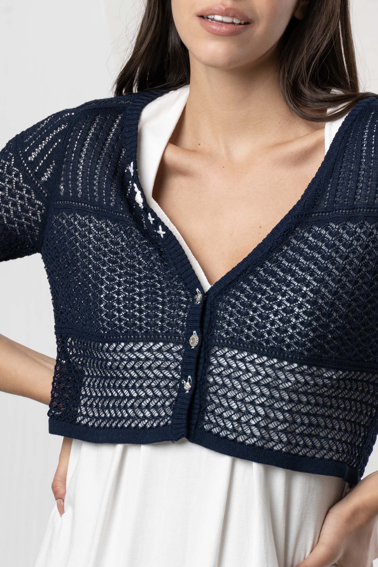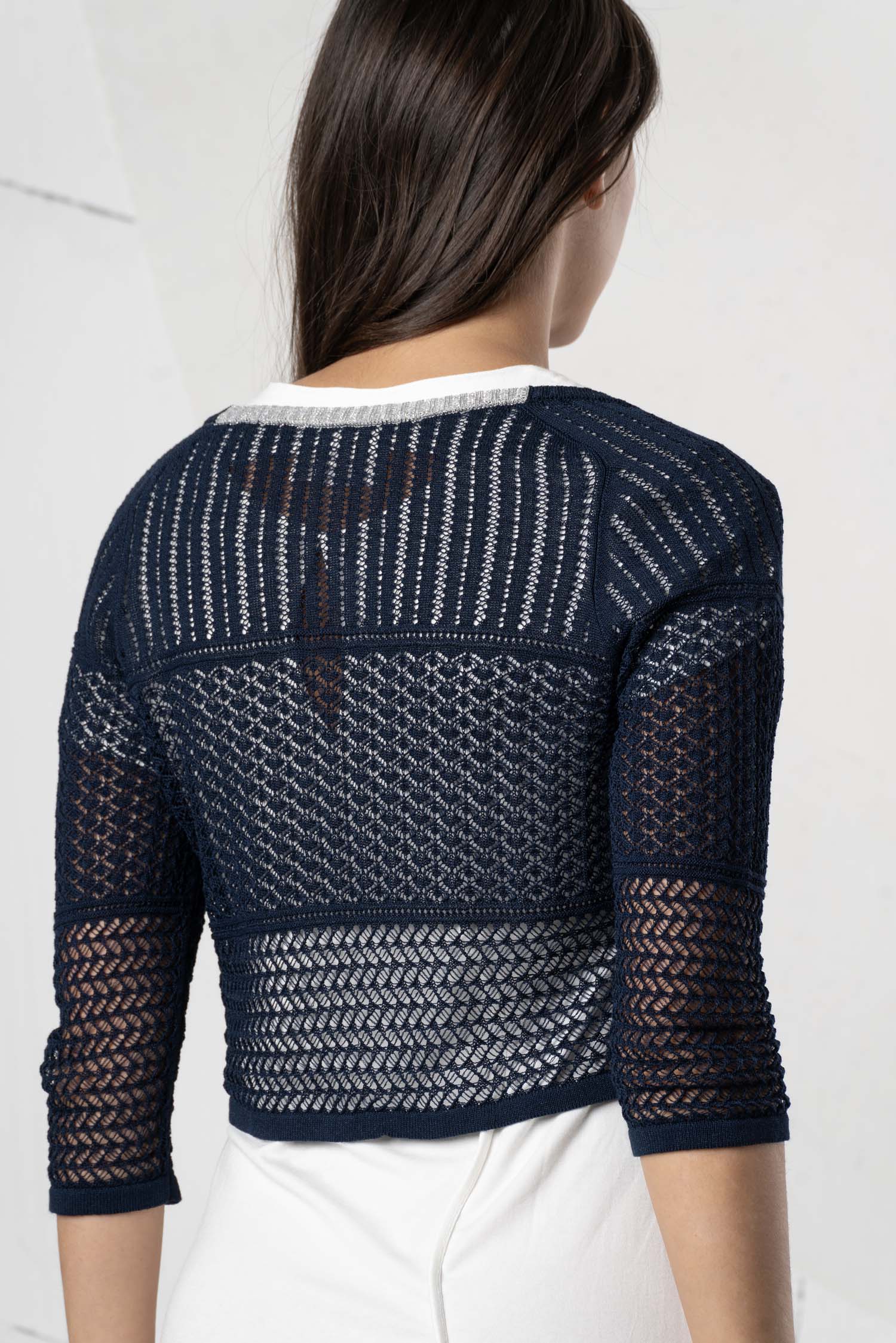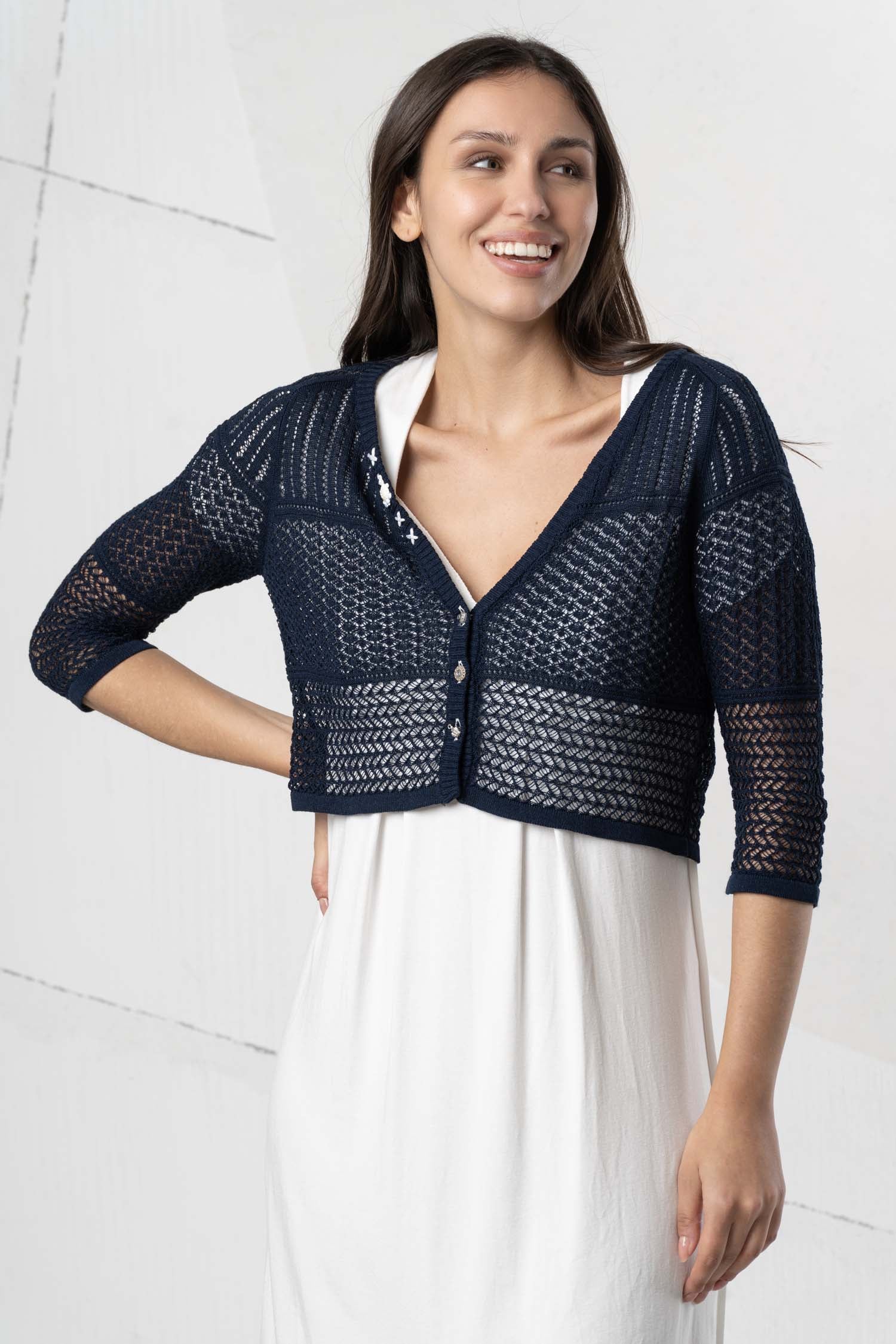 Charming ELISA CAVALETTI cardigan with a delicate openwork pattern in a short cut. Available in vibrant red or elegant dark blue. Perfect for a stylish look with a special charm.