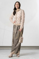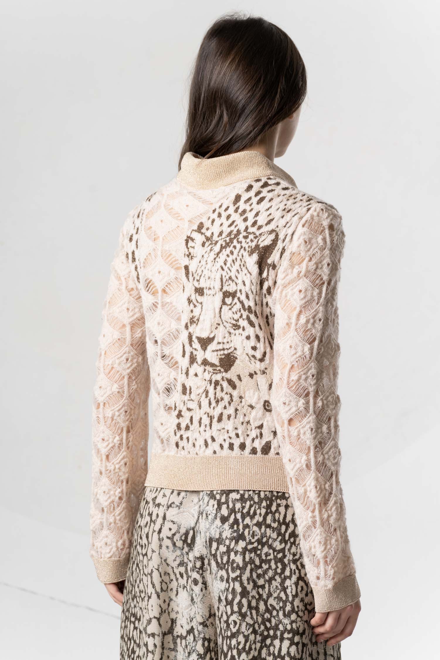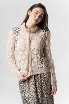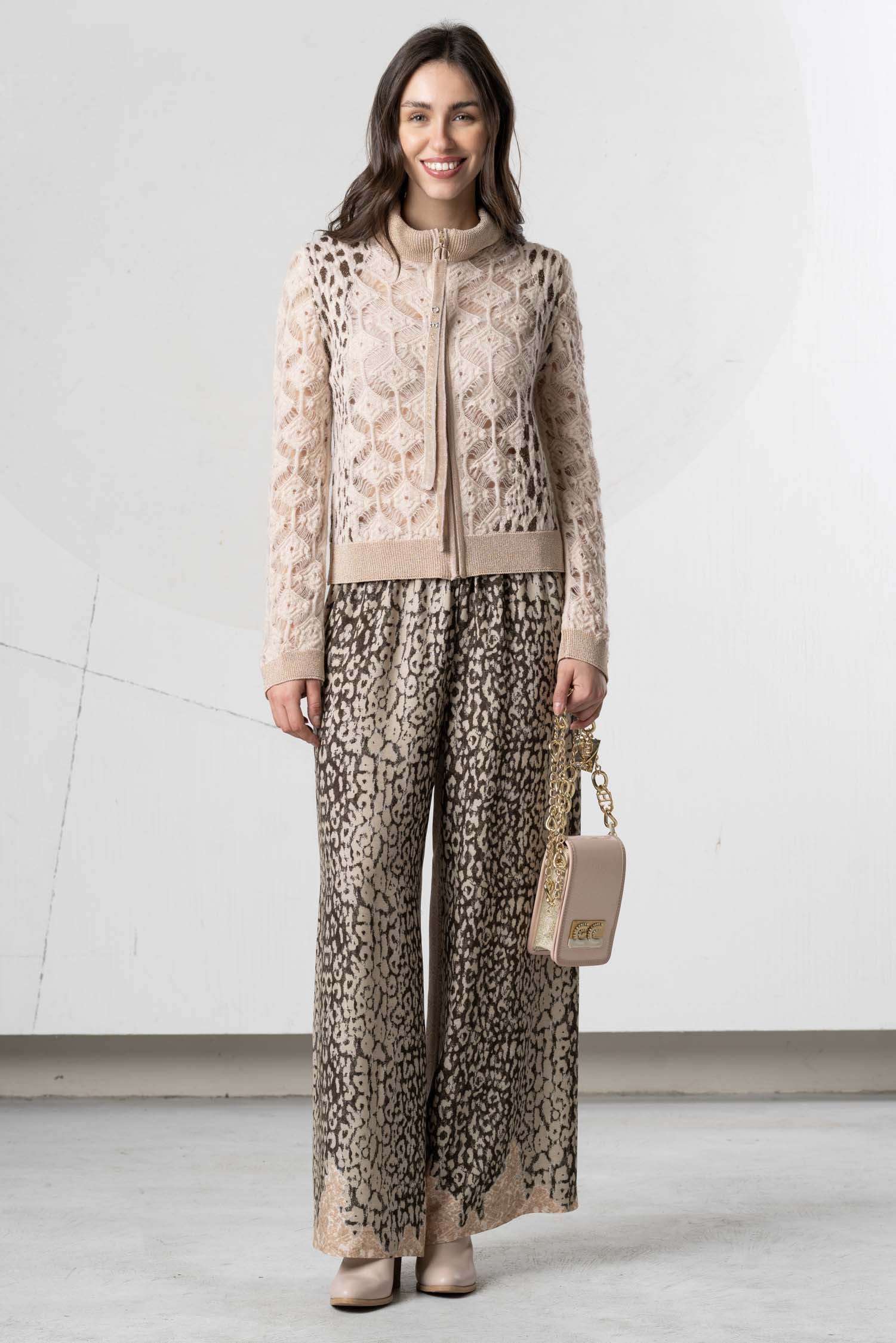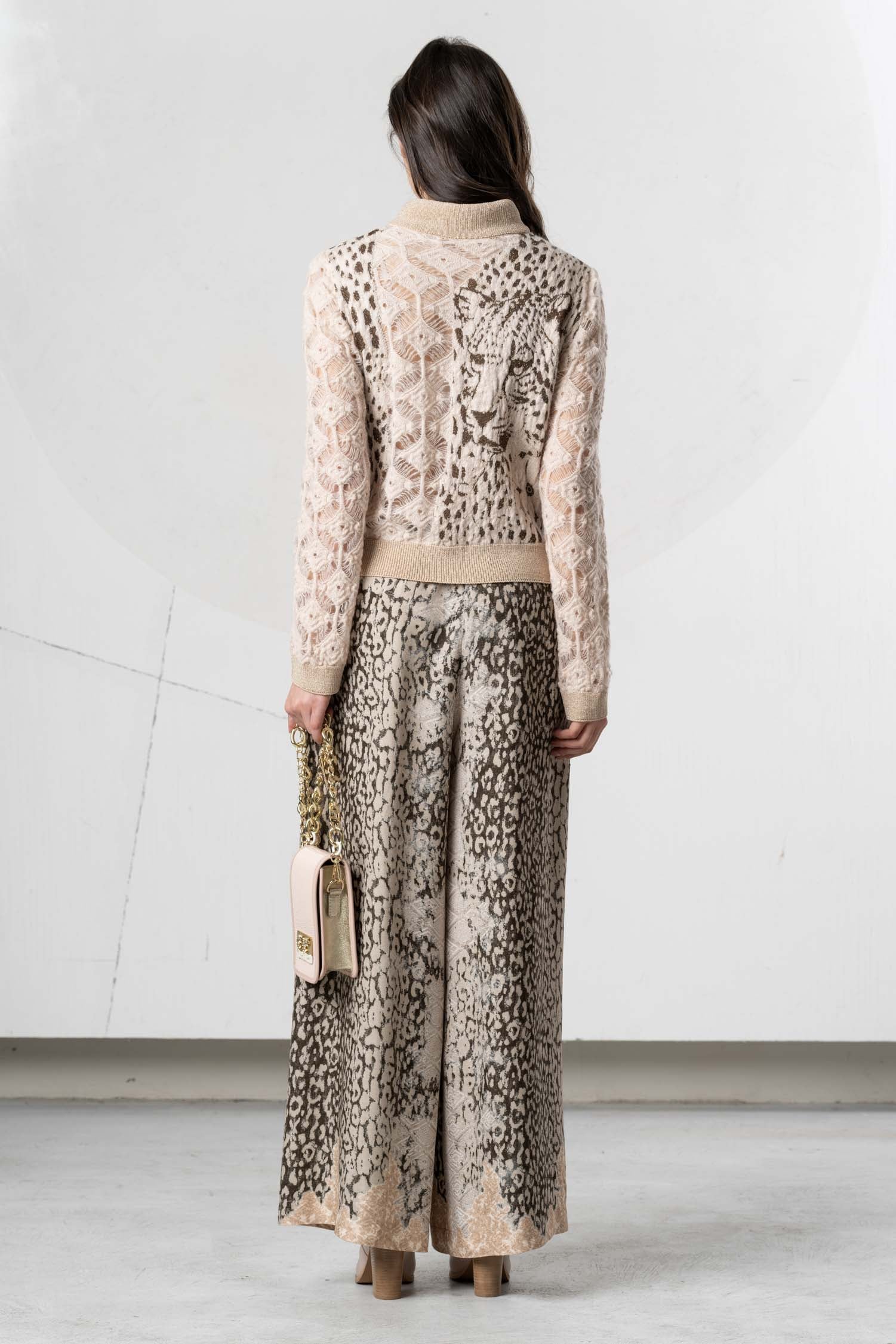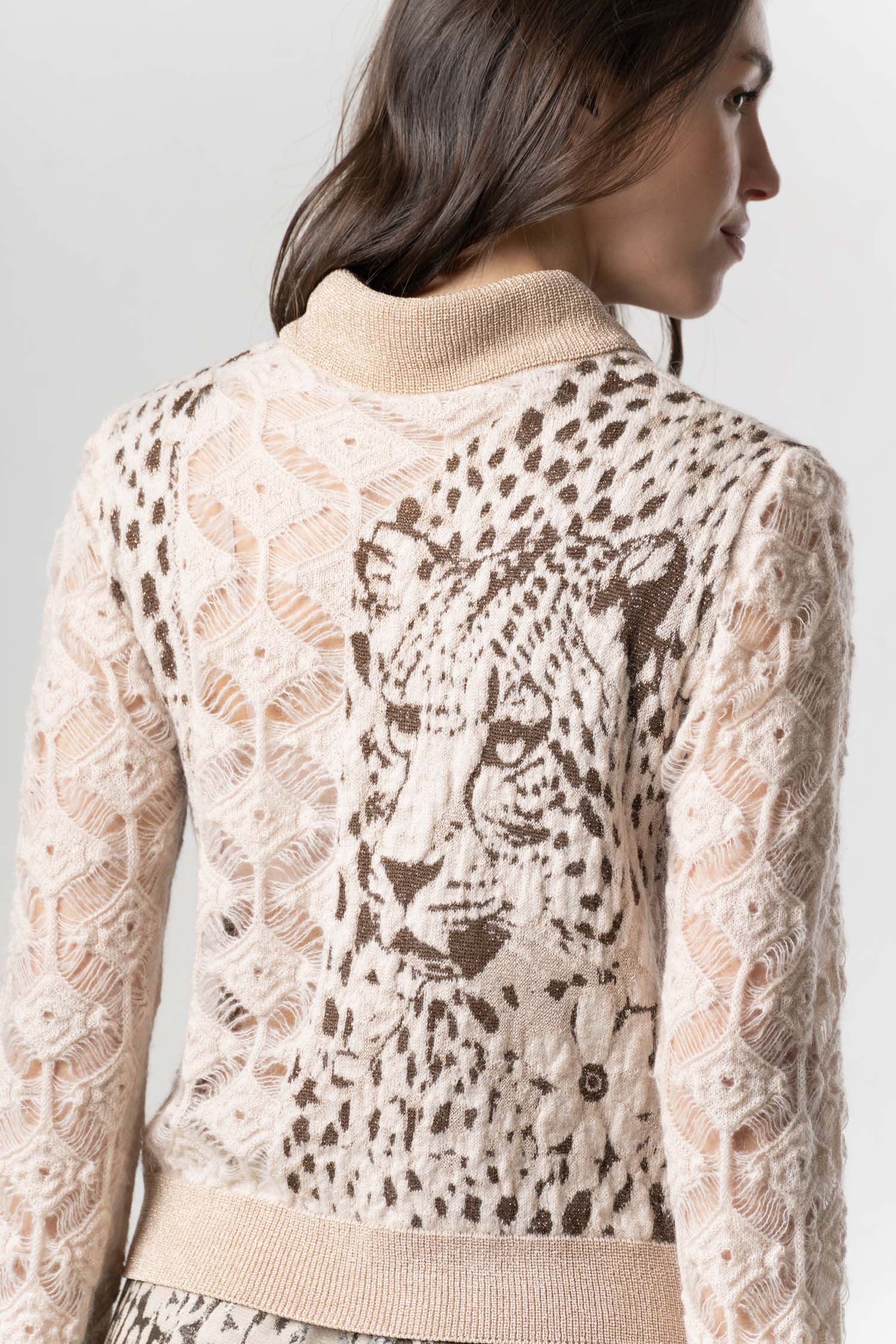 This stylish cardigan in elegant beige features a delicate openwork pattern that creates a sophisticated texture. The striking leopard print on the back gives the garment a distinctive character and makes a fashionable statement. Thanks to its high-quality craftsmanship, the cardigan offers exceptional comfort and is ideal for versatile styling during the transitional seasons.