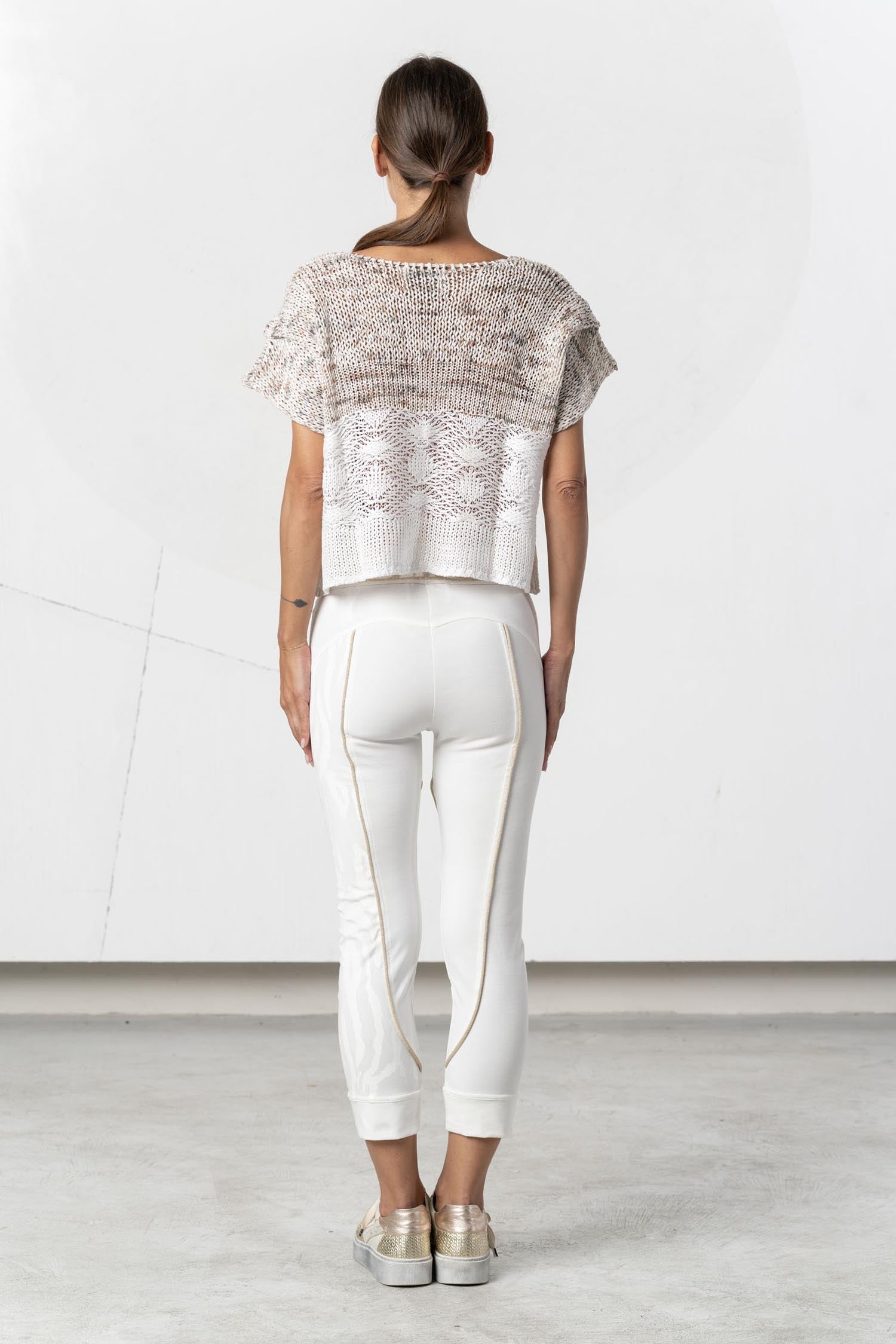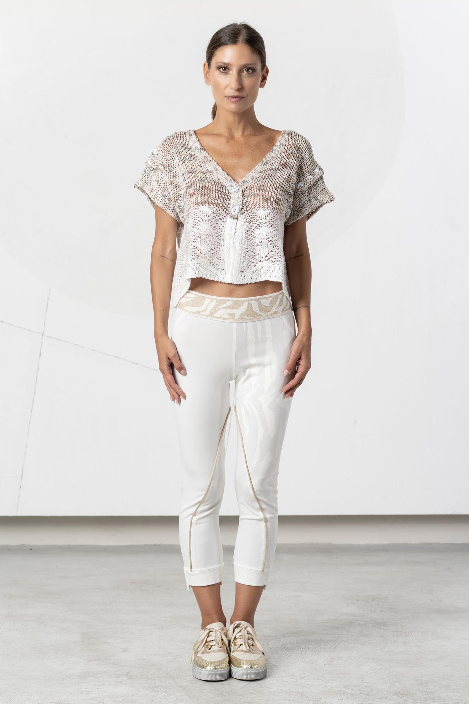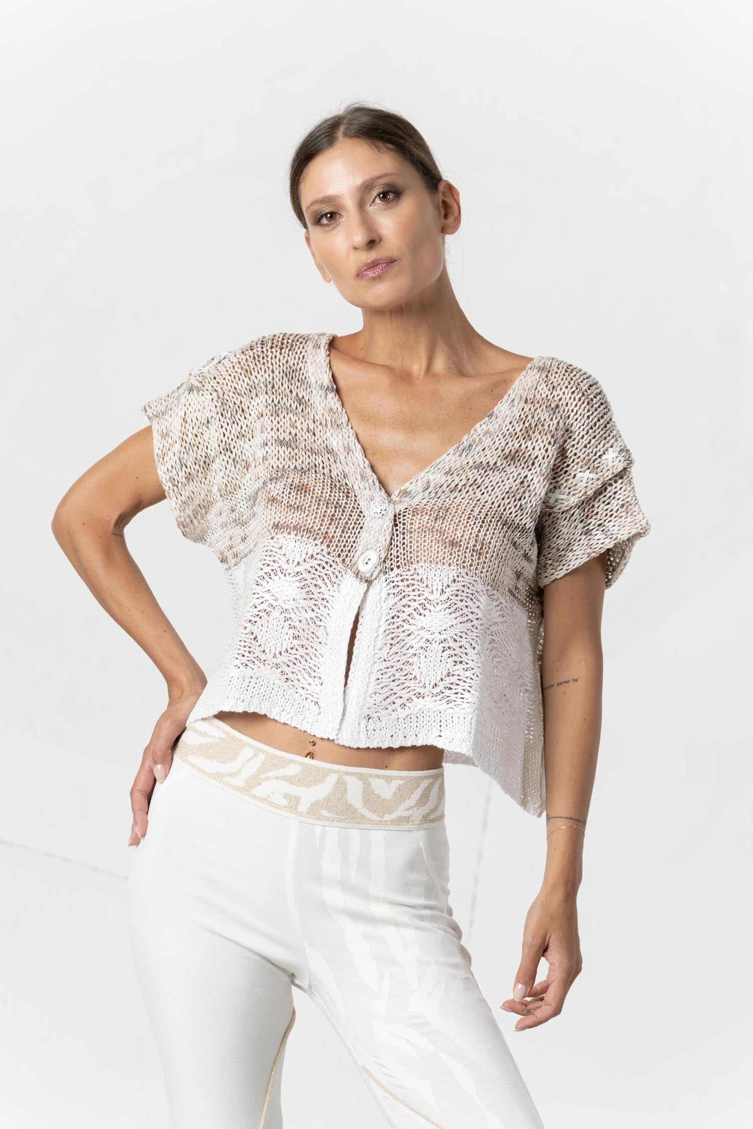 This short-sleeved cardigan from ELISA CAVALETTI is an elegant must-have for any occasion. The combination of white and beige gives the cardigan a timeless and sophisticated look. Perfect for the transitional seasons, it offers warmth and style in one. An essential piece for every wardrobe!