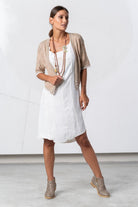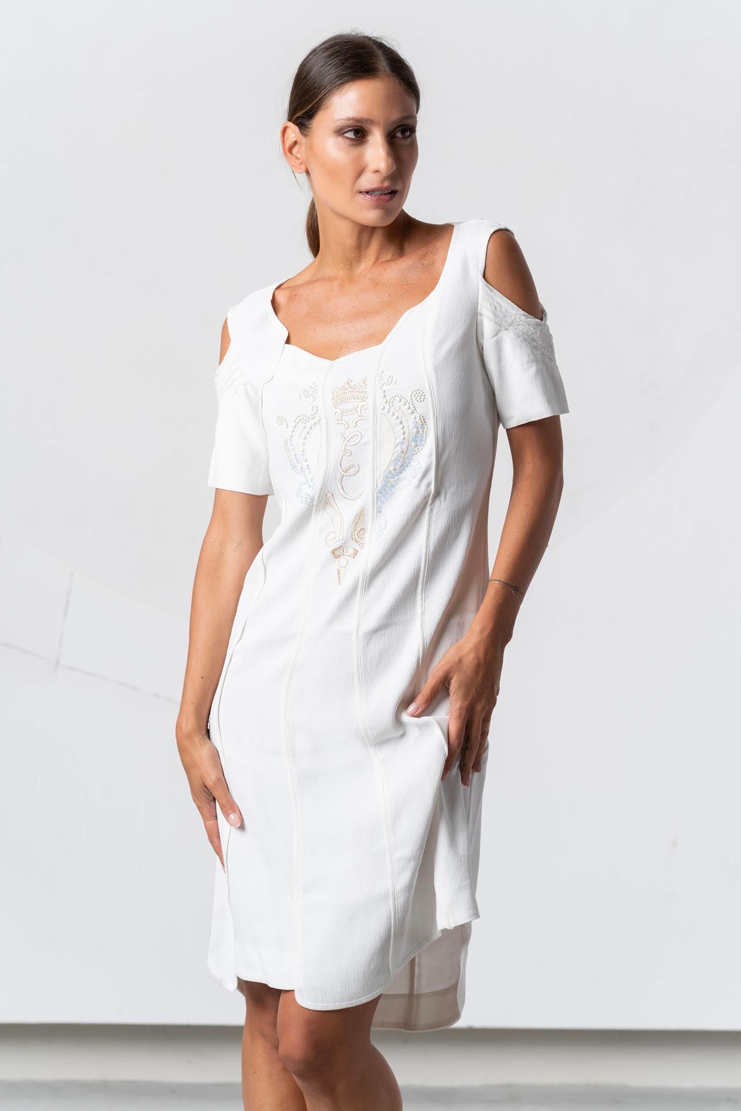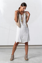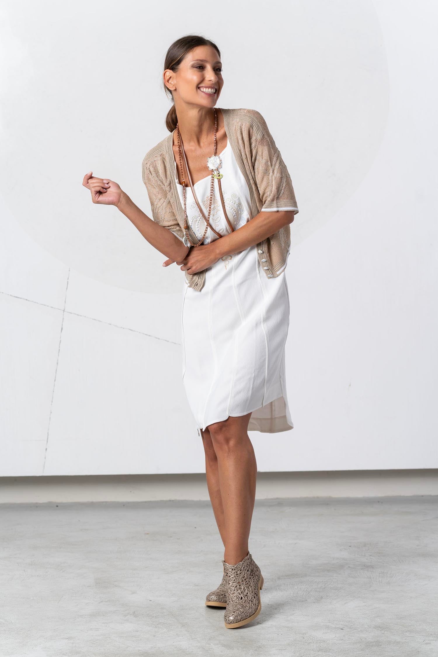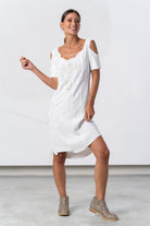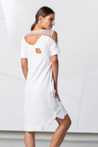 This knee-length white dress impresses with its stylish and summery look. The short sleeves ensure a comfortable feel and make the dress an ideal companion on warm days. The timeless design combines elegance with comfort and can be combined in many ways.