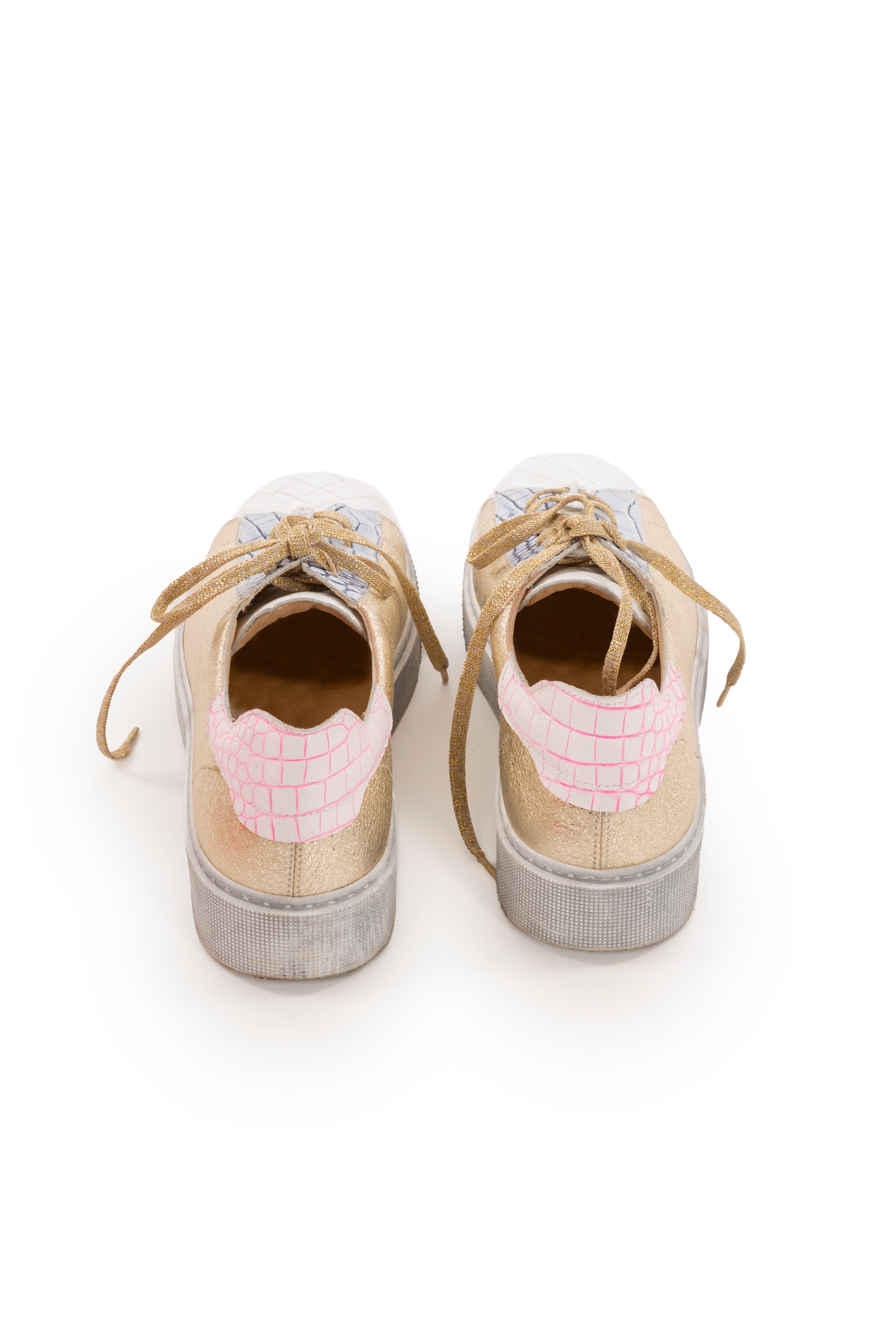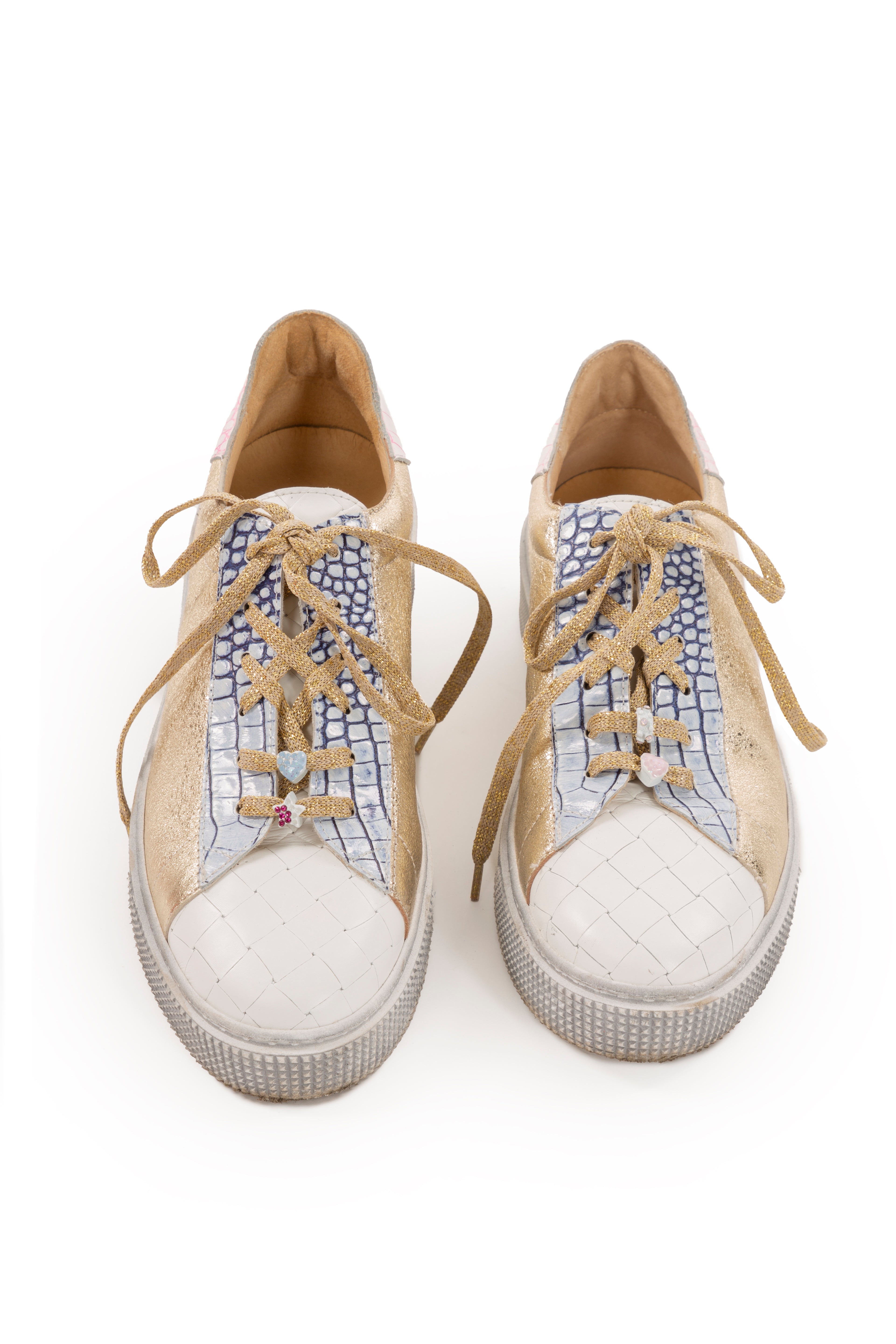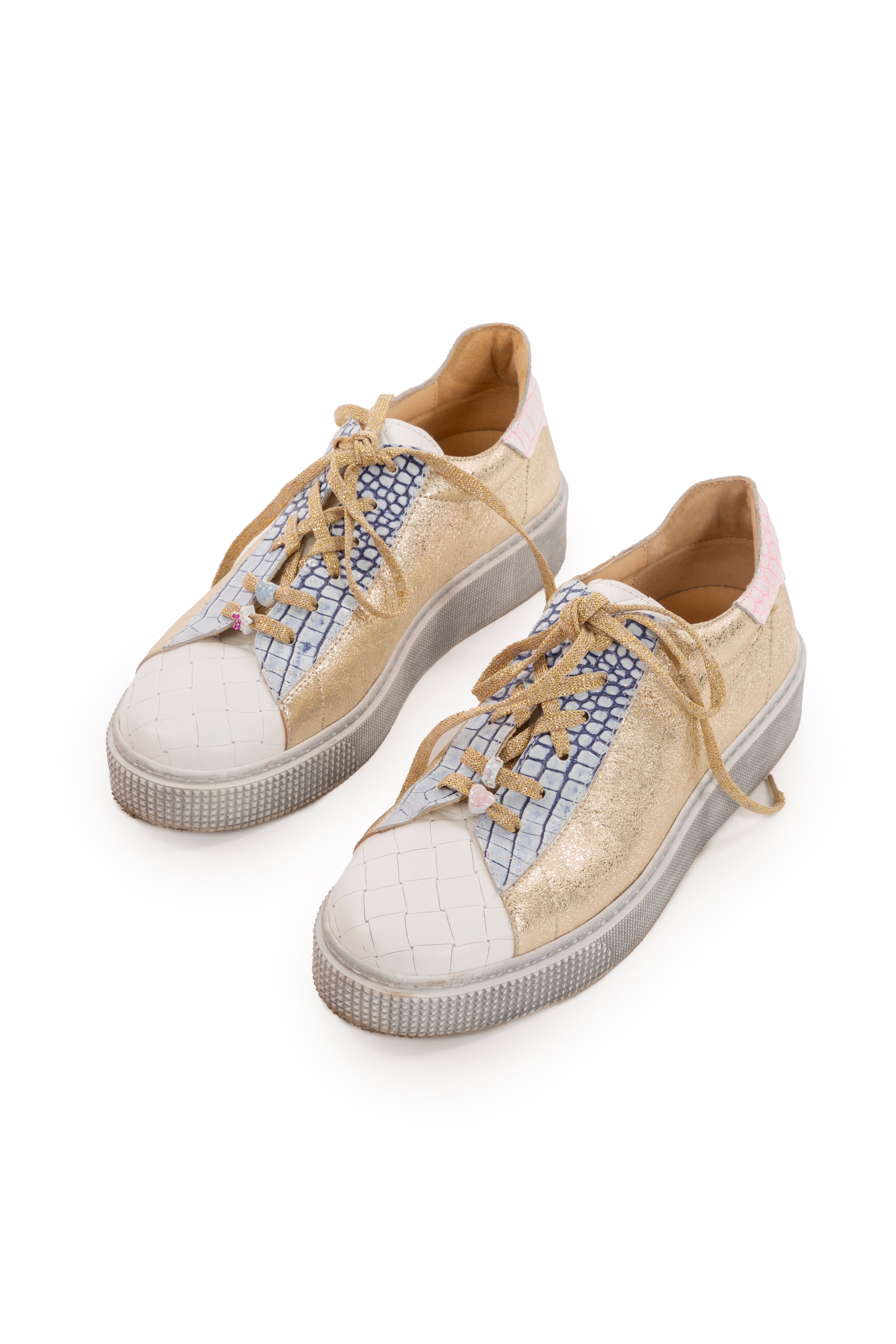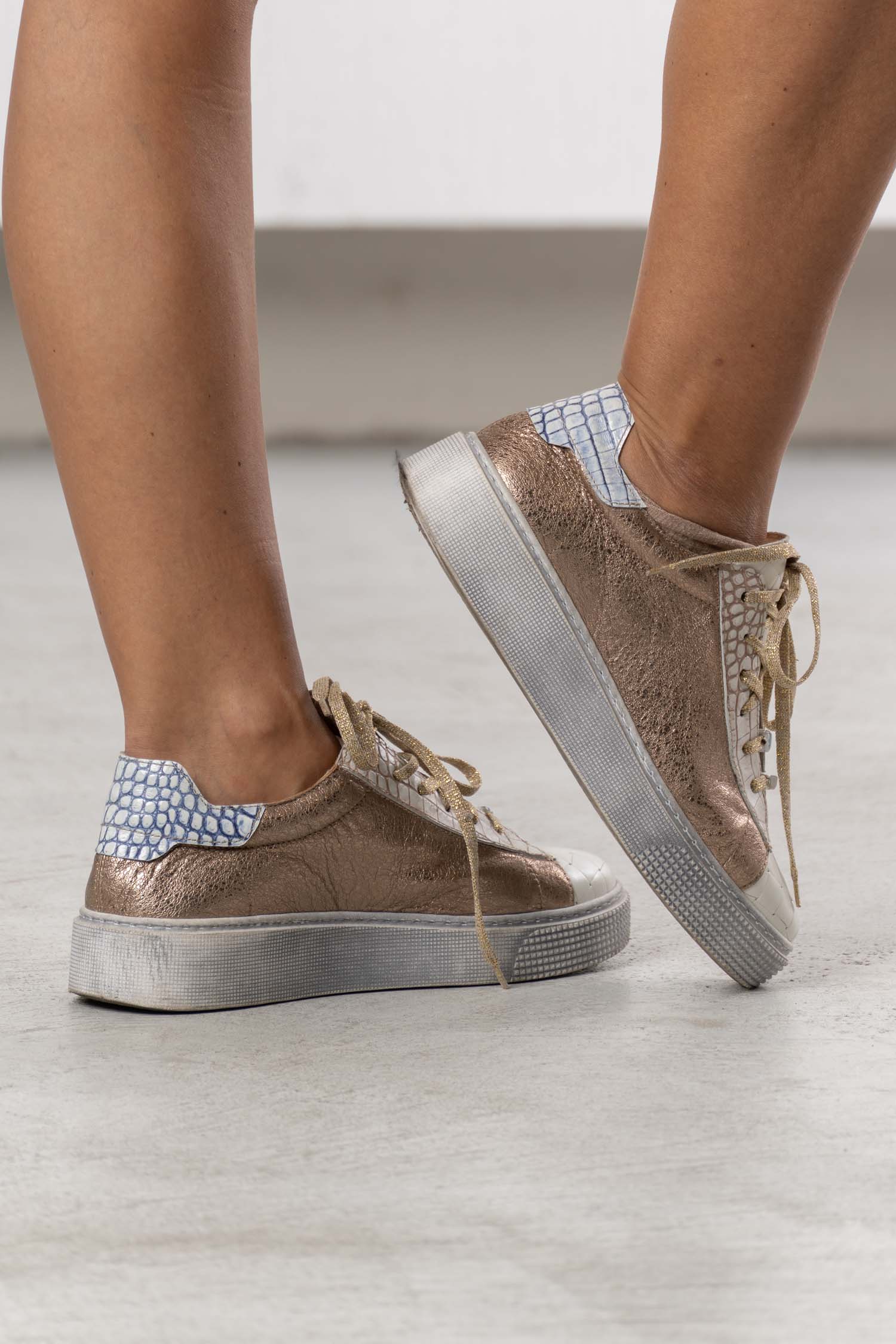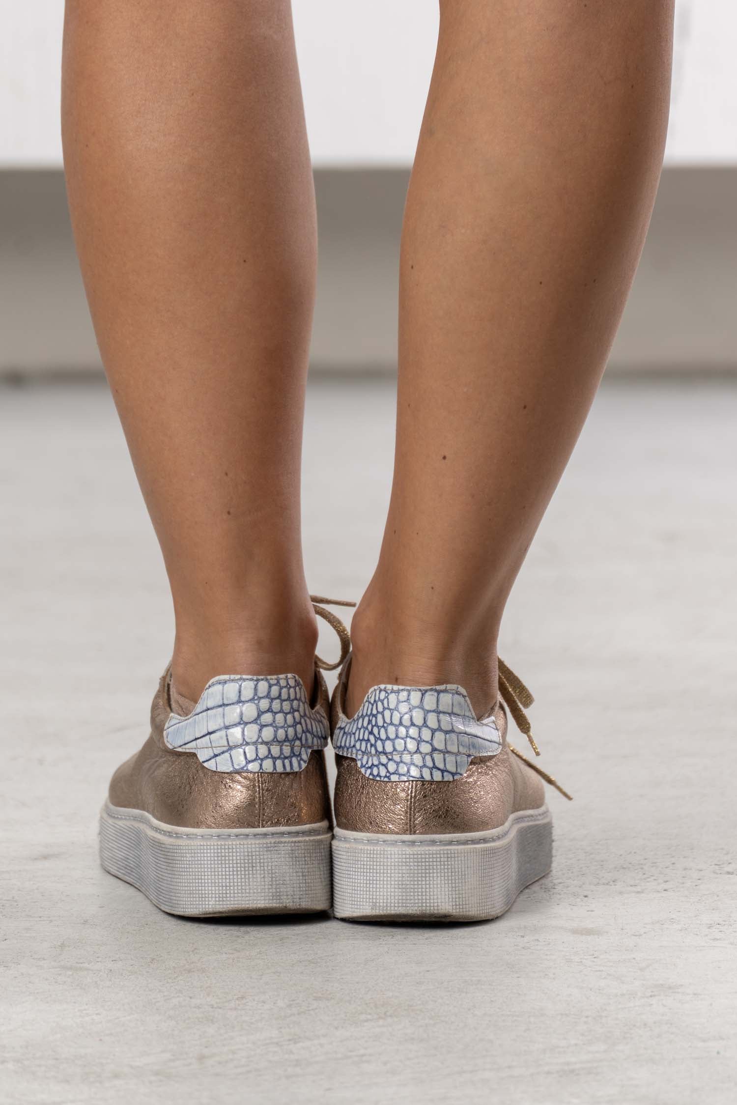 The ELISA CAVALETTI sneakers are a luxurious shoe with an extravagant look. They are made of soft, copper-colored leather, finished with light blue accents. The gold laces complete the elegant design.